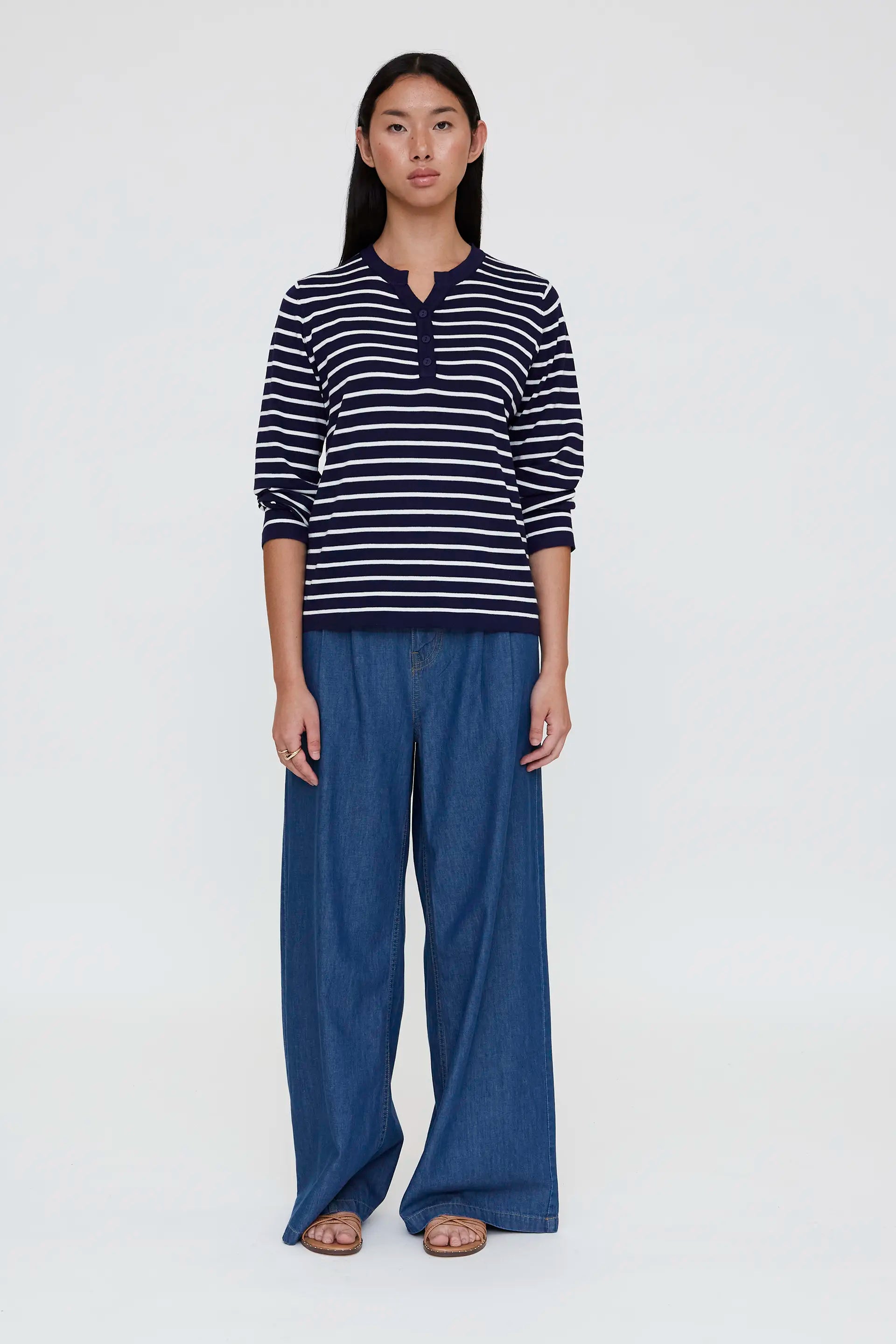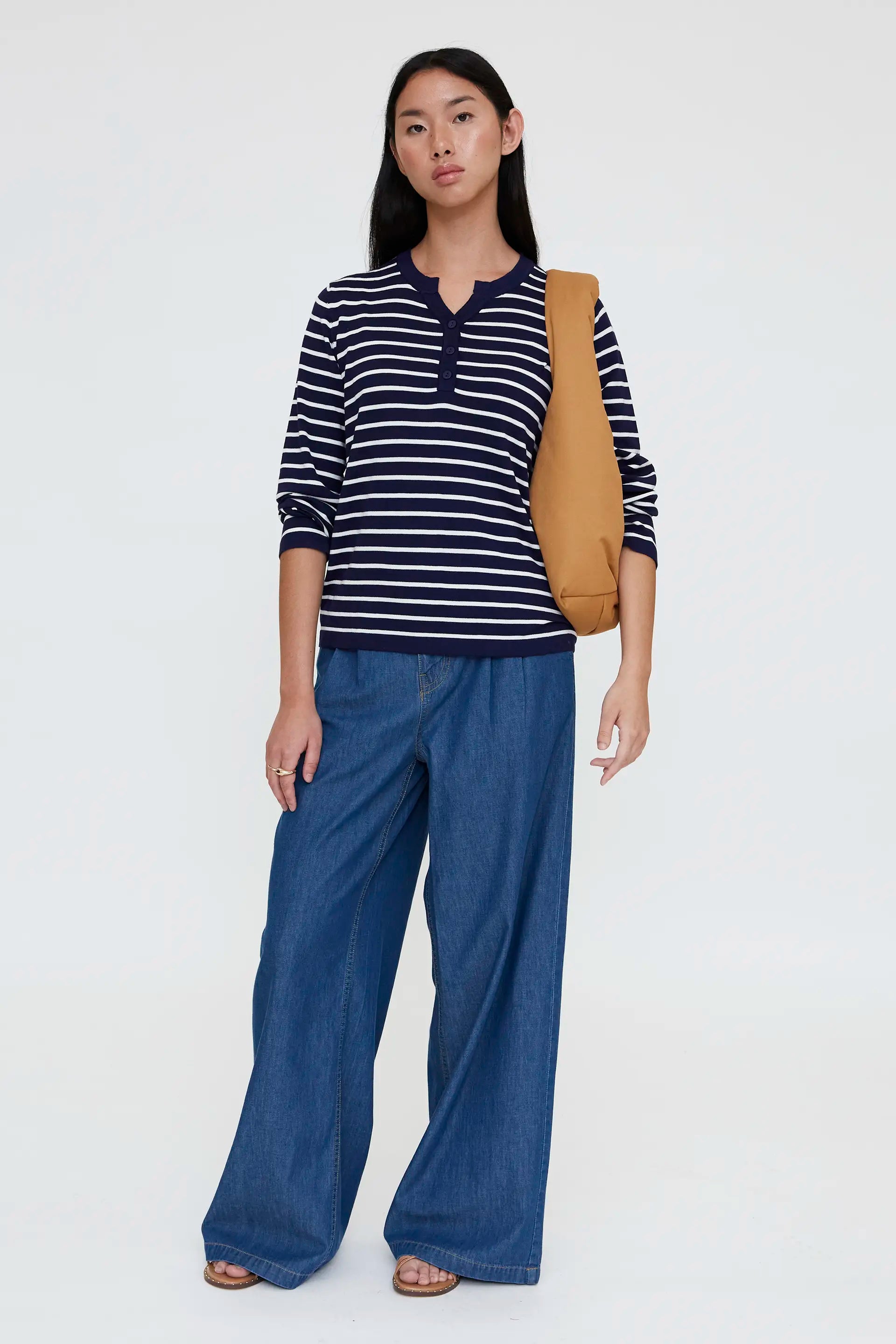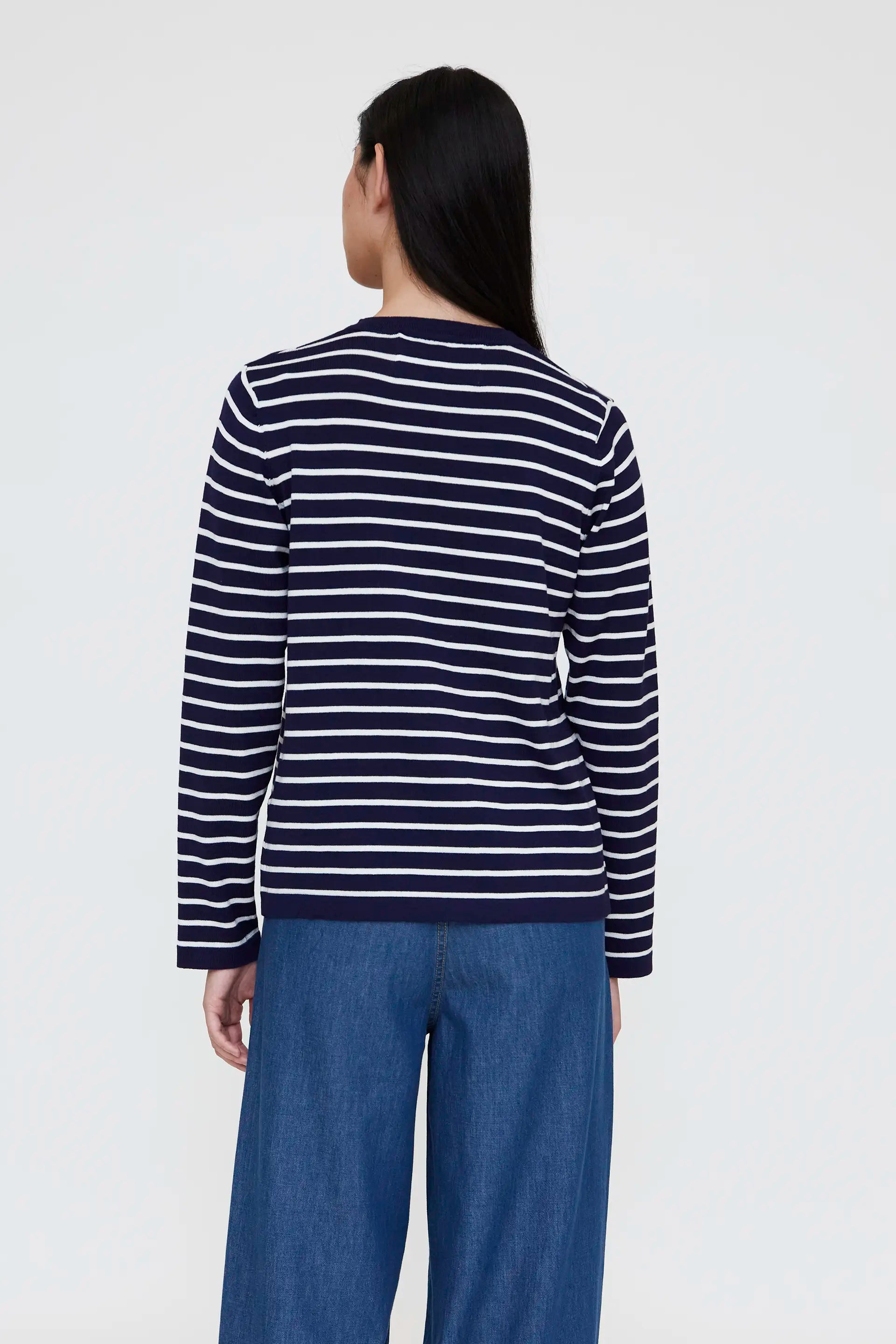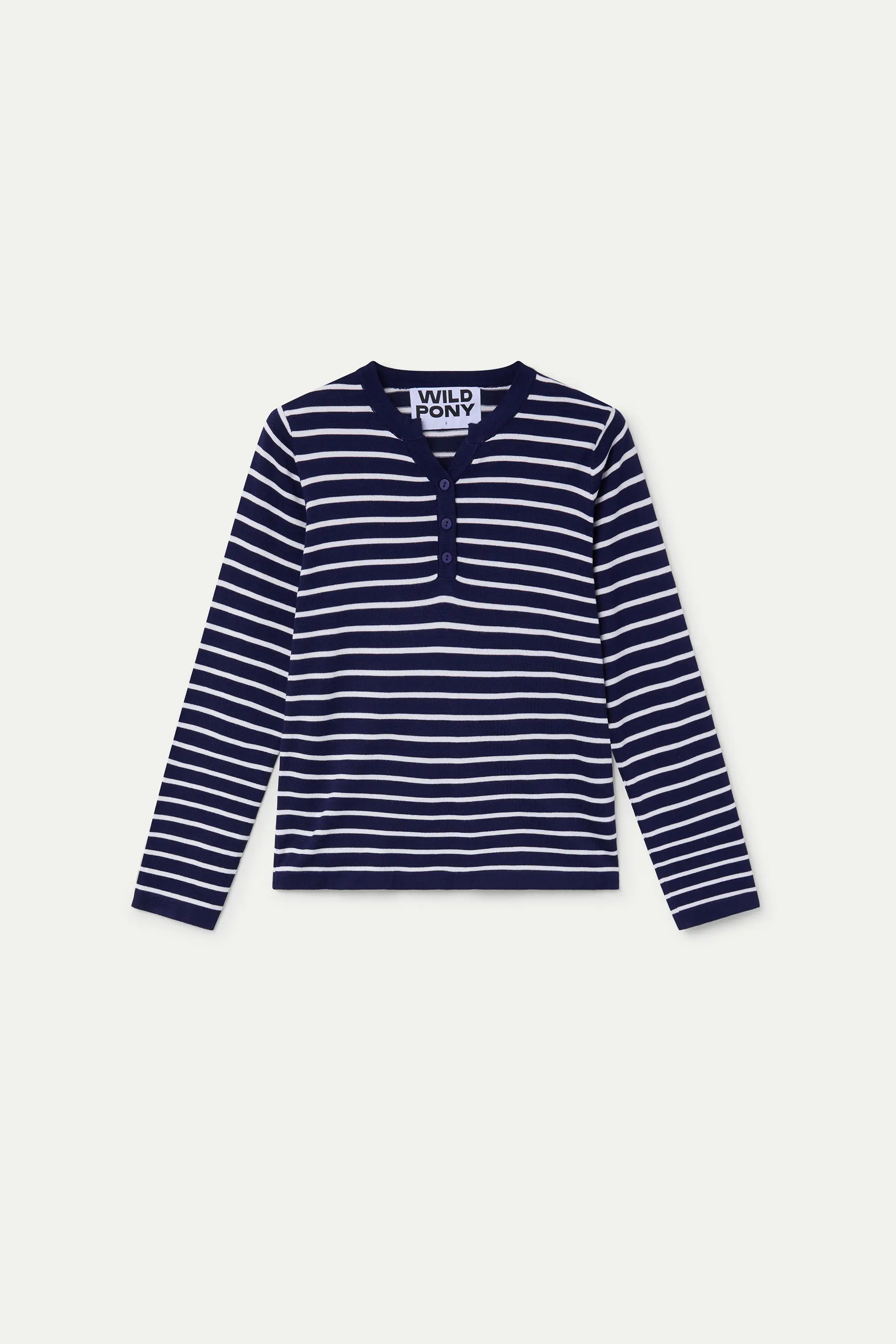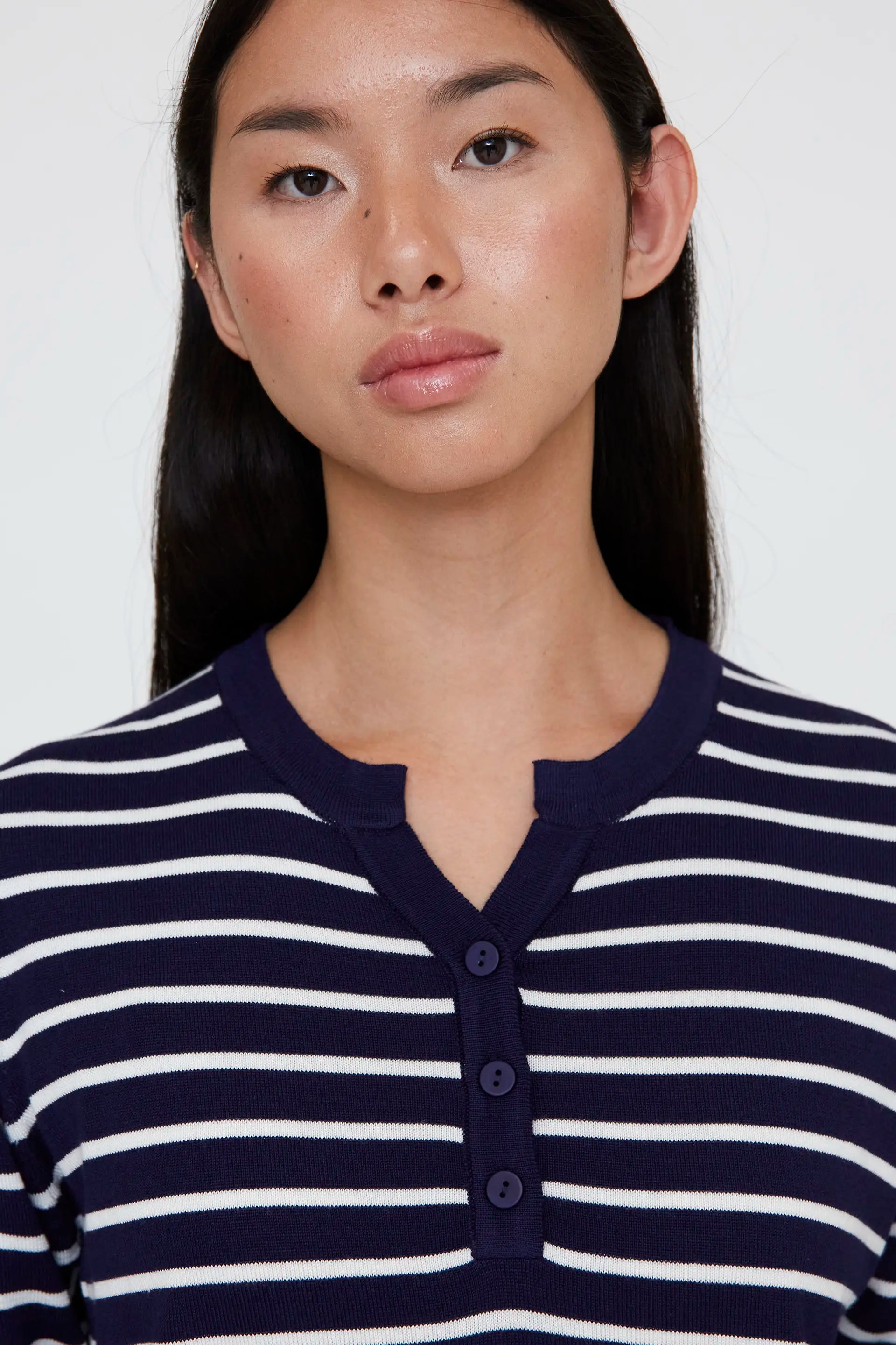 Jersey con tejido de punto suave con estampado de rayas blanco y navy blue. Cuello redondo con escote pico terminado en botones y manga larga. Detalles en rib. La modelo mide 173 cm y lleva la talla S.