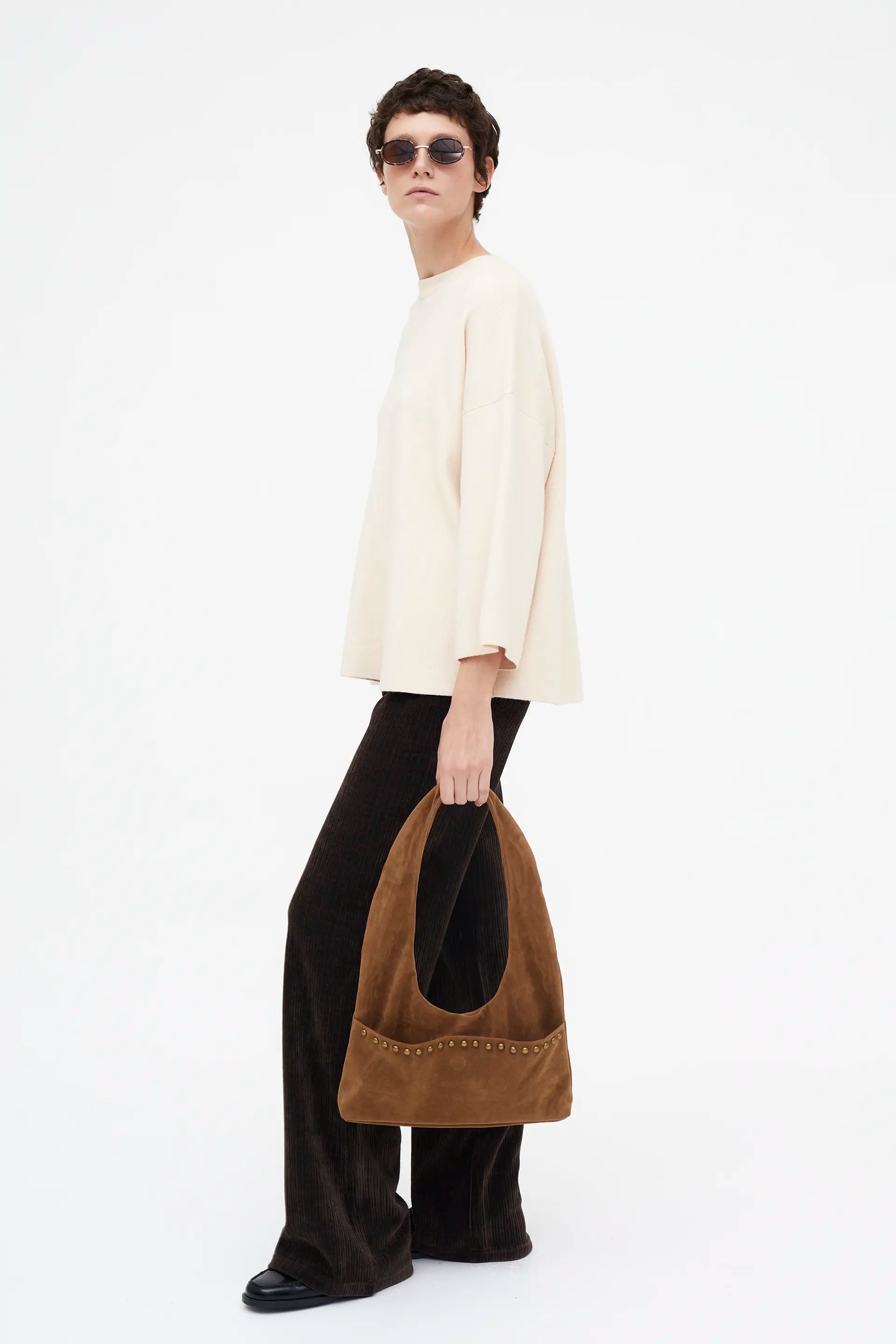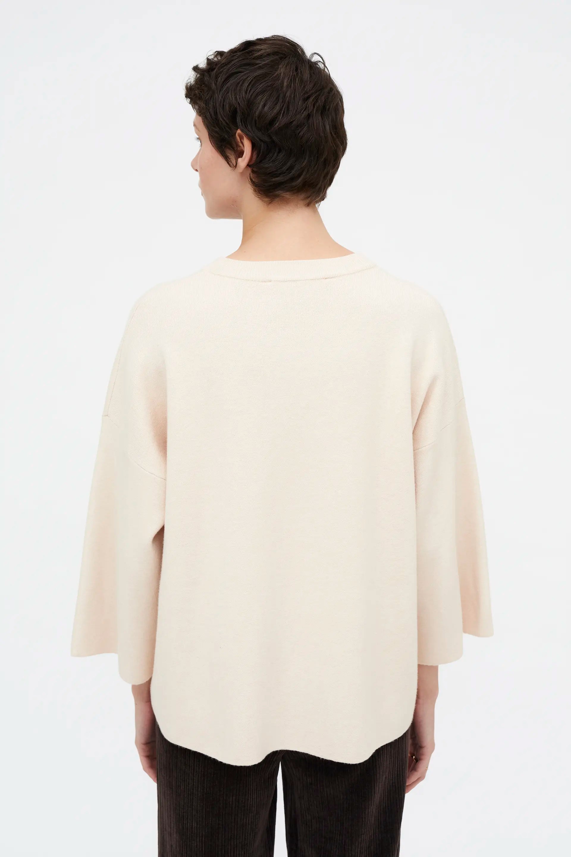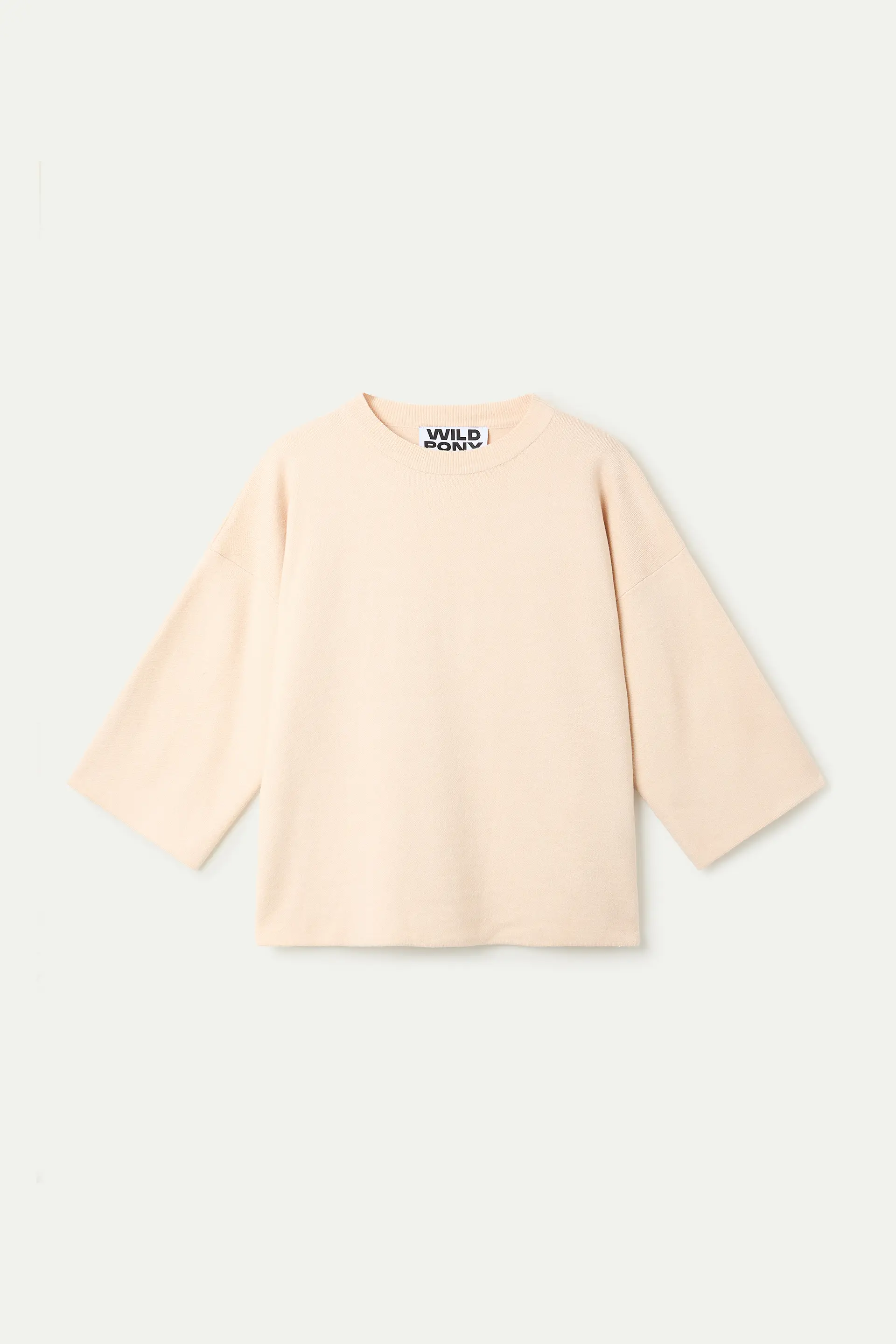 Jersey punto fino manga larga de color blanco. Con cuello redondo y manga amplia francesa con hombro caído.