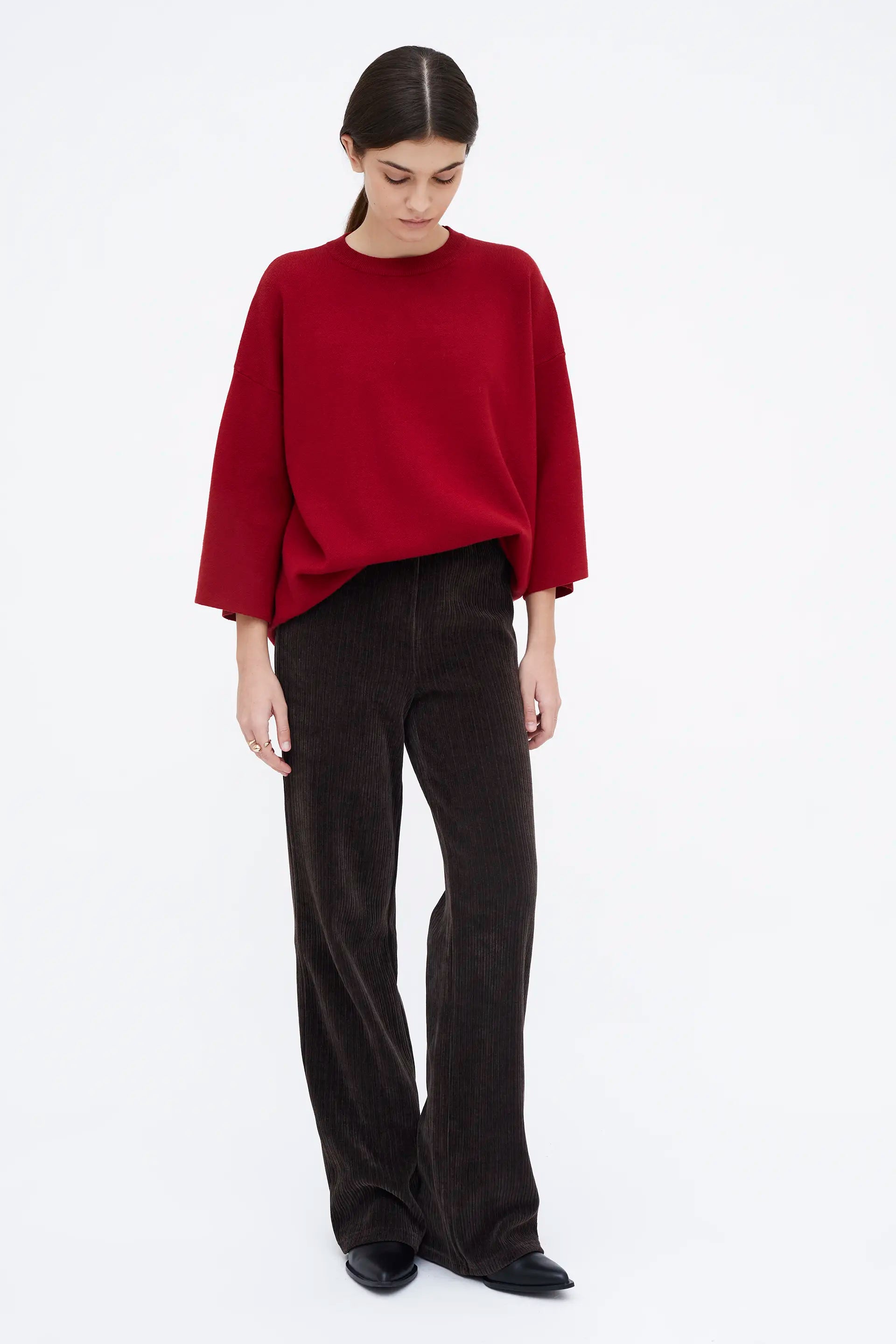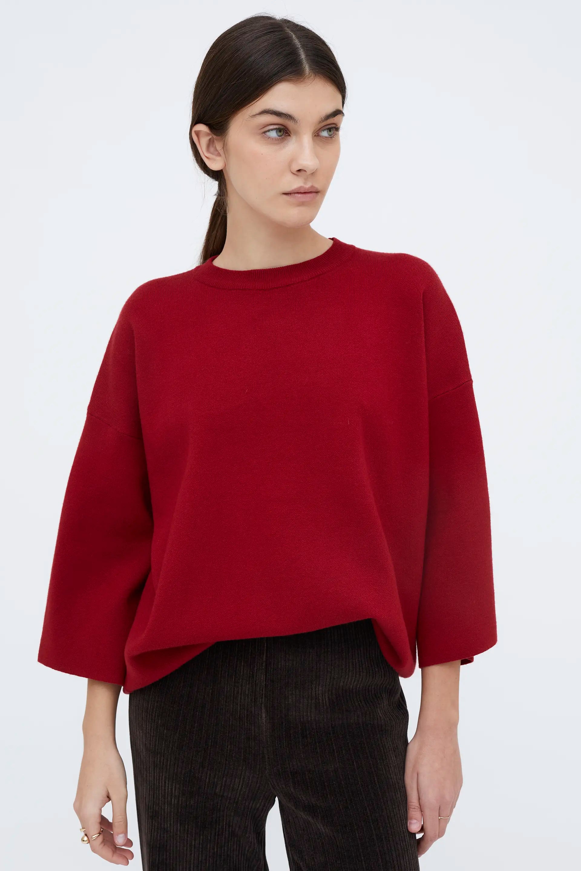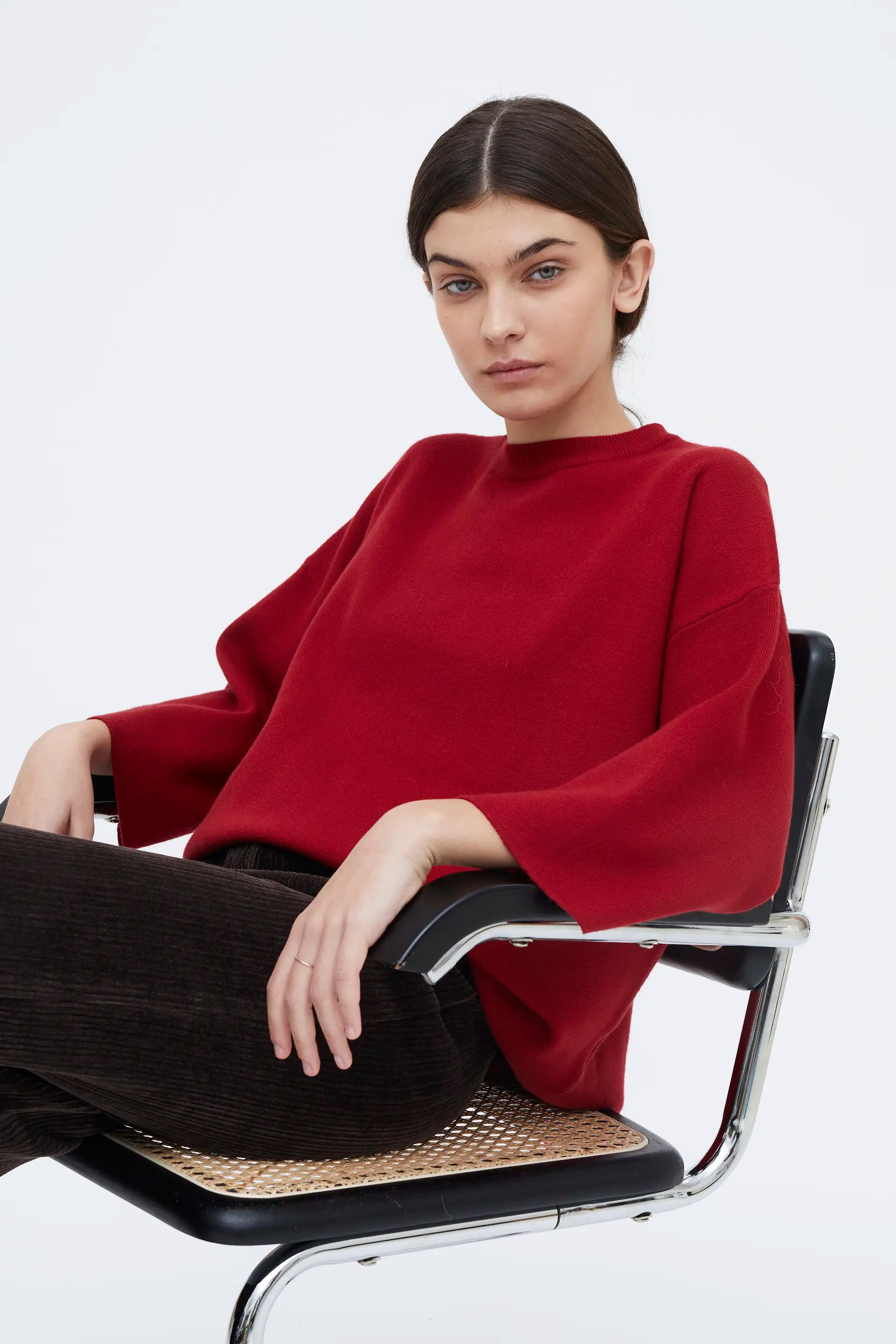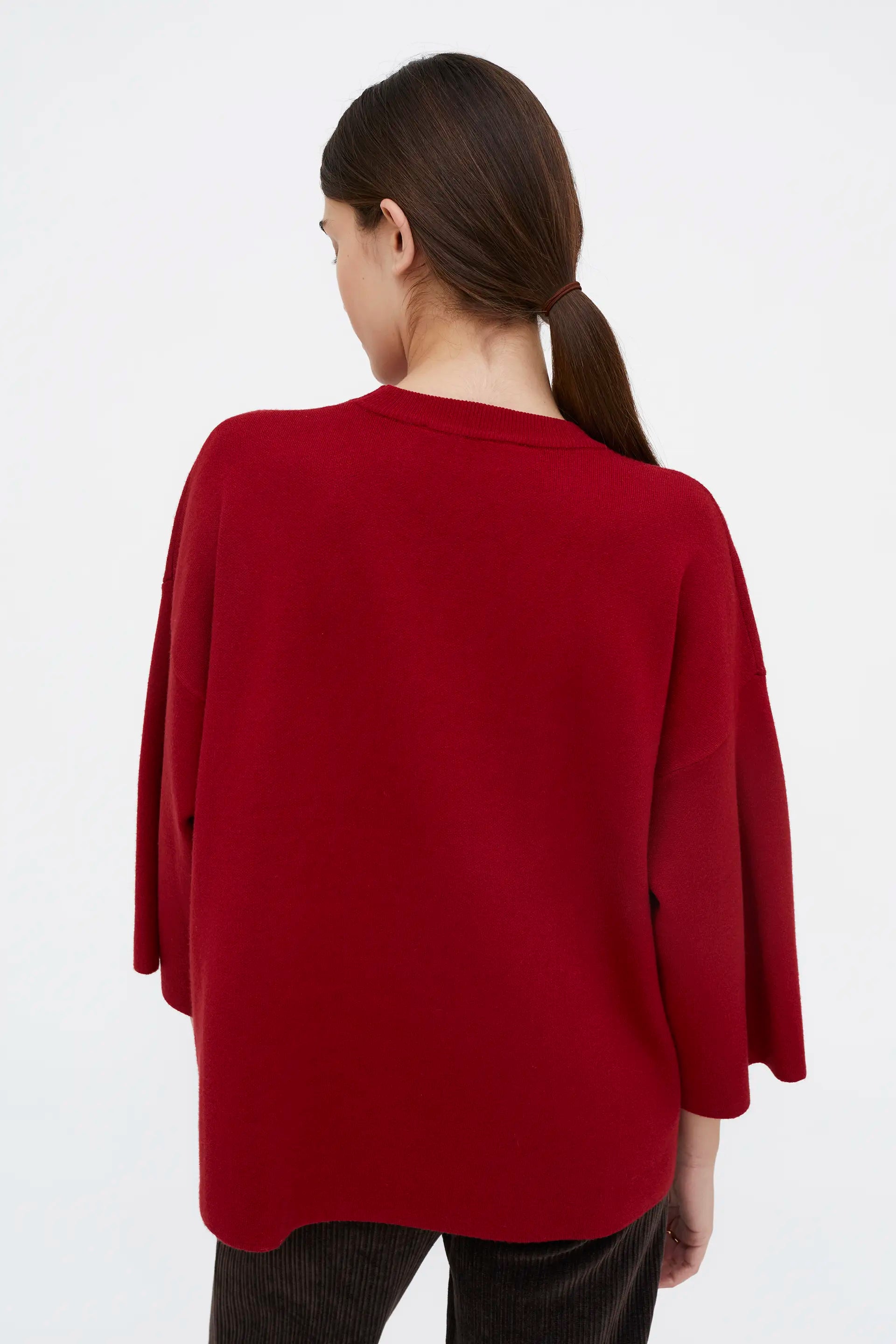 Jersey punto fino manga larga de color rojo. Con cuello redondo y manga amplia francesa con hombro caído.