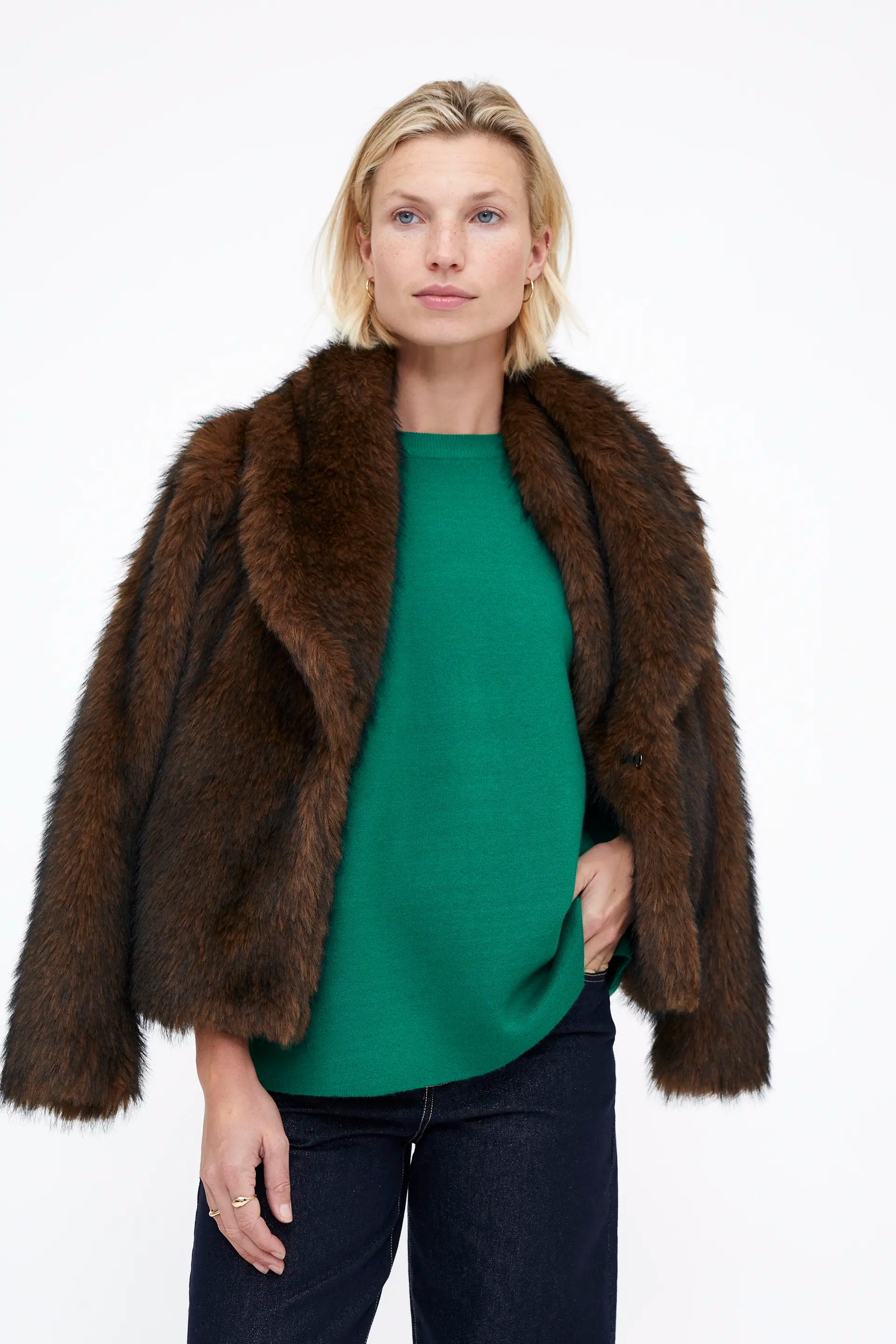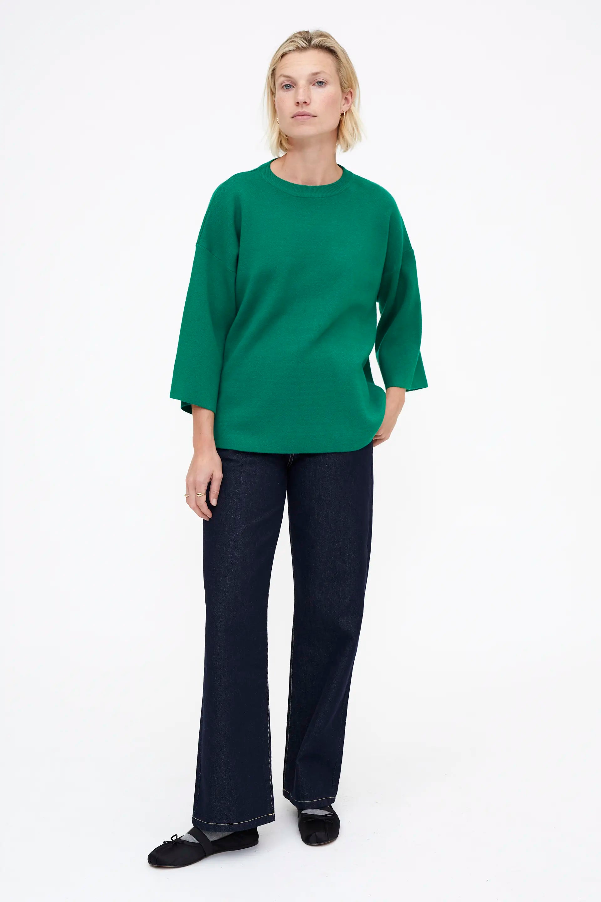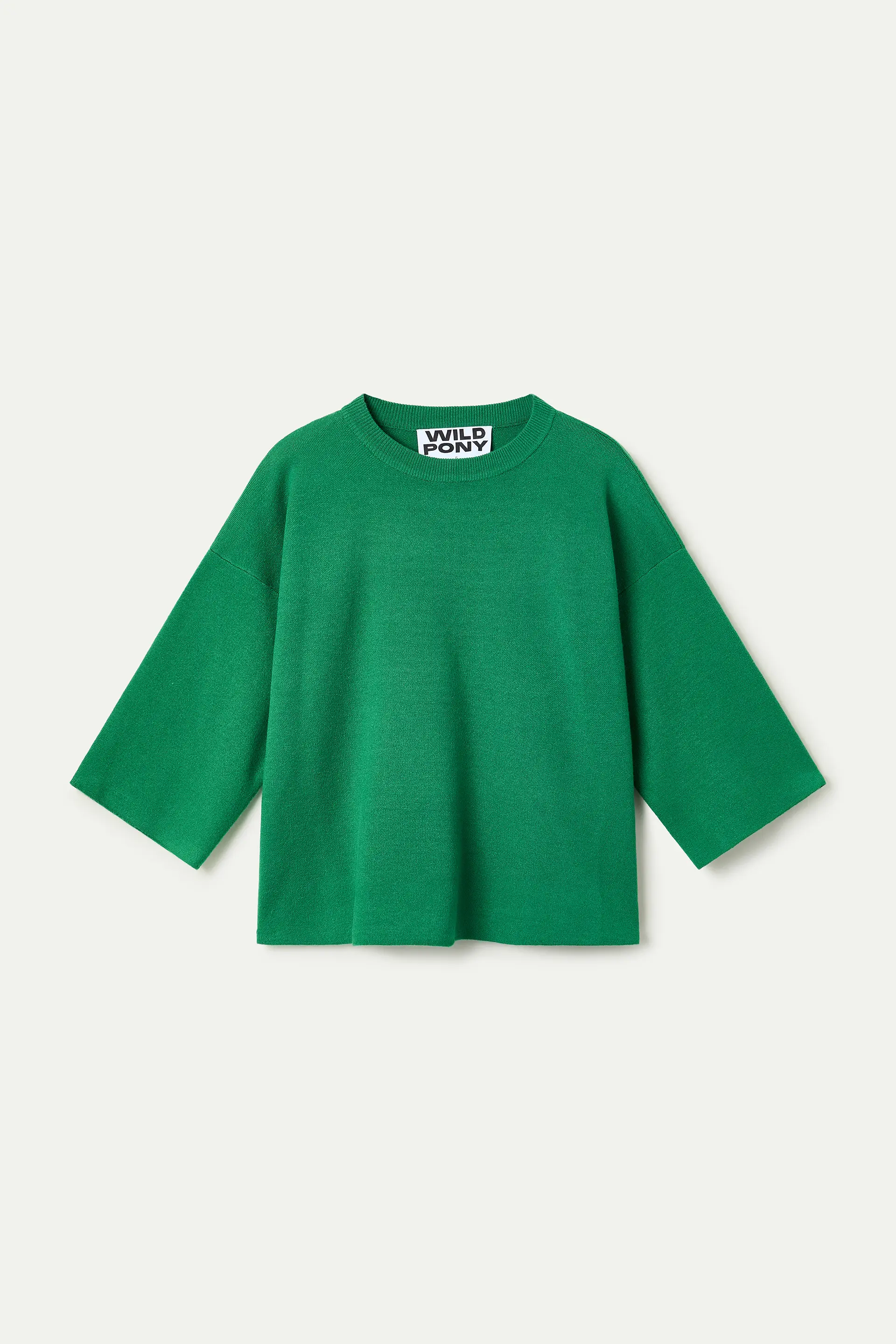 Jersey punto fino manga larga de color verde. Con cuello redondo y manga amplia francesa con hombro caído.