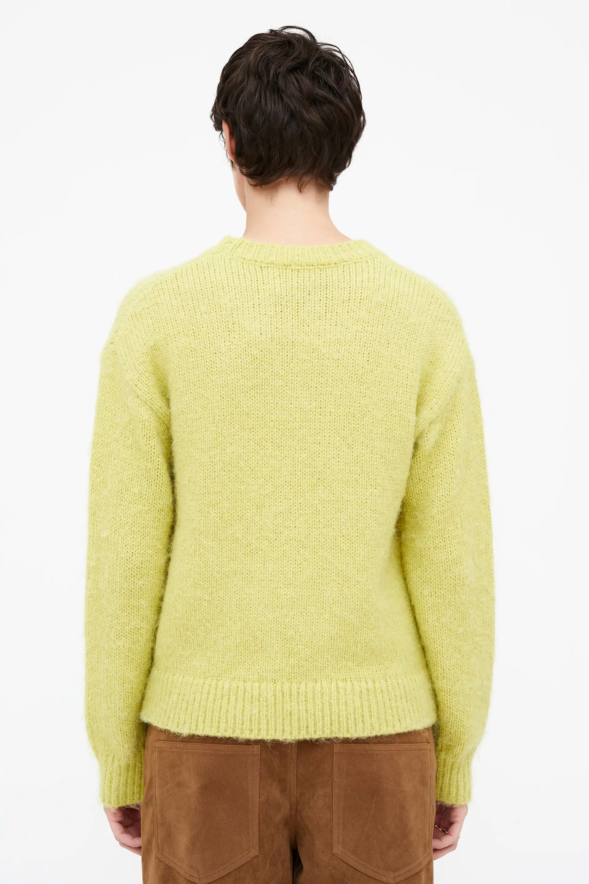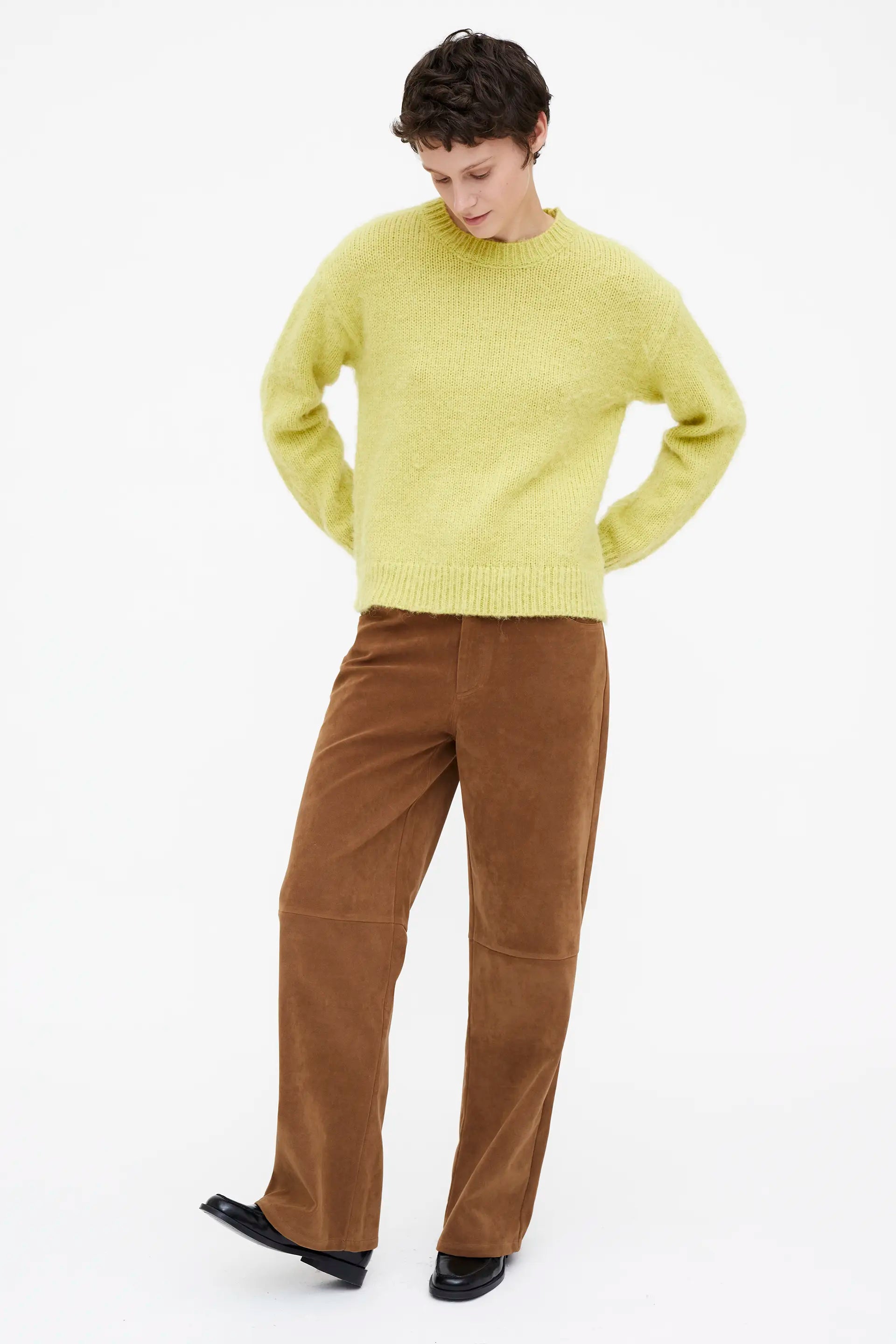 Jersey punto suave de color amarillo. Con cuello redondo y manga larga. Hombro ligeramente caído.