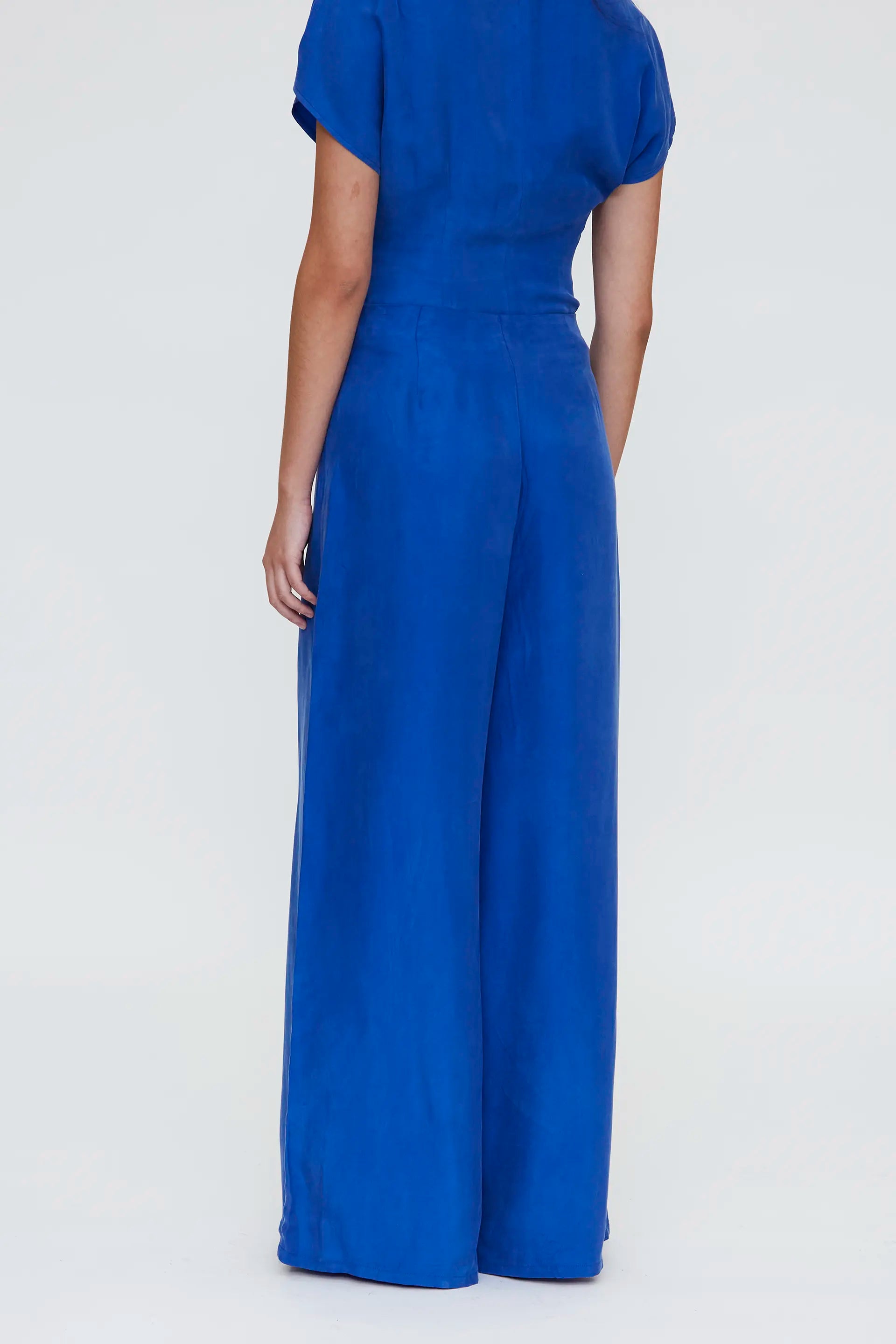 Pantalón con tejido crepé de color azul. Cintura fija de tiro alto con cremallera lateral invisible. La modelo mide 173 cm y lleva la talla S.