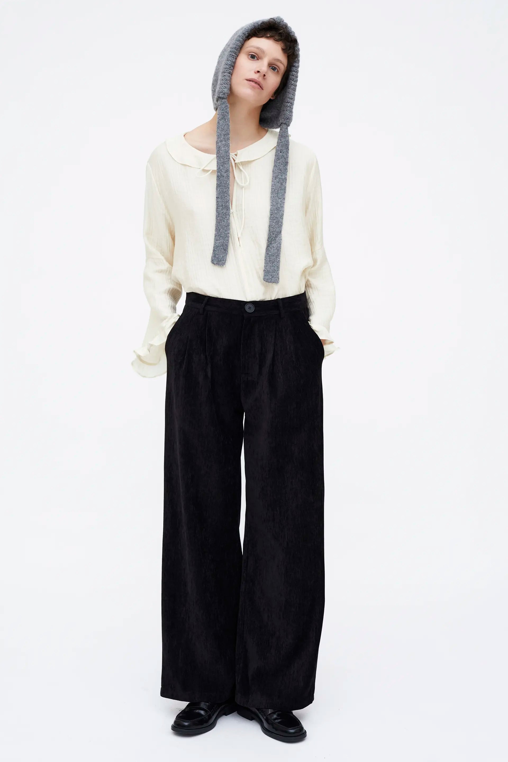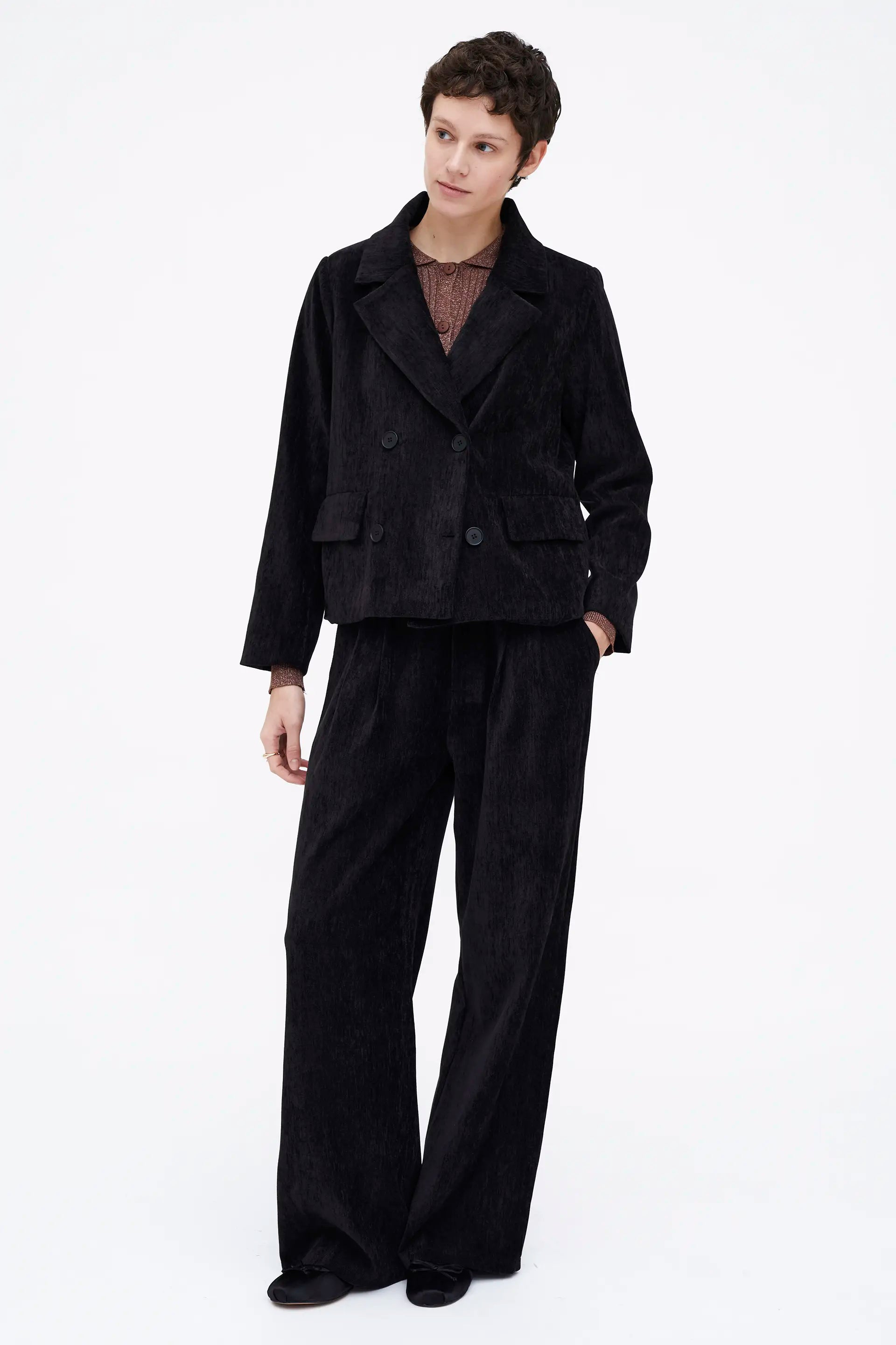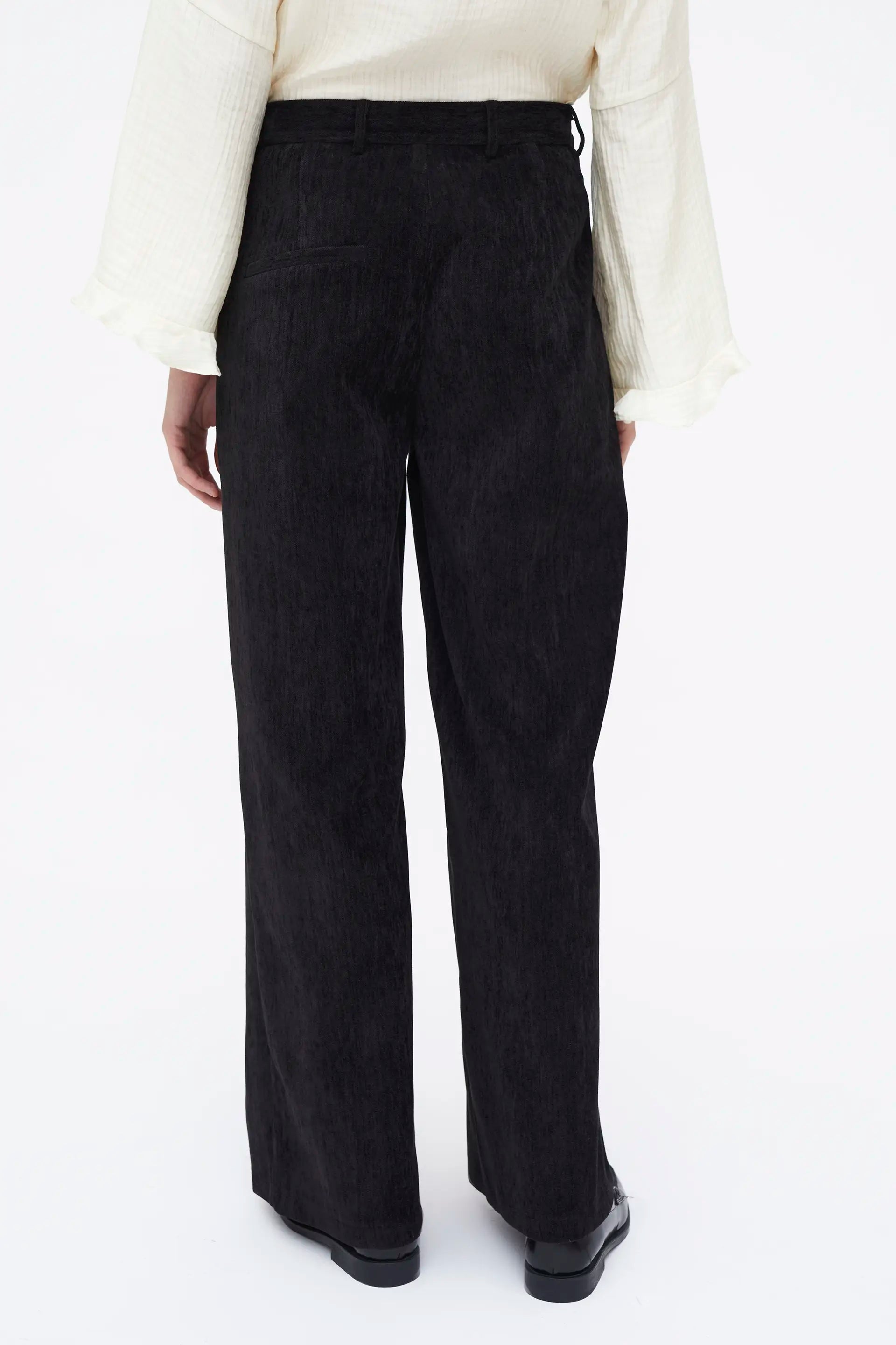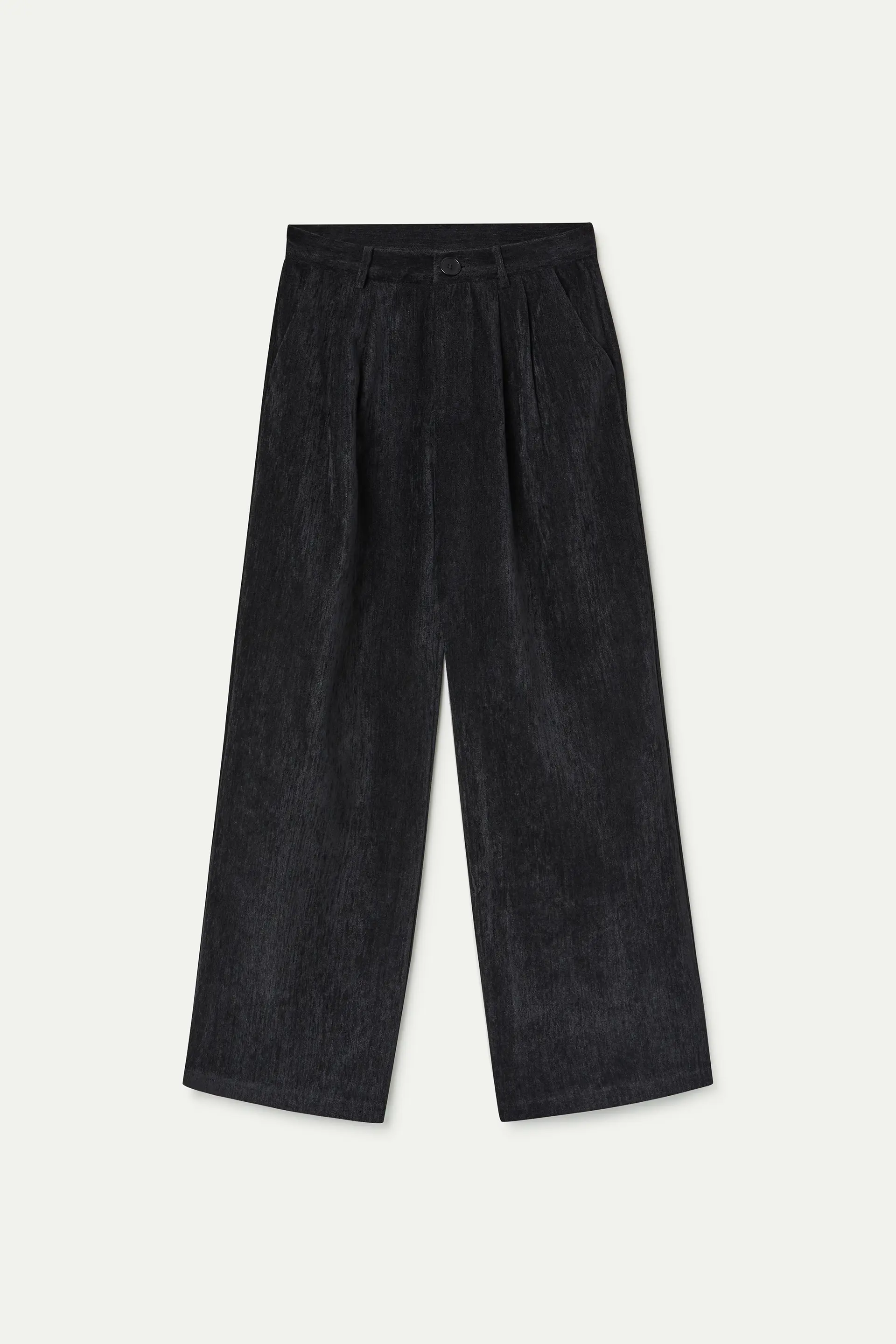 Pantalón de color negro con efecto aterciopelado. Con cintura fija de tiro medio y pernera de corte recto. Cierre frontal con cremallera y botón.