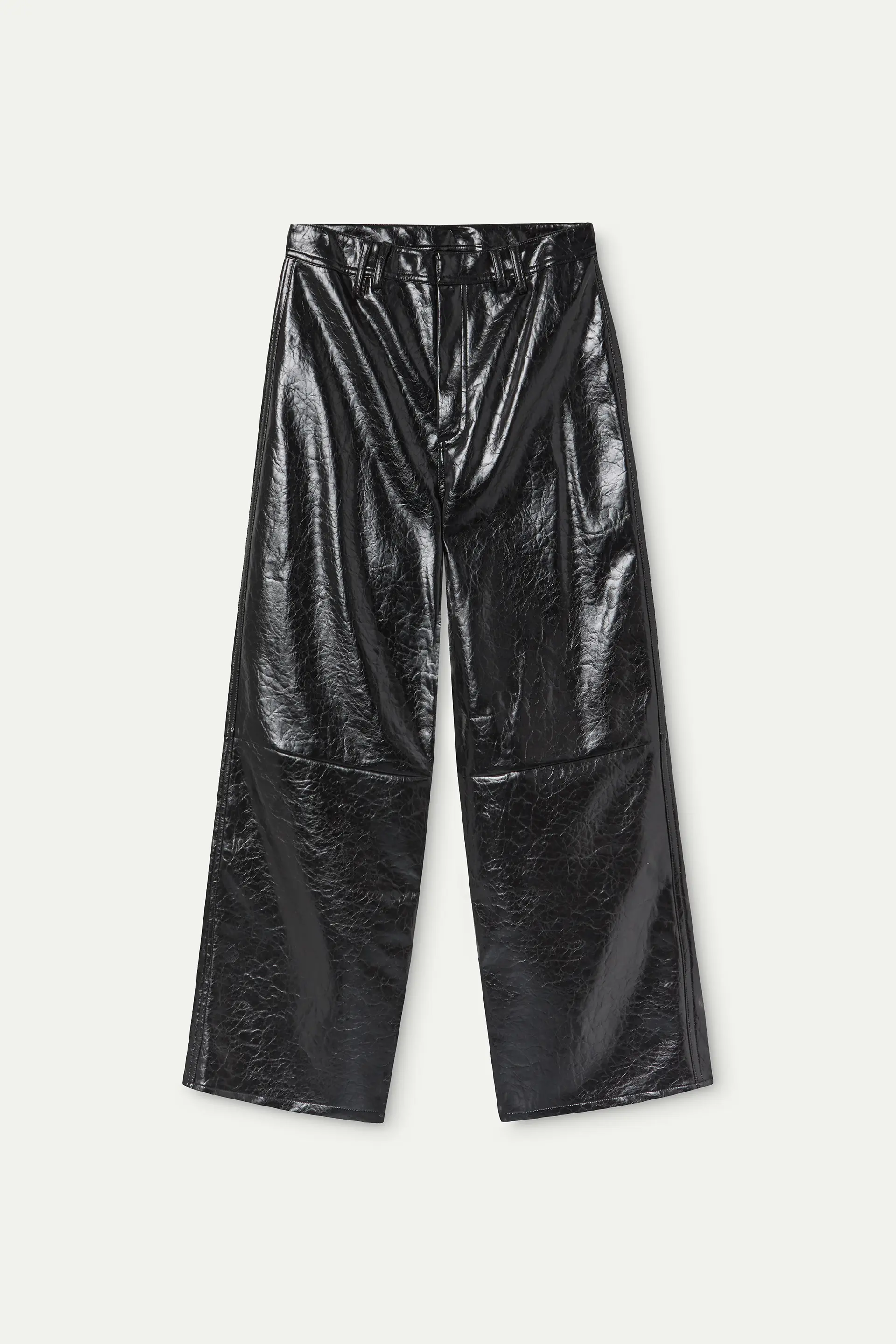 Pantalón recto en tejido efecto piel color negro. Con cintura fija de tiro medio. Modelo con costuras visibles. Cierre frontal con gancho y cremallera oculta.