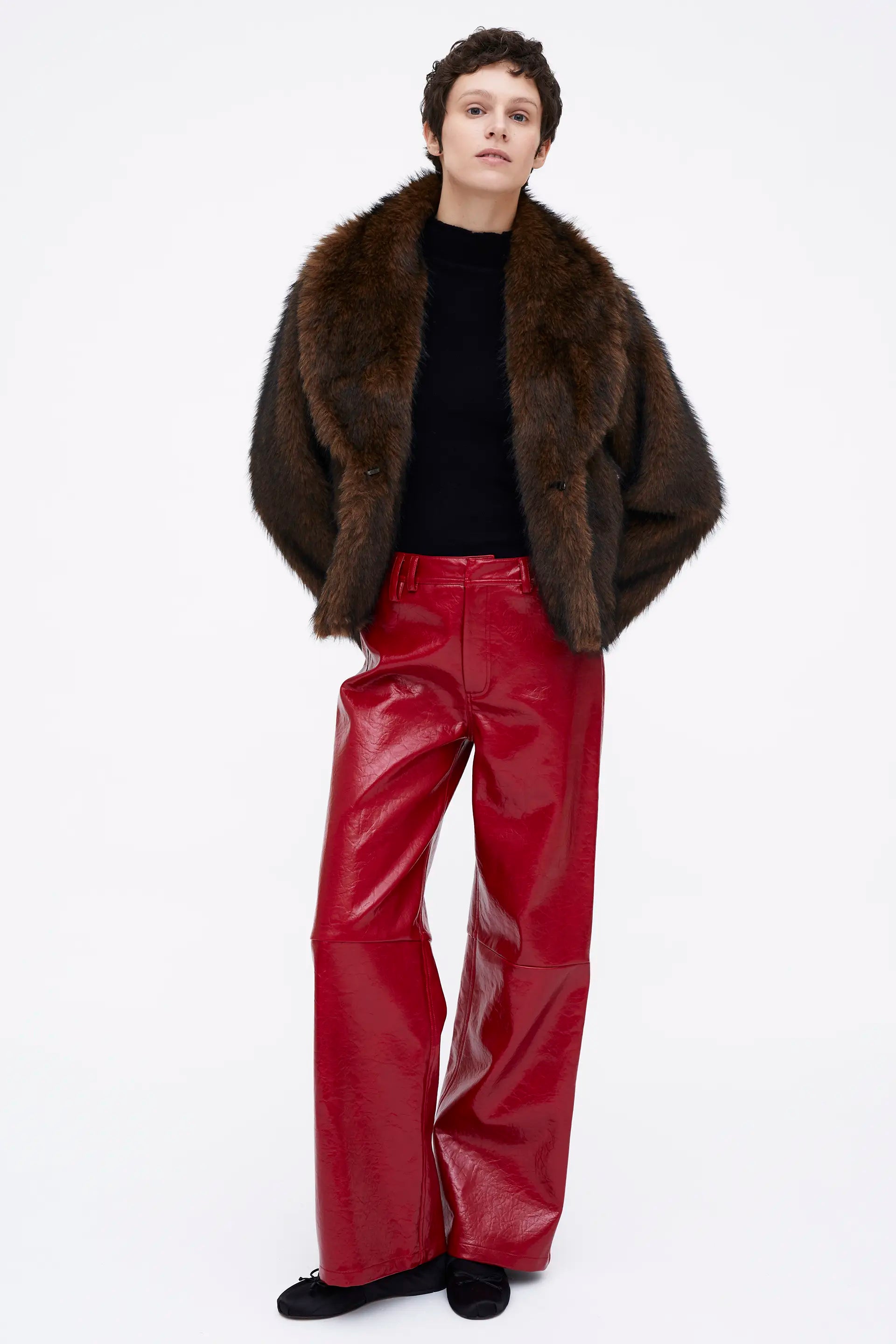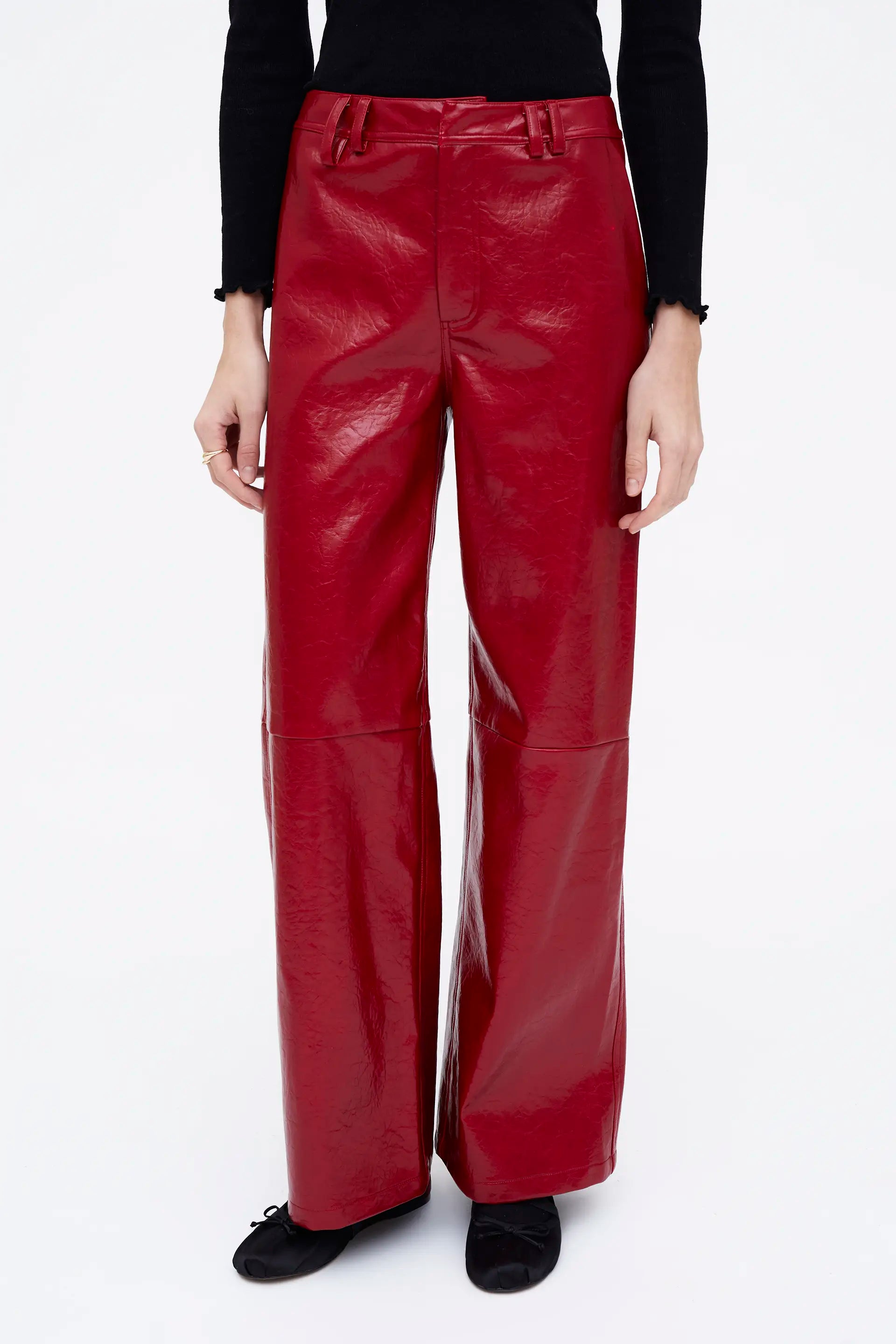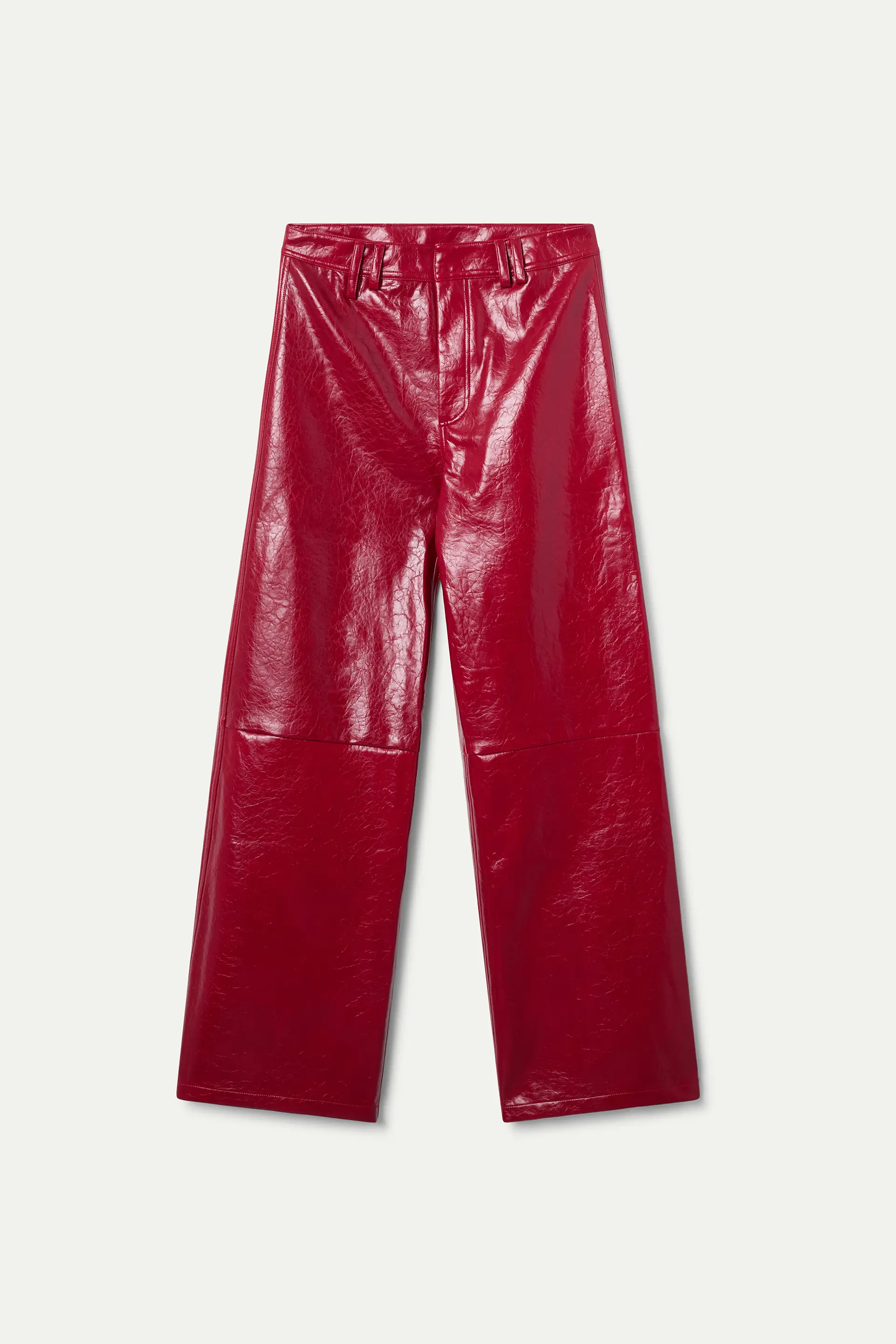Pantalón recto en tejido efecto piel color rojo. Con cintura fija de tiro medio. Modelo con costuras visibles. Cierre frontal con gancho y cremallera oculta.