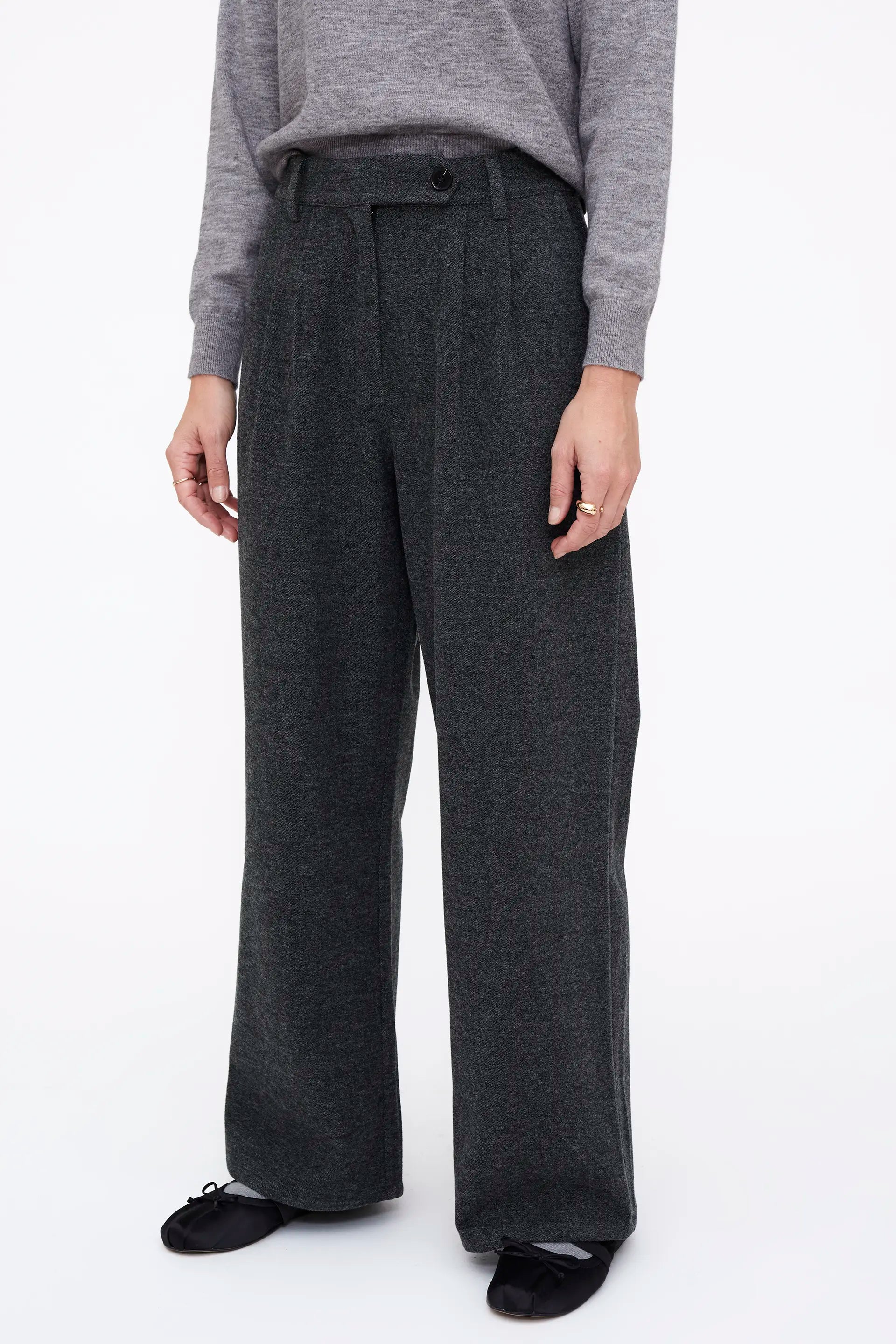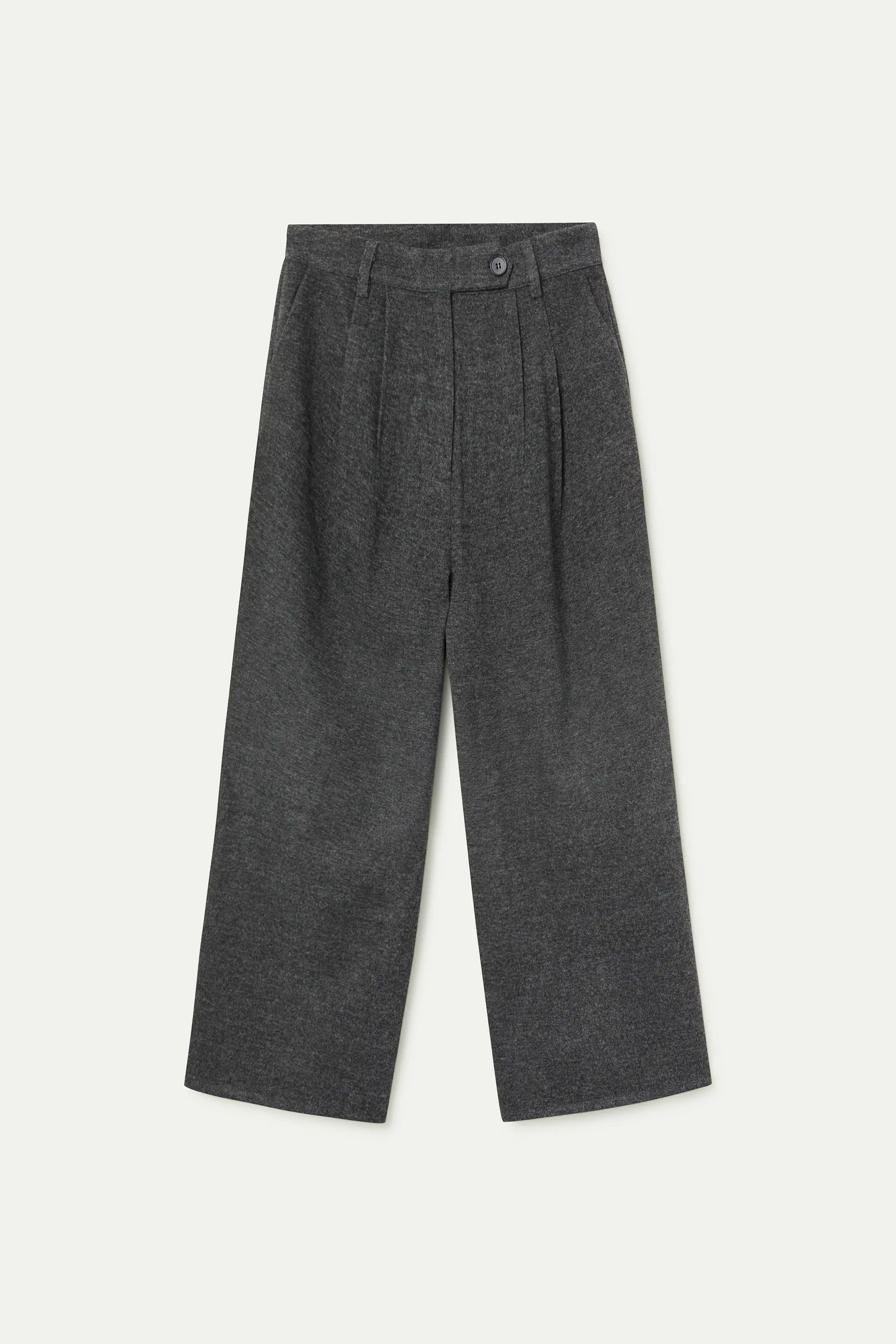Pantalón recto flannel color gris. Con cintura fija de tiro alto y pernera de corte recto amplio. Cierre mediante cremallera oculta por tapeta, corchete y botón. Bolsillos laterales.