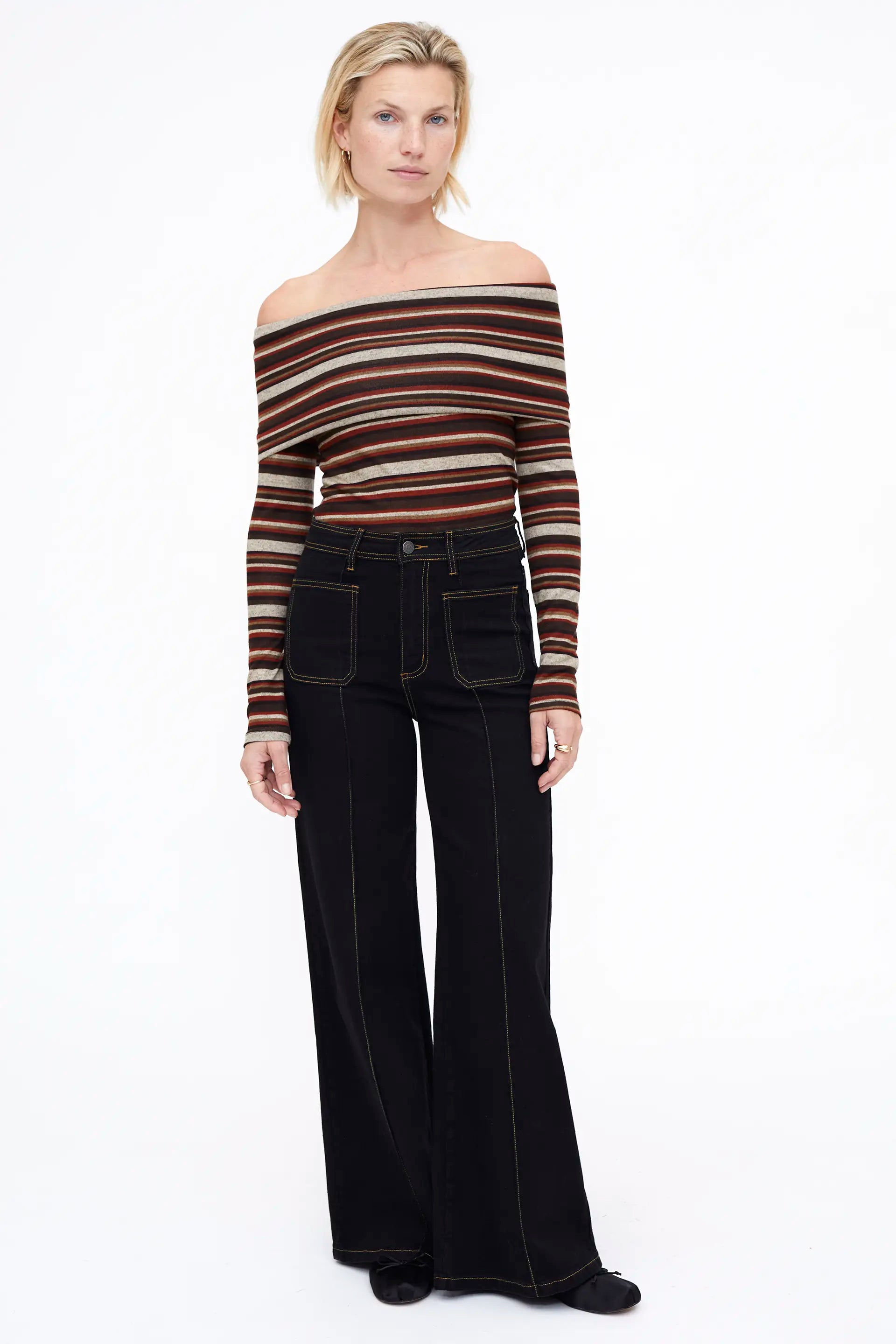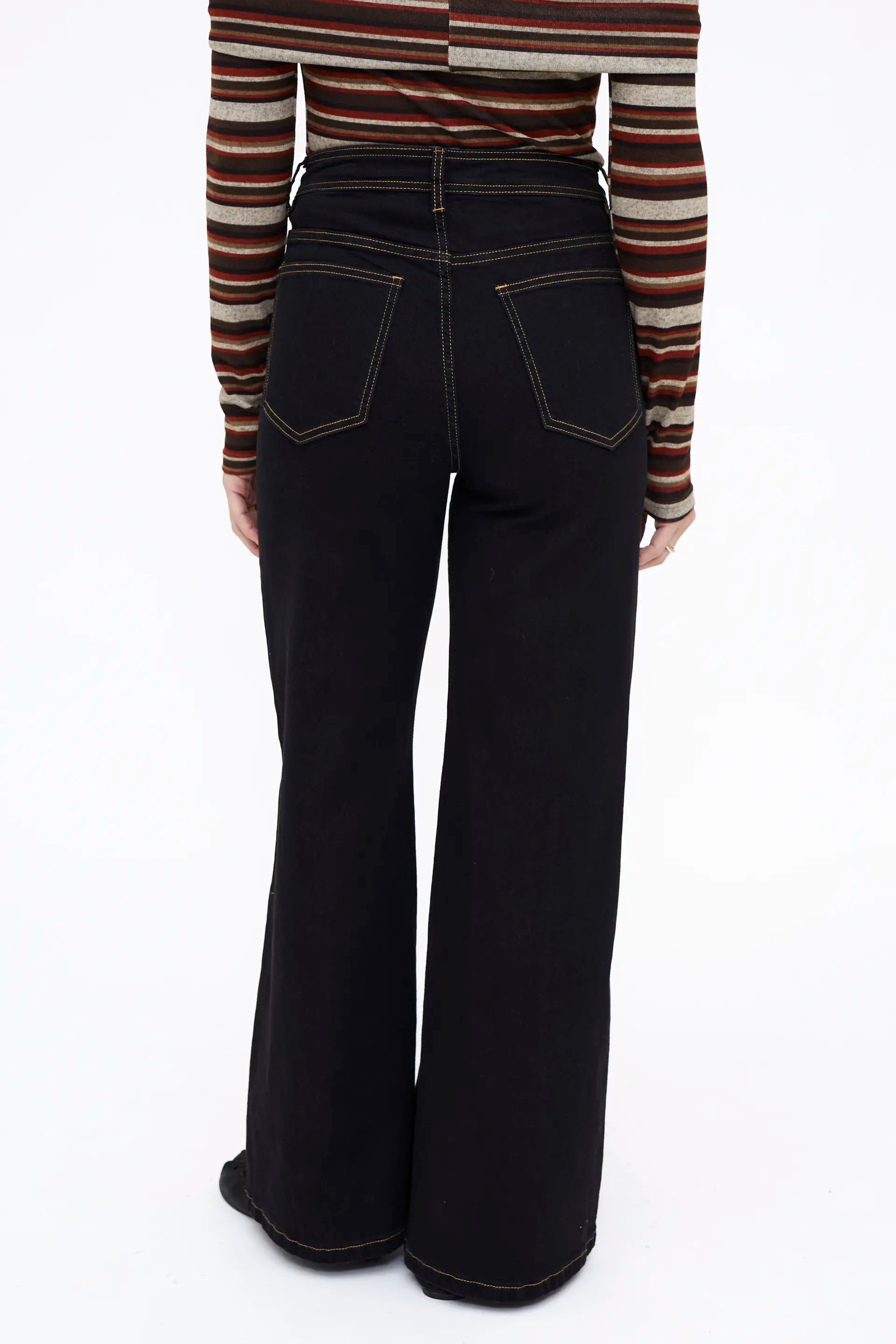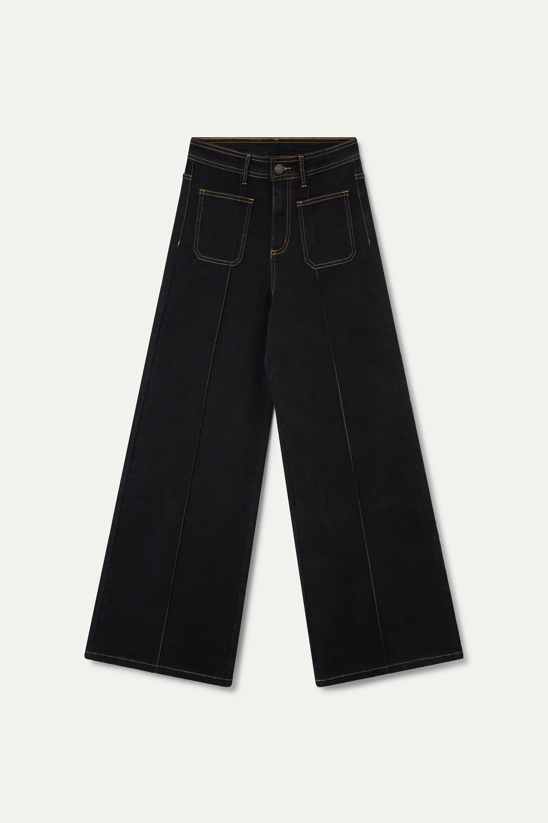 Pantalón vaquero color negro. Con cintura fija de tiro alto y pernera de corte recto. Cierre frontal con cremallera y botón metálica. Bolsillos laterales y traseros.