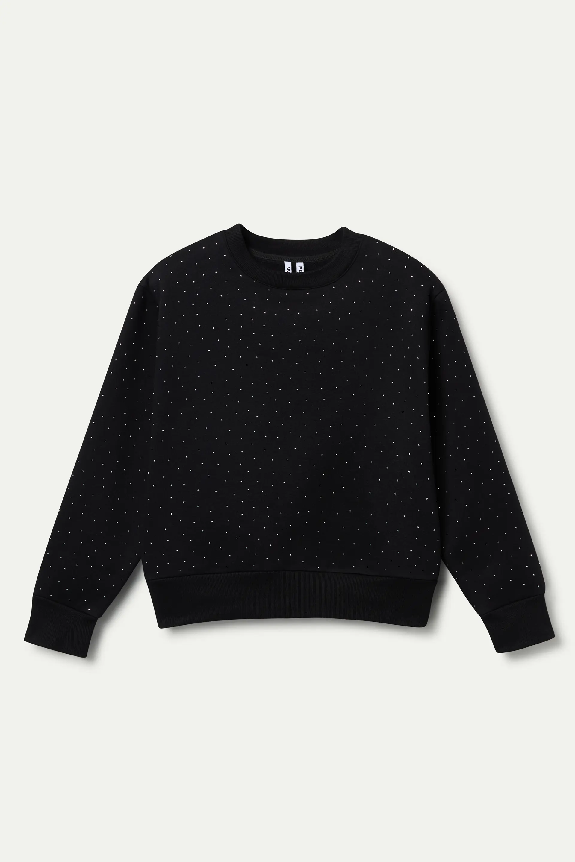 Sudadera de color negro con strass plateado. Cuello redondo y manga larga con terminaciones rib.