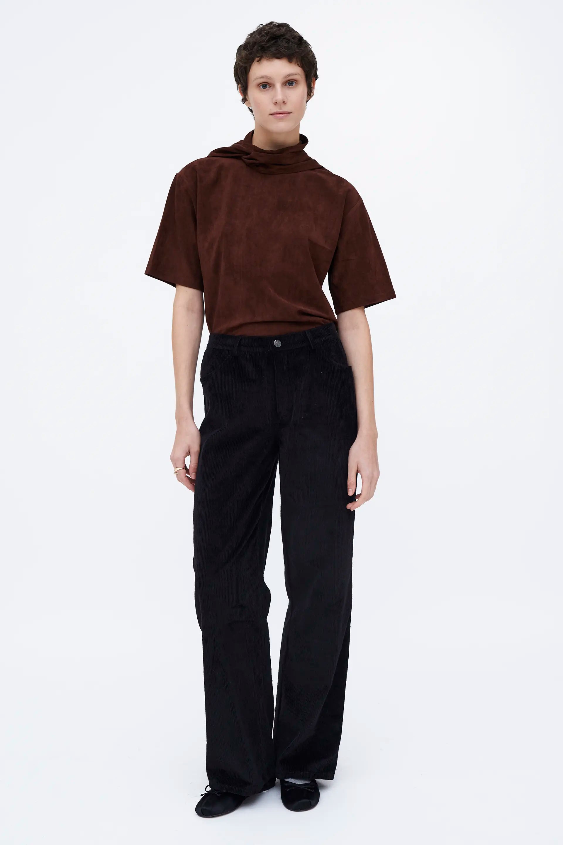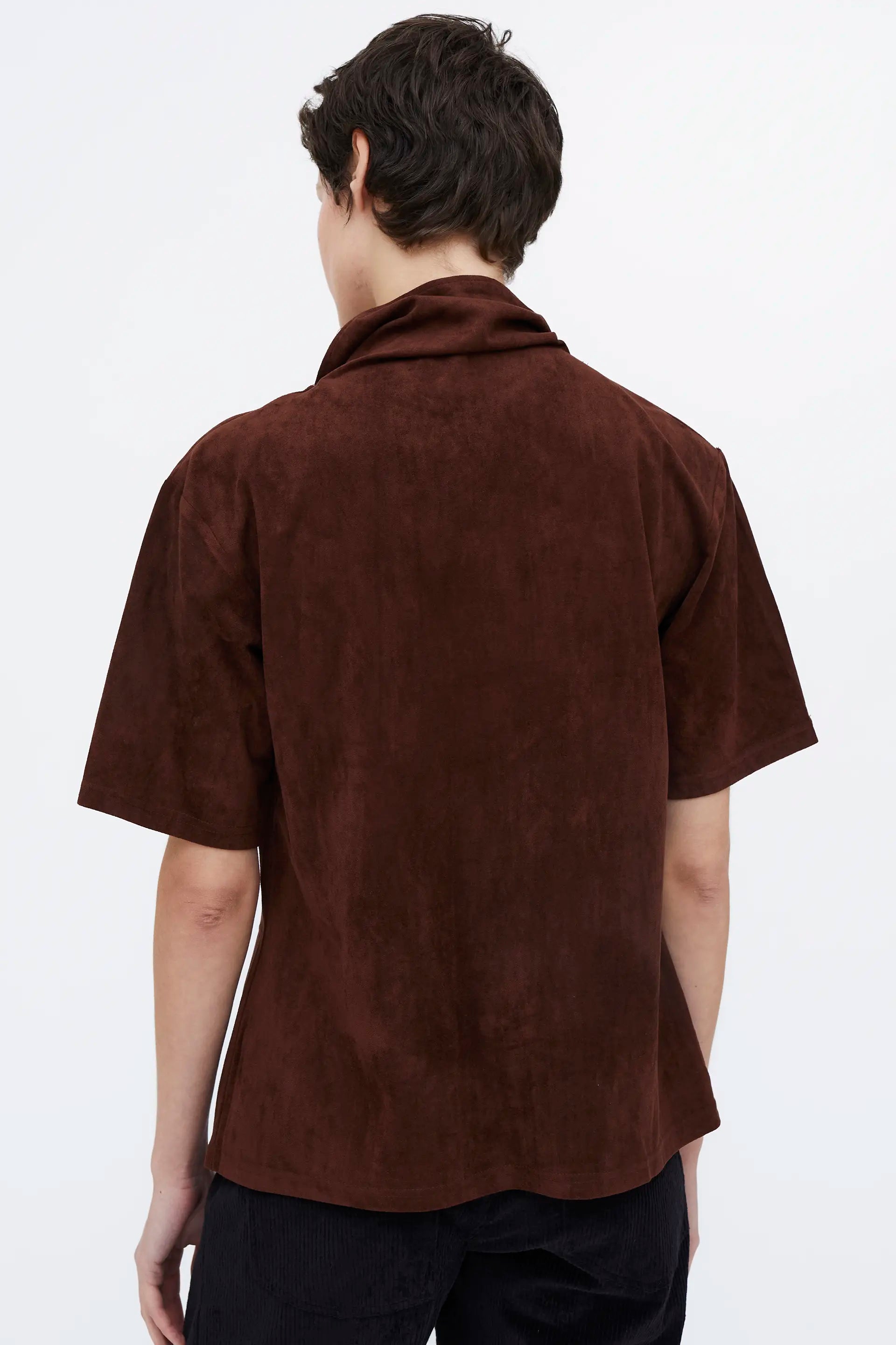 Top ante color marrón. Con cuello alto nudado y hombro ligeramente caído. Manga corta amplia.