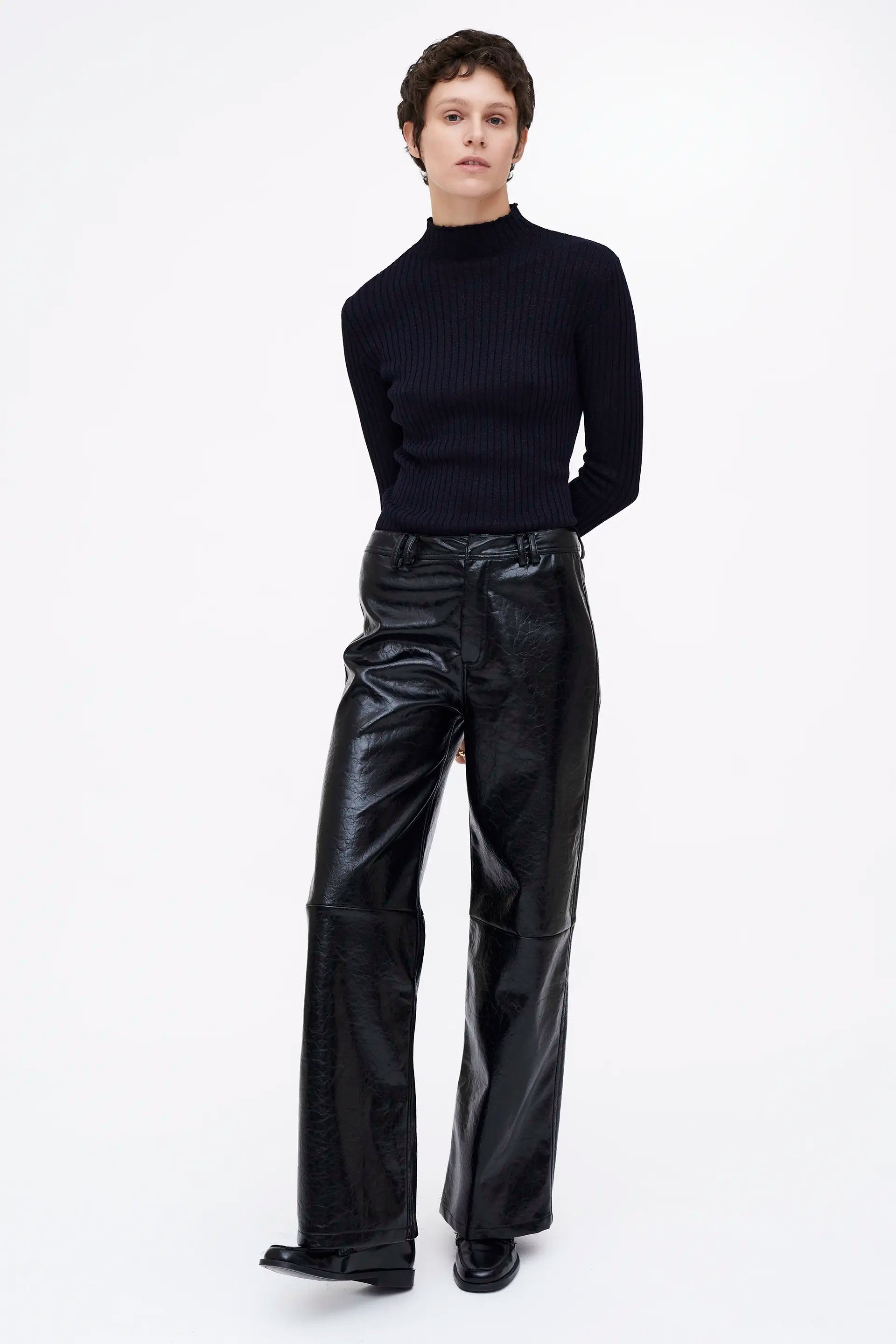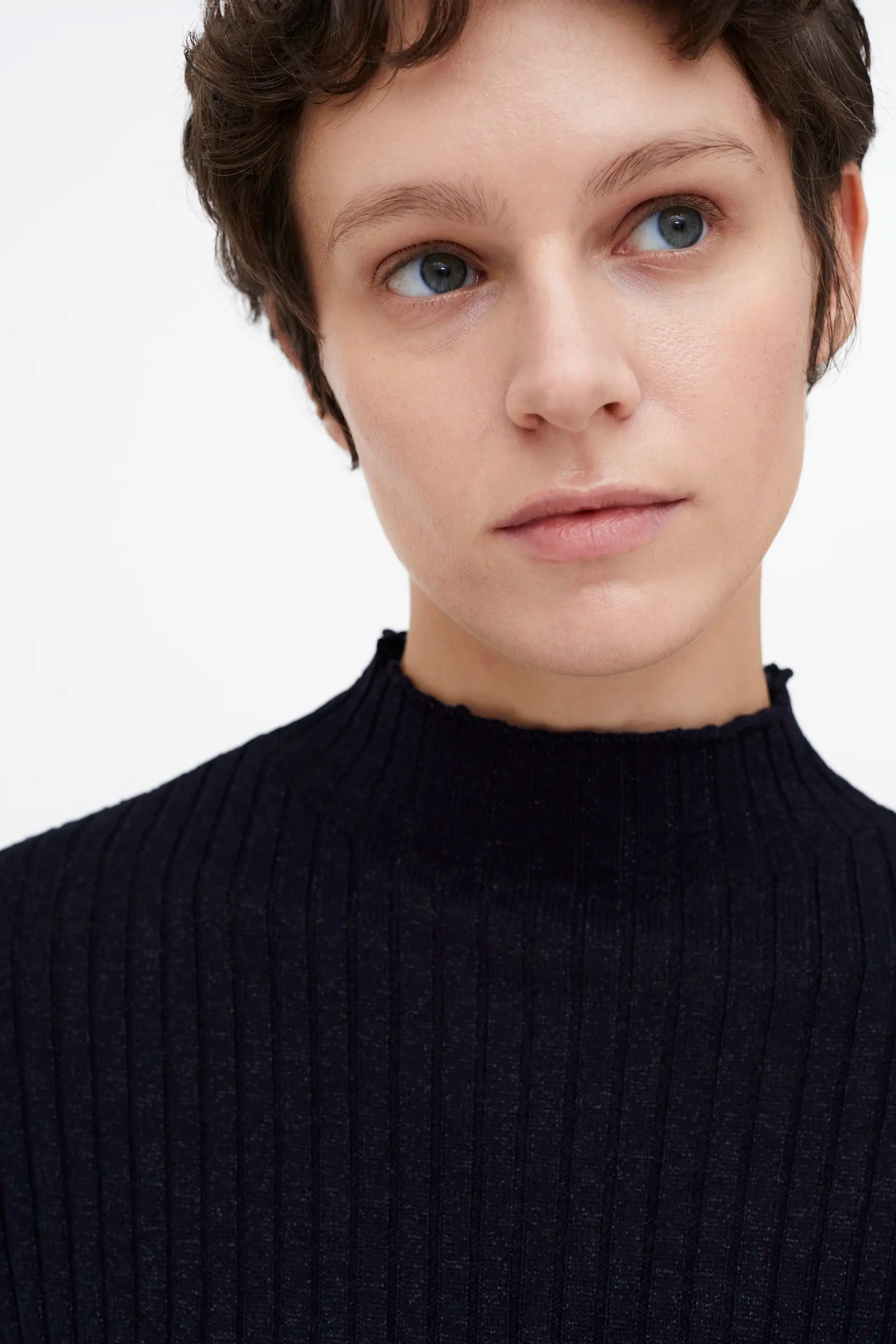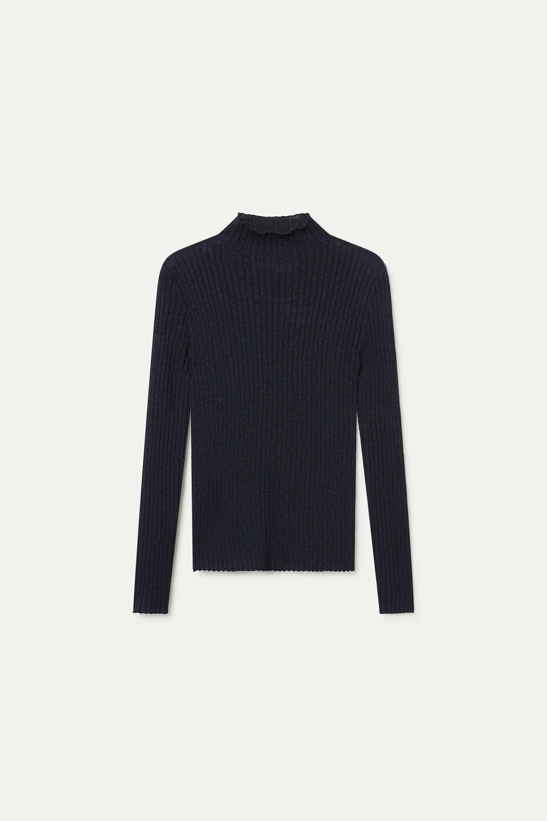 Top de punto canalé cuello perkins color Navy Blue. Con cuello perkins, manga larga y detalles lurex rib.