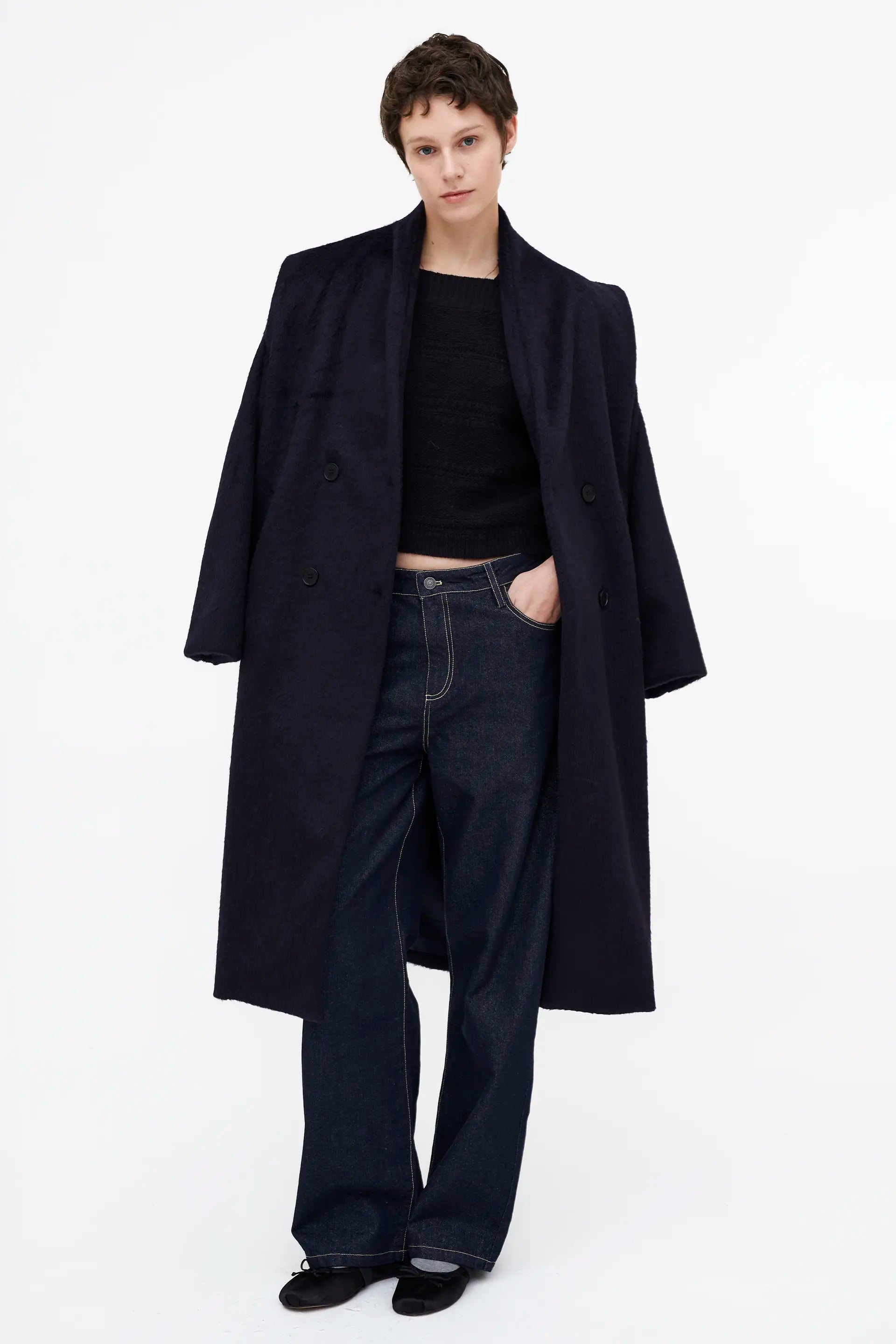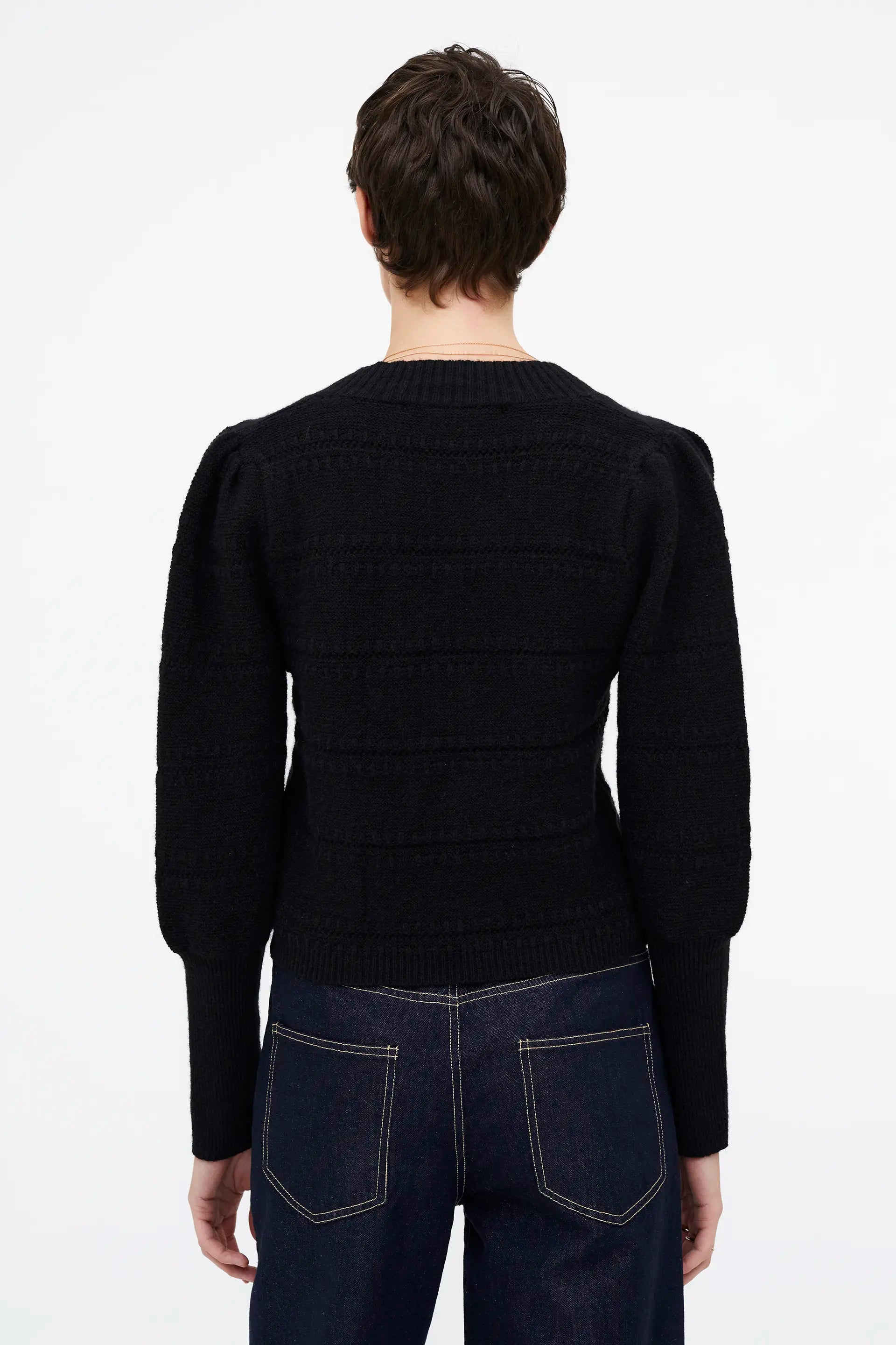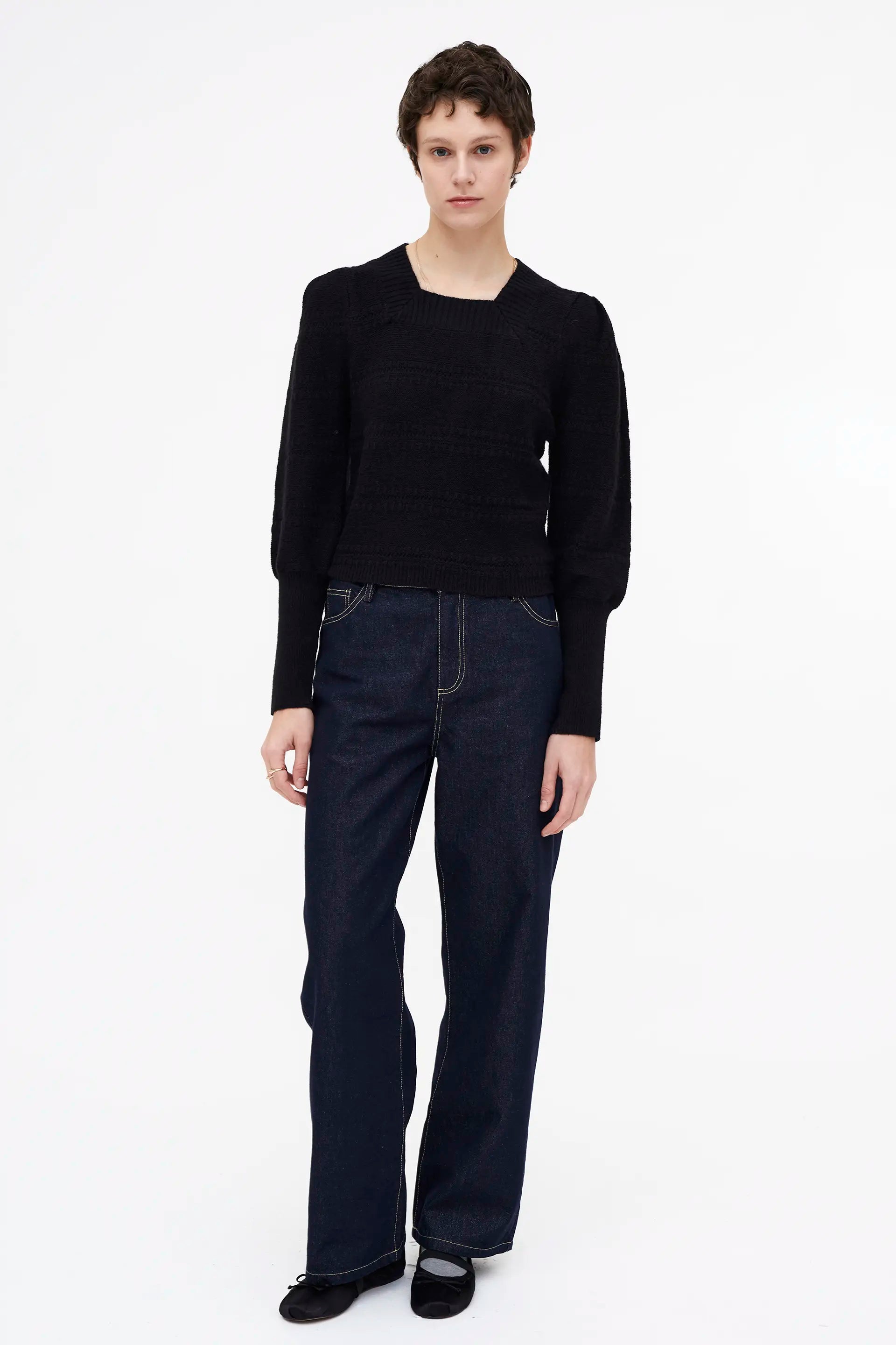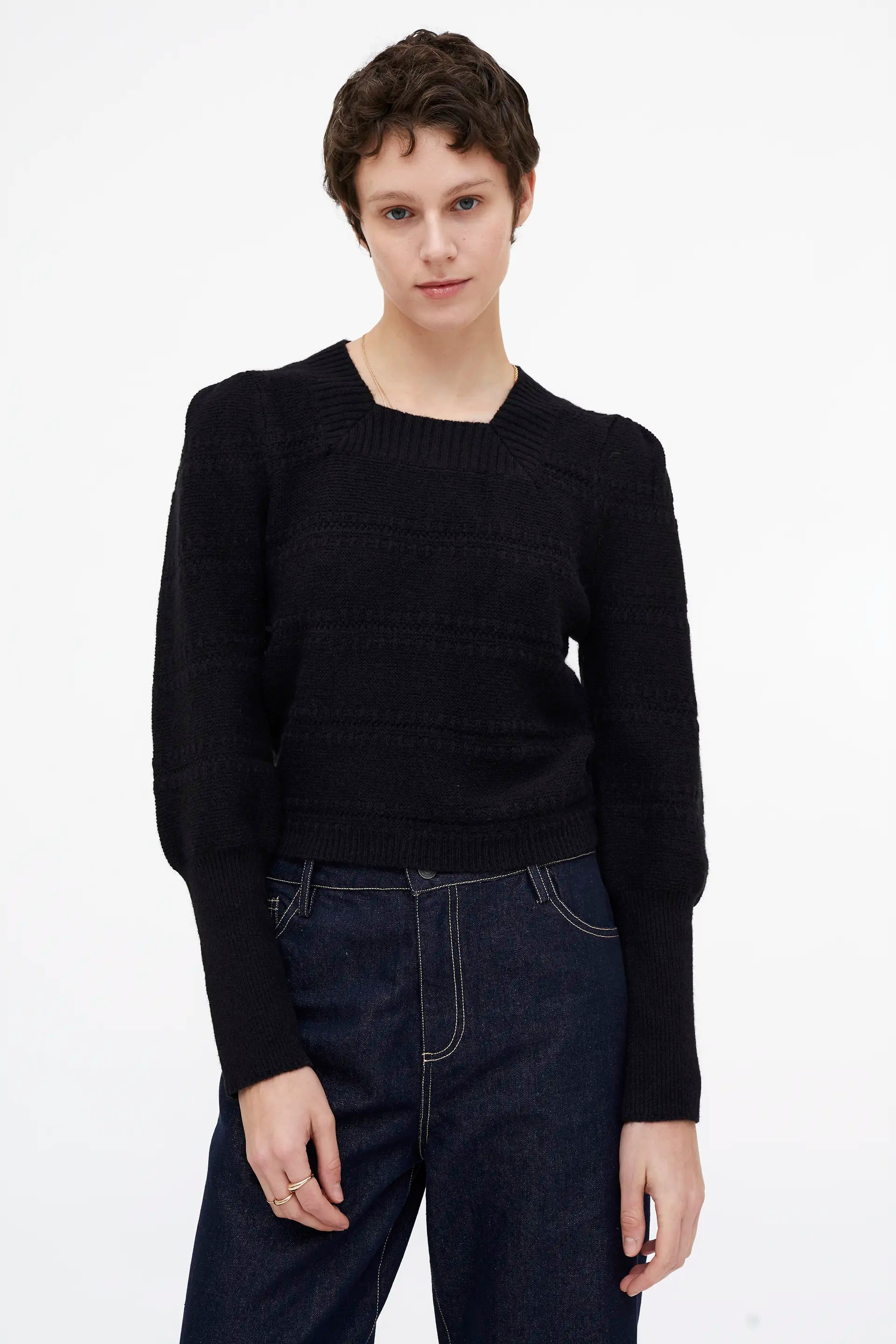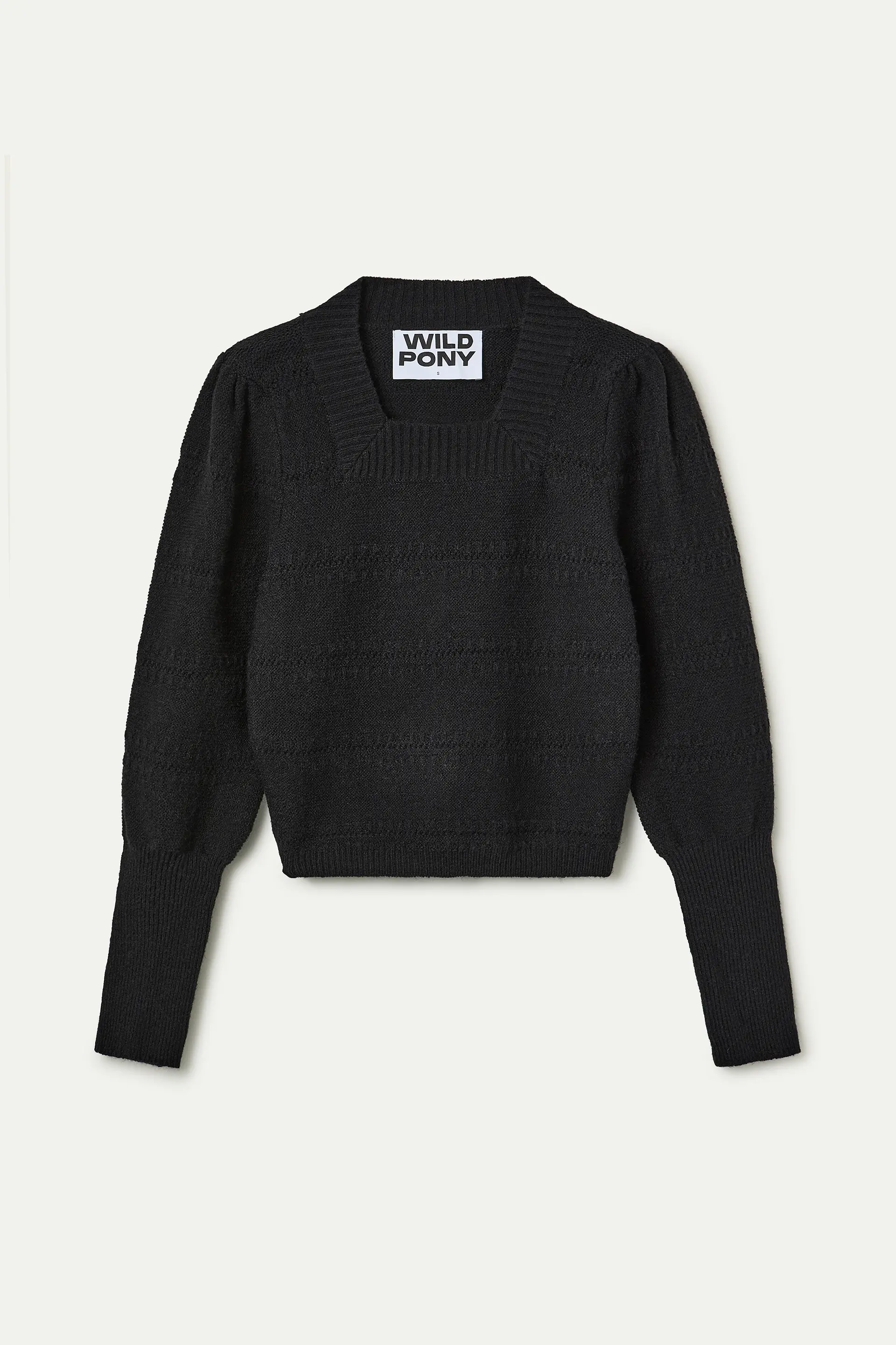 Top de punto color negro. Con cuello cuadrado y manga larga abullonada terminada en rib.