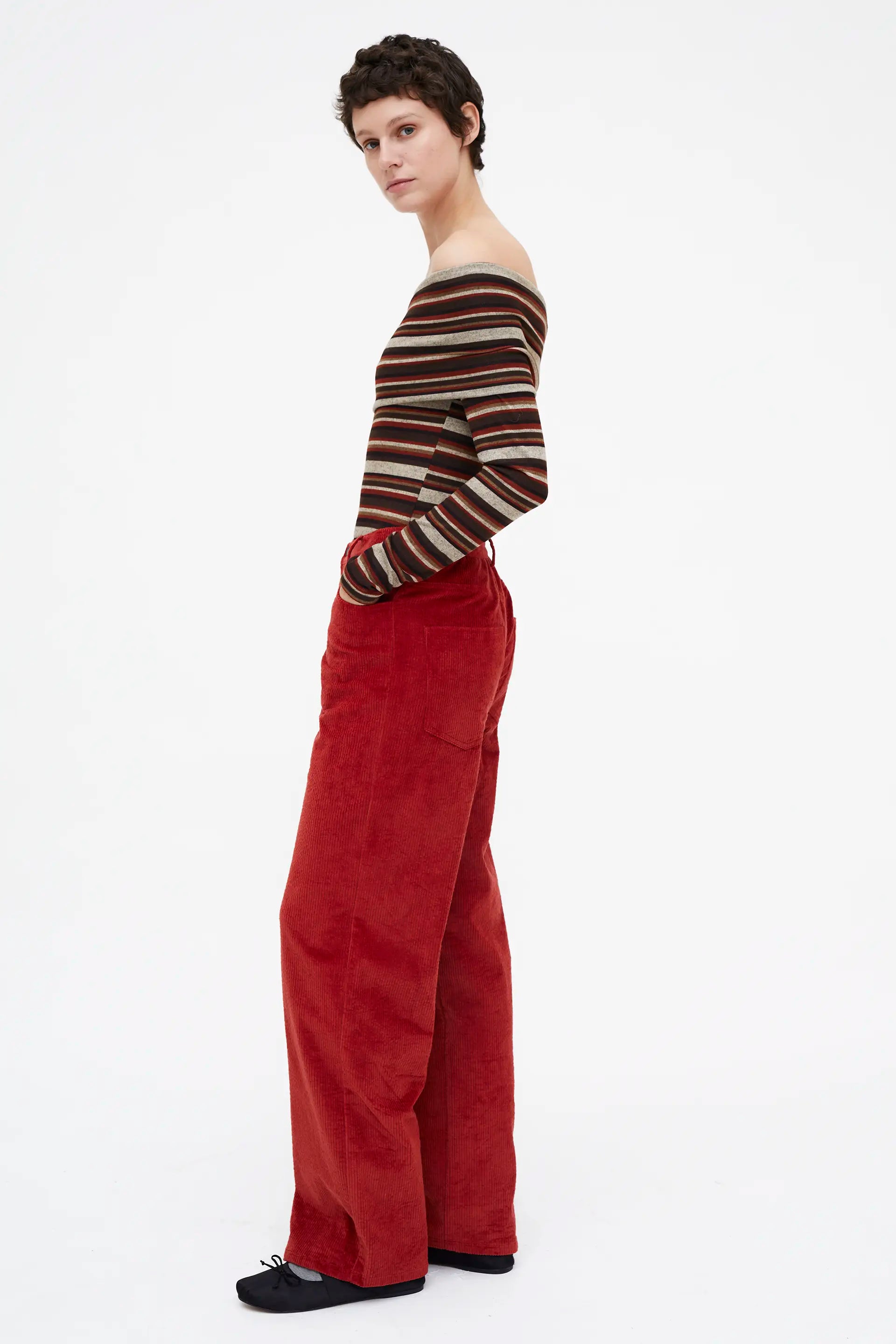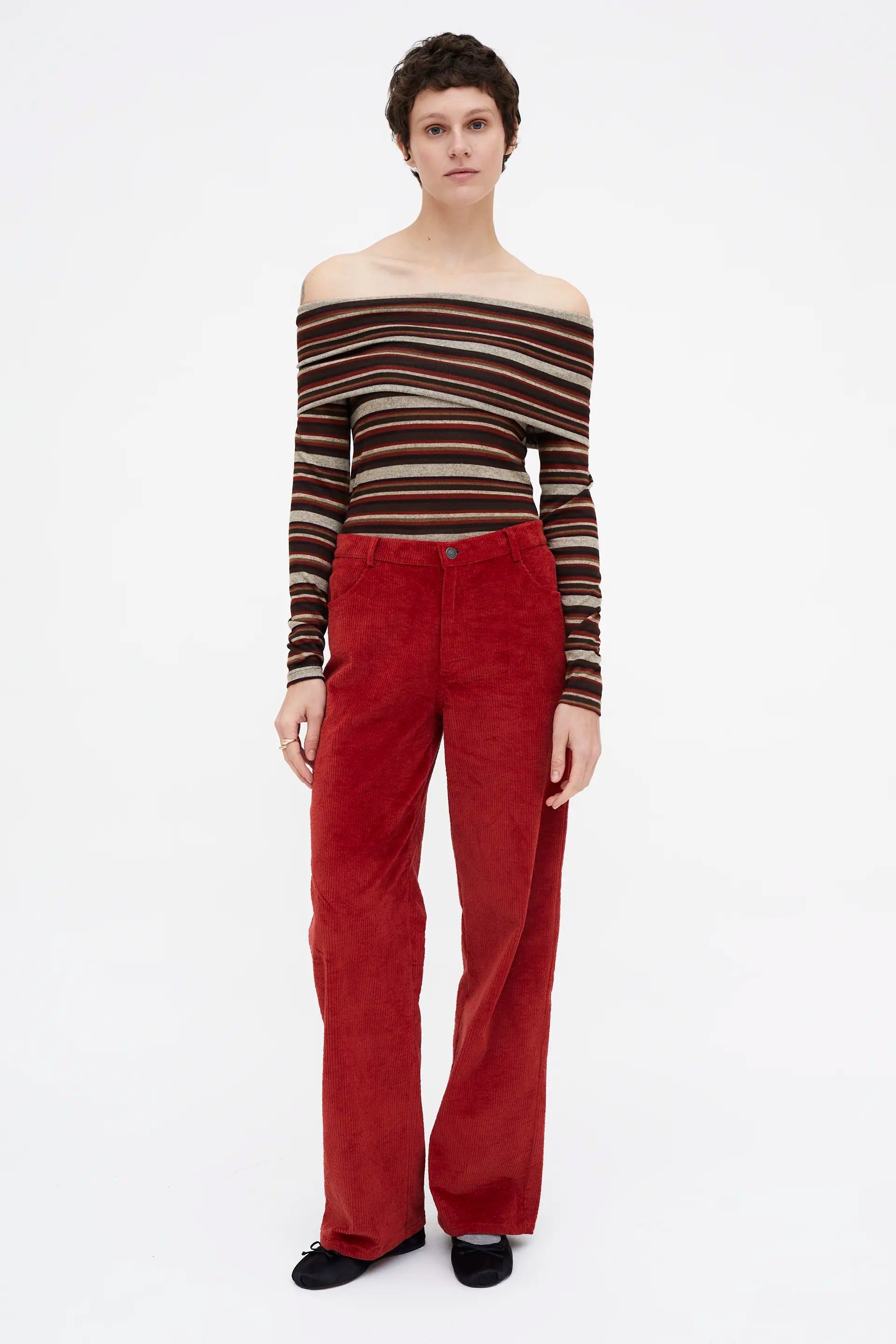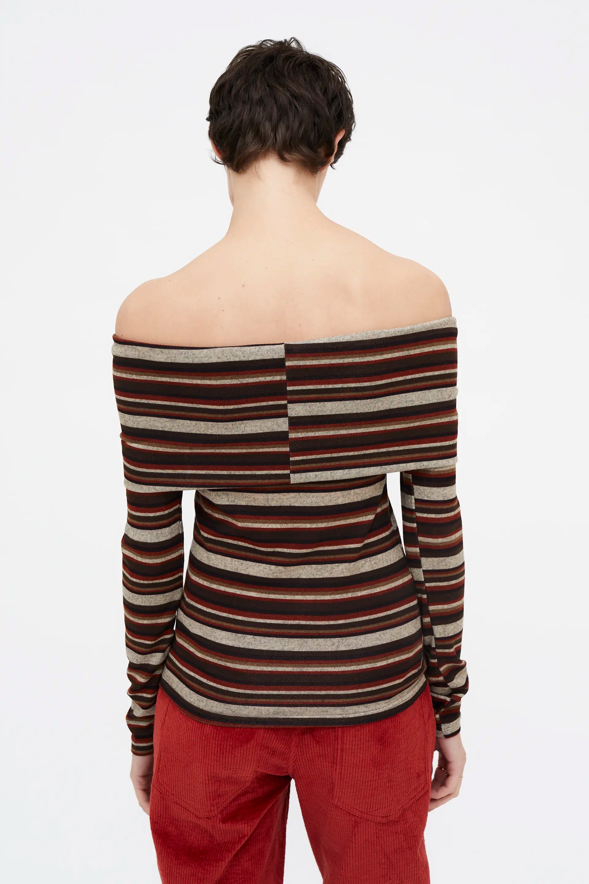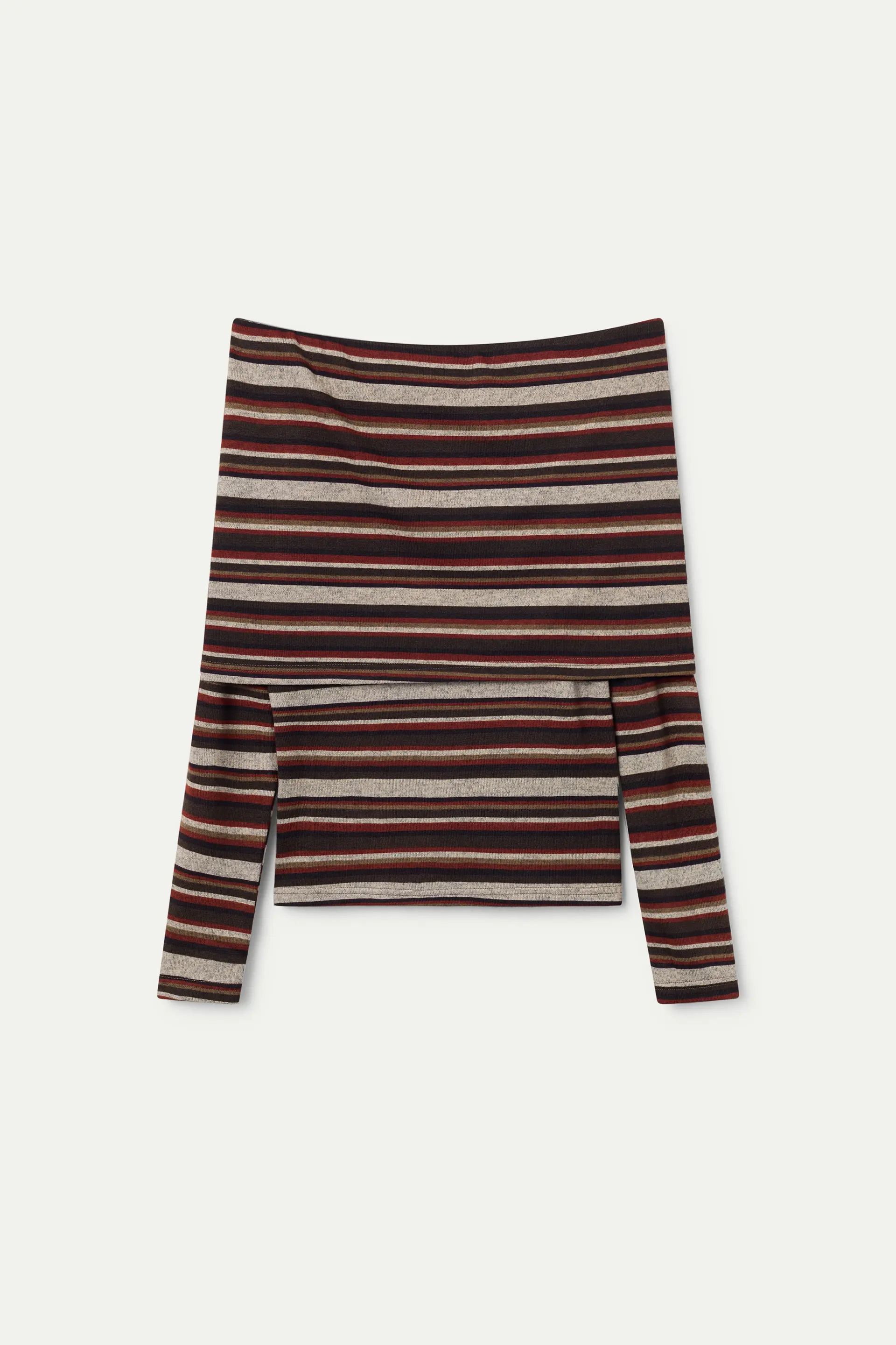 Top de rayas con tejido jersey multicolor. Escote palabra de honor en cuello y espalda con vuelta. Con manga larga.