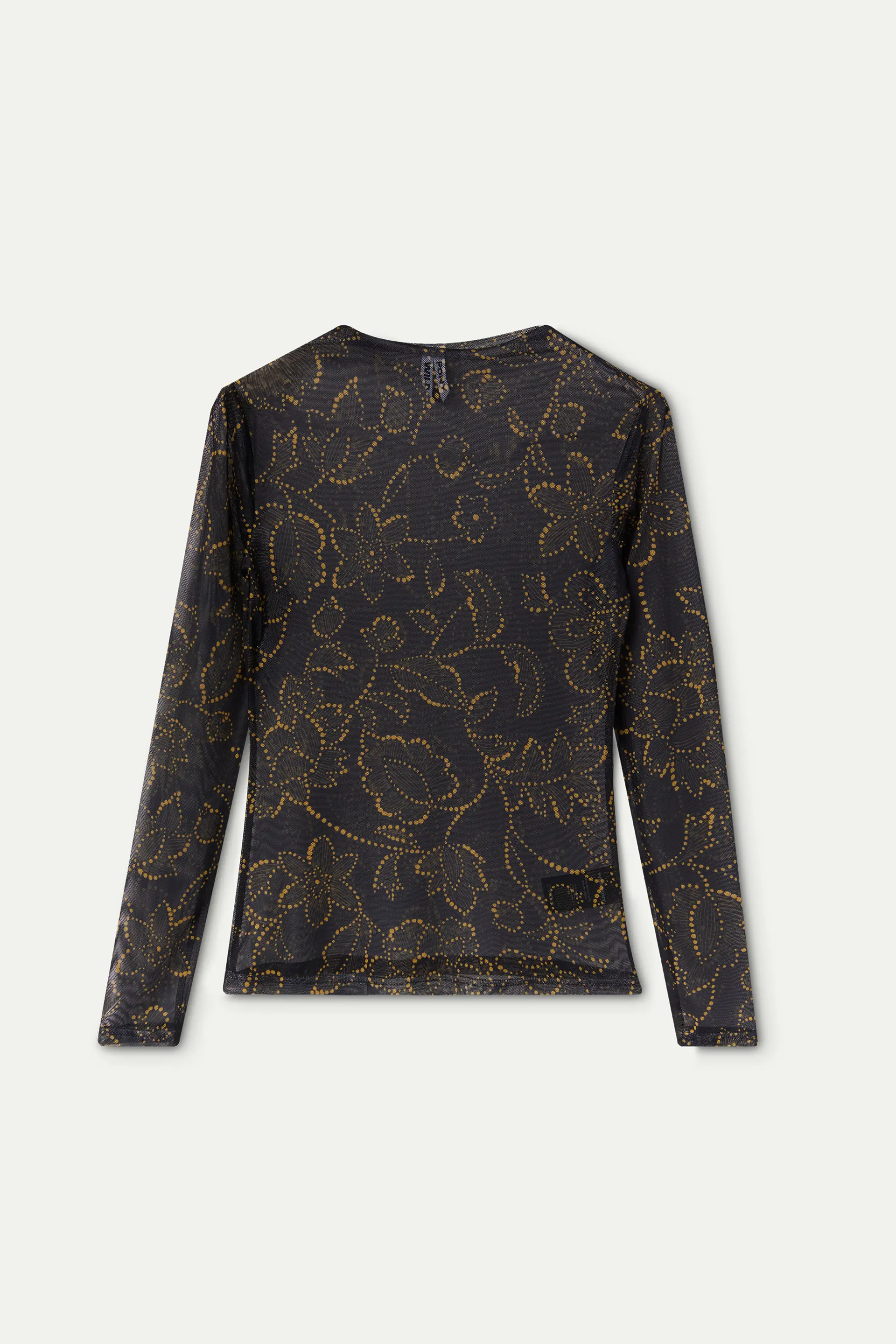 Top malla con estampado Mustard Flower. Cuello barco y manga larga.
