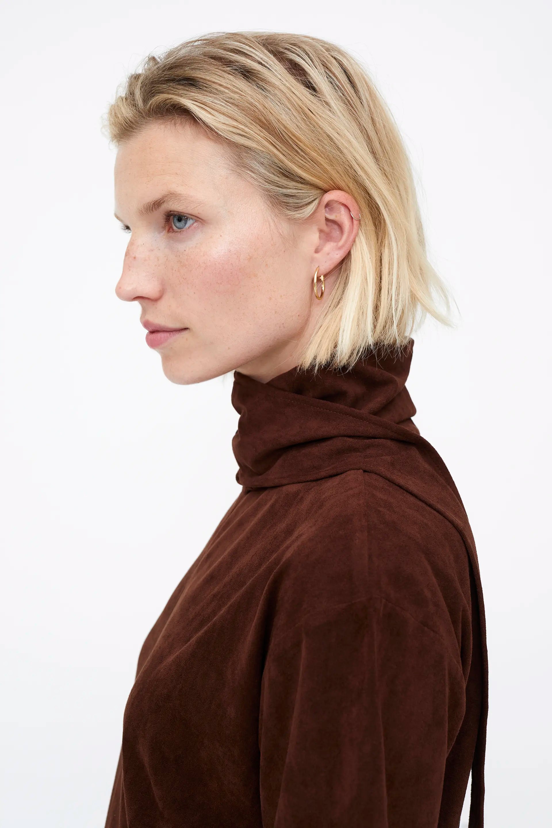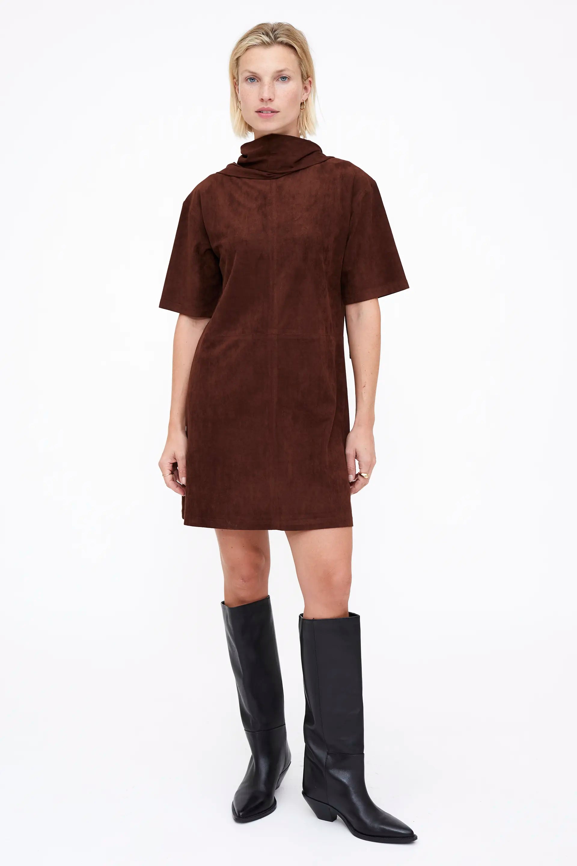 Vestido corto ante marrón. Con cuello alto nudado y hombro ligeramente caído. Manga corta amplia.