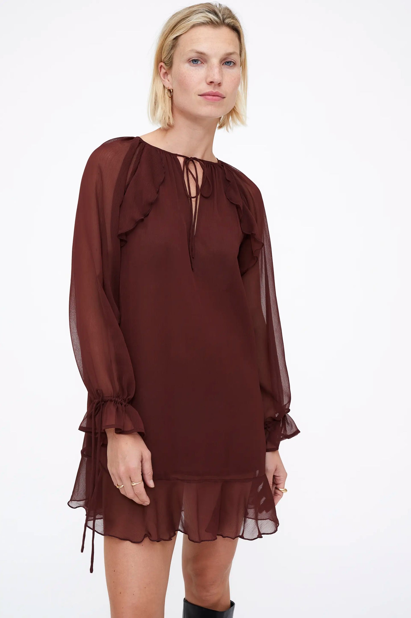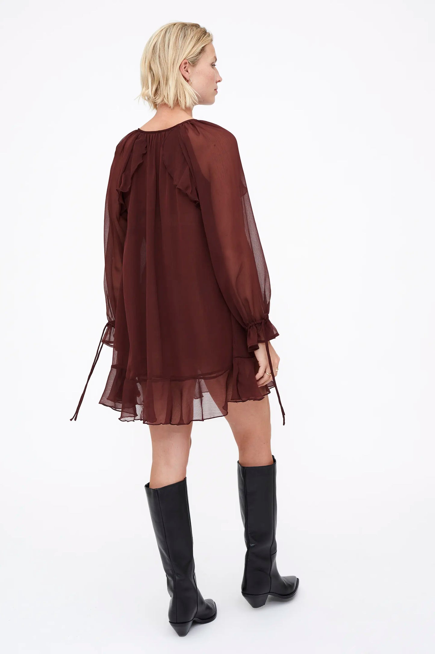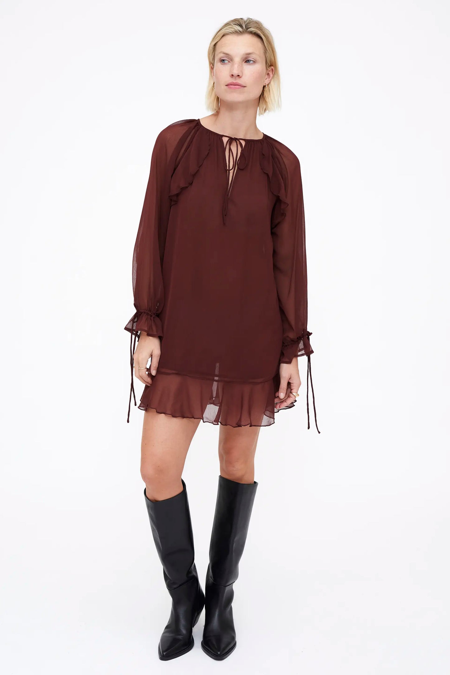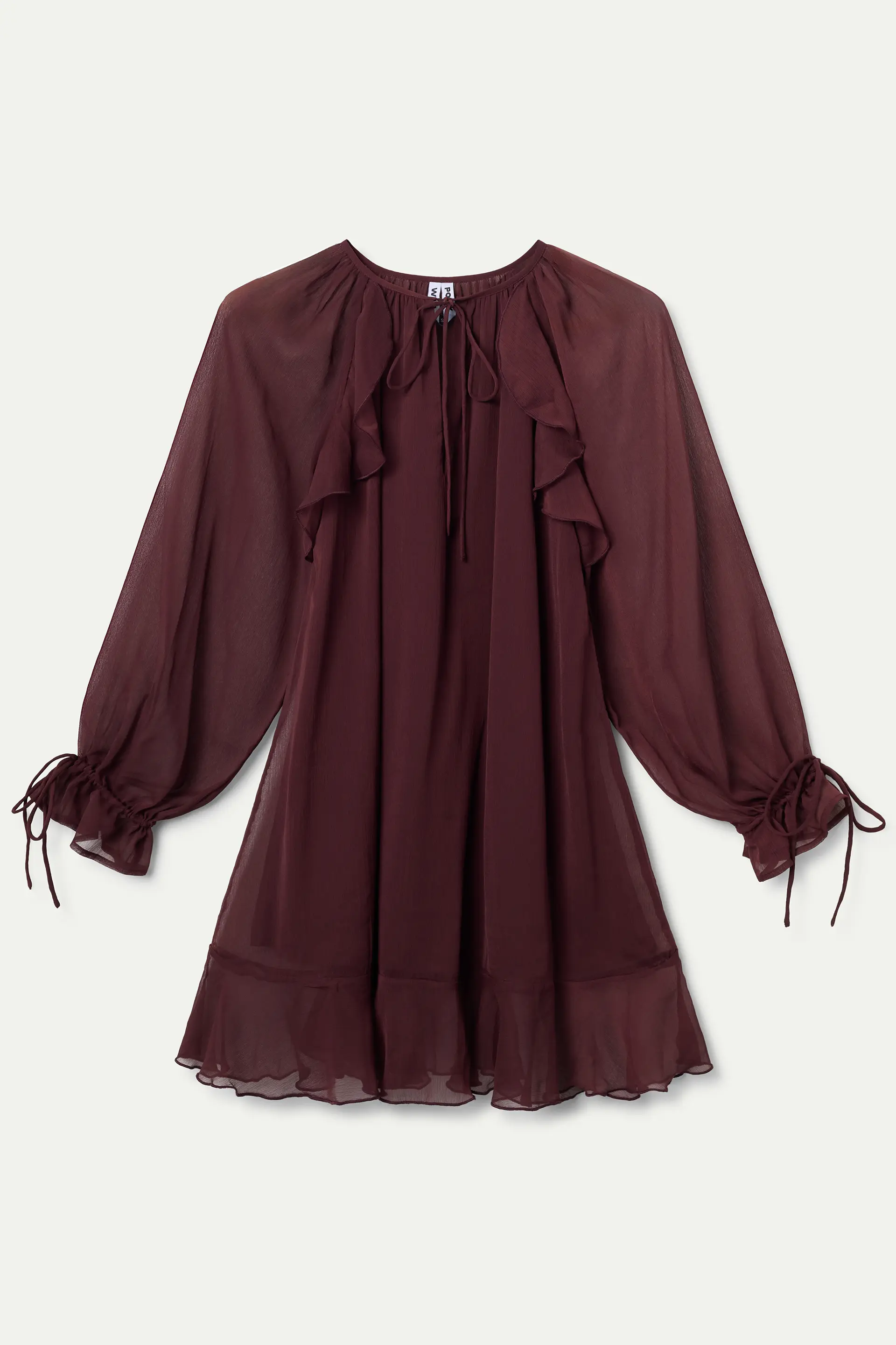 Vestido corto chiffon de color marrón. Cuello escote pico y anudado con volantes. Manga larga con detalles anudados en el puño. Forro interior.