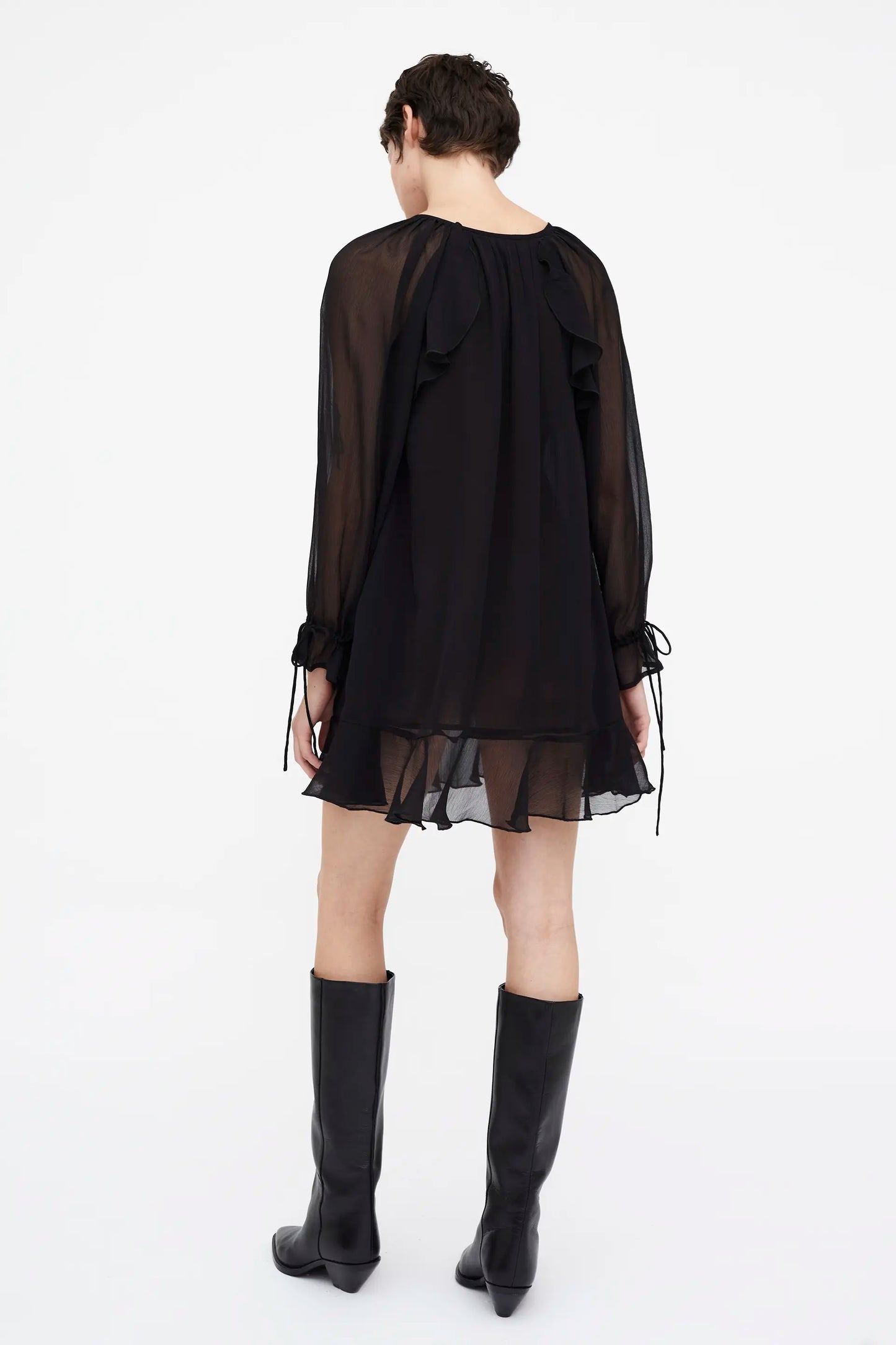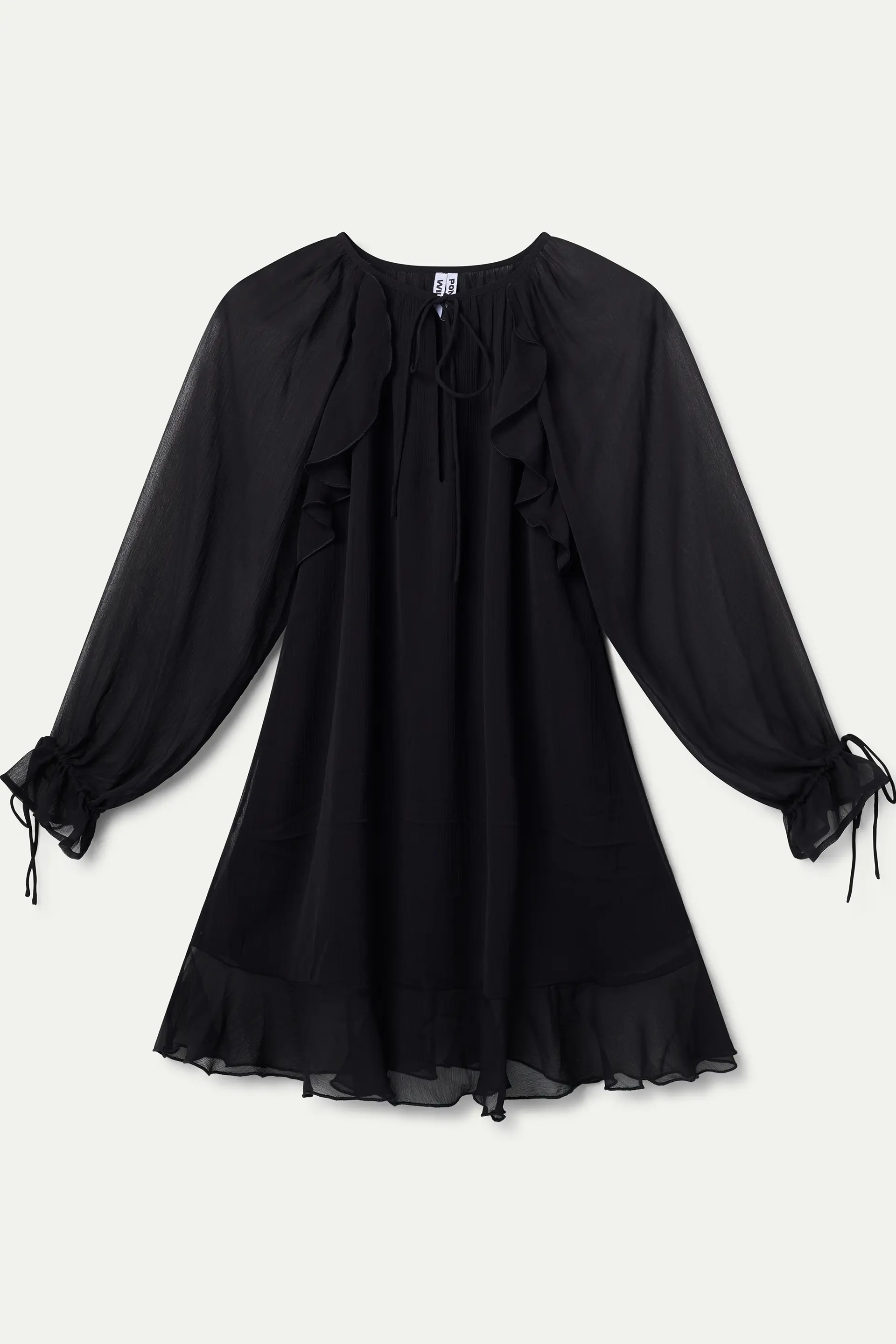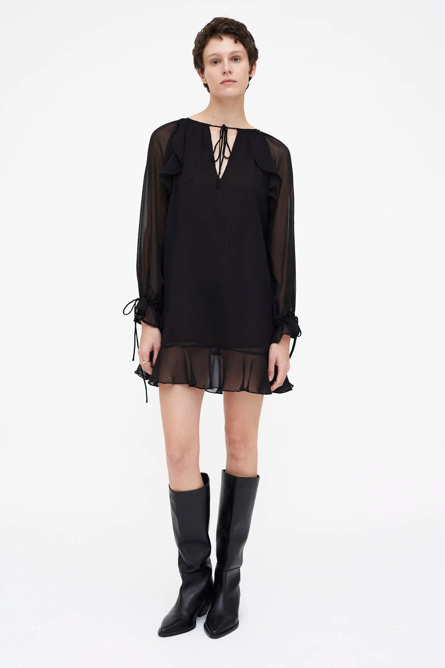 Vestido corto chiffon negro. Cuello barco con escote pico anudado. Manga larga terminada en puño con detalles anudados y volantes. Forro interior.