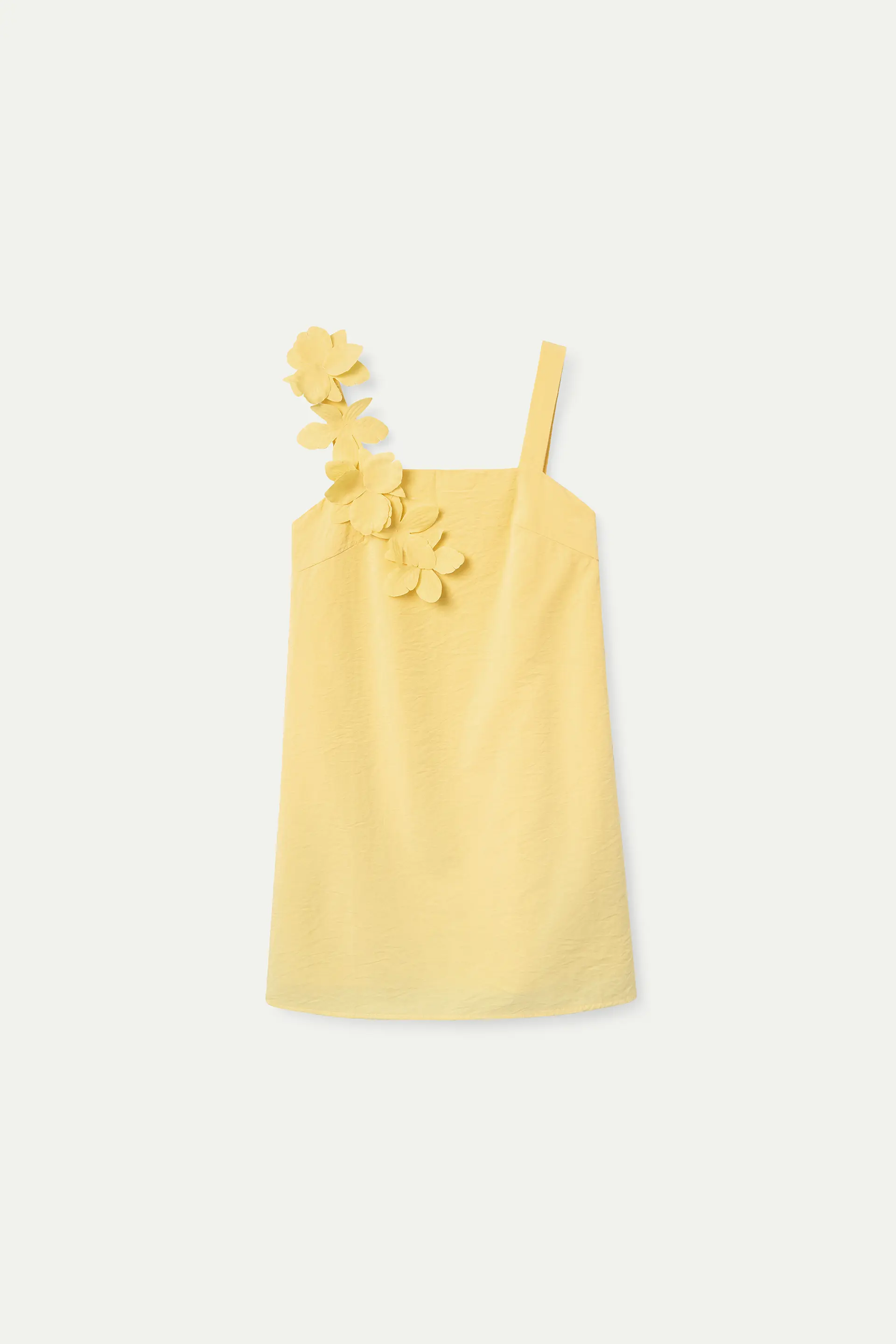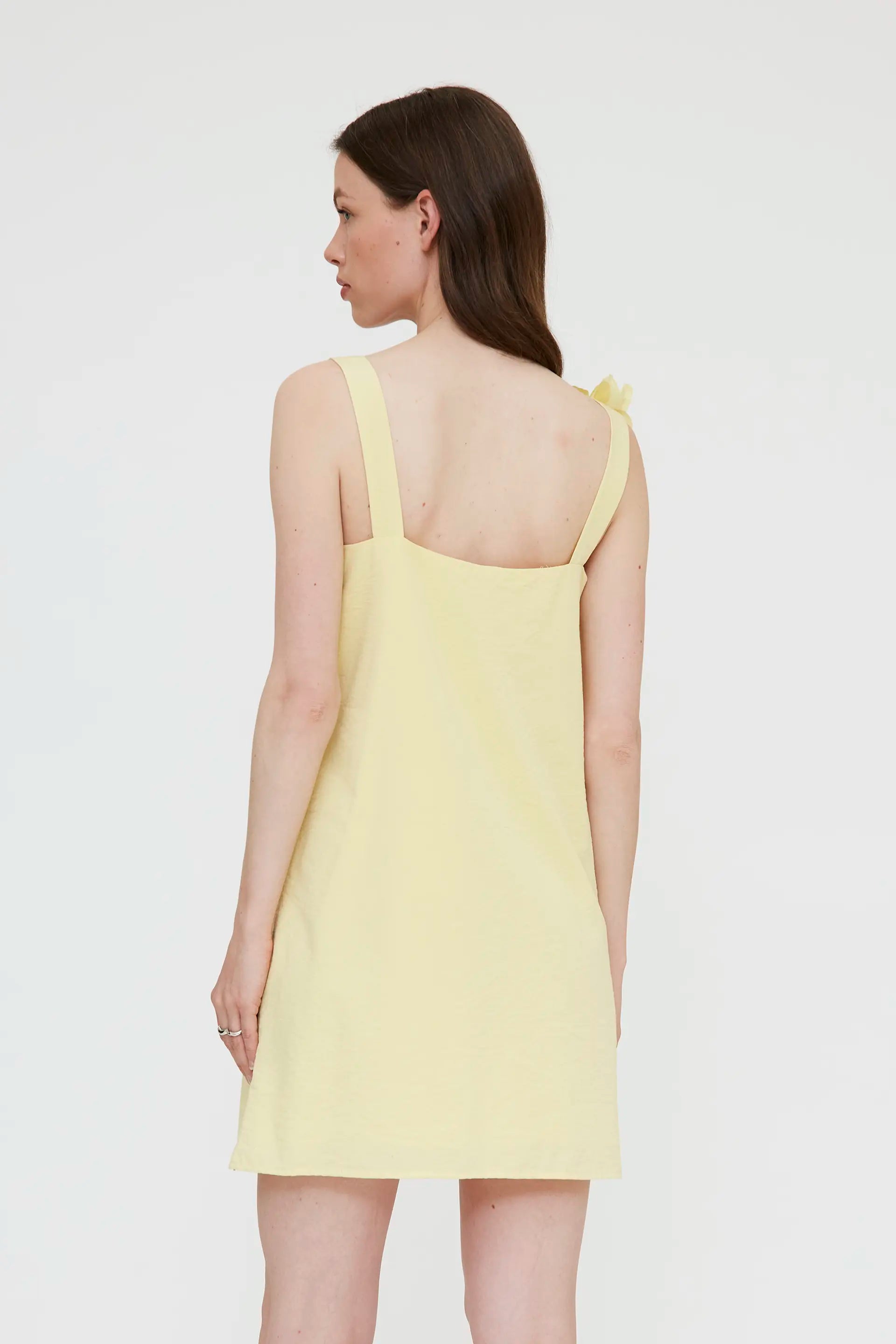 Vestido corto con tejido crepé de color amarillo. Con escote recto y tirantes gruesos con detalle floral. Forro interior. La modelo mide 178 cm y lleva la talla S.