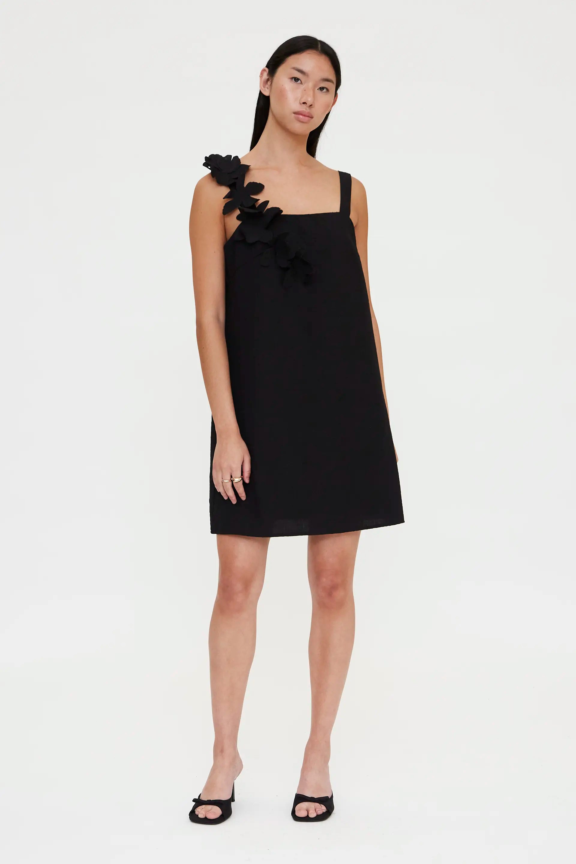Vestido corto con tejido crepé de color negro. Con escote recto y tirantes gruesos con detalle floral. Forro interior. La modelo mide 173 cm y lleva la talla S.