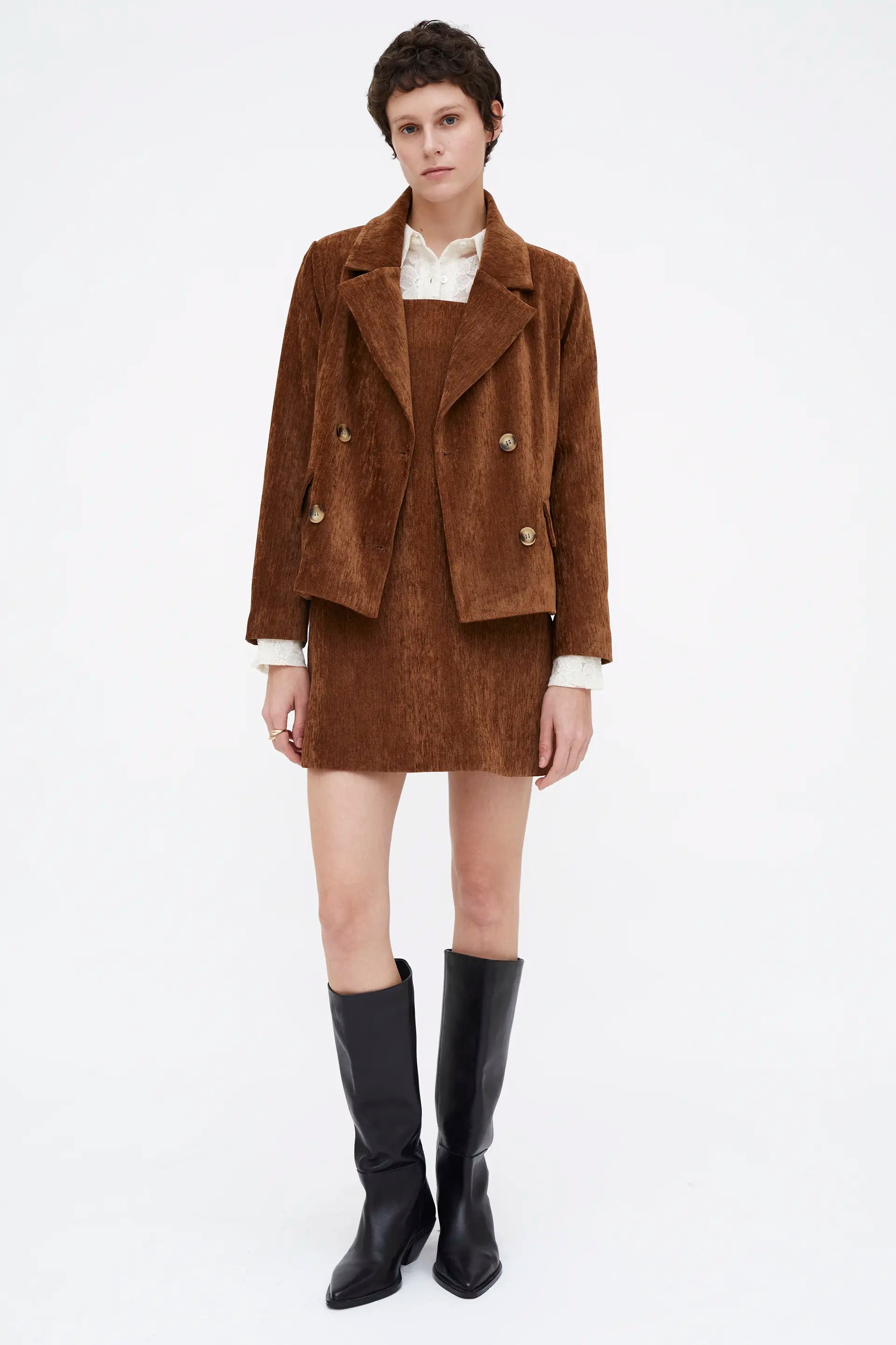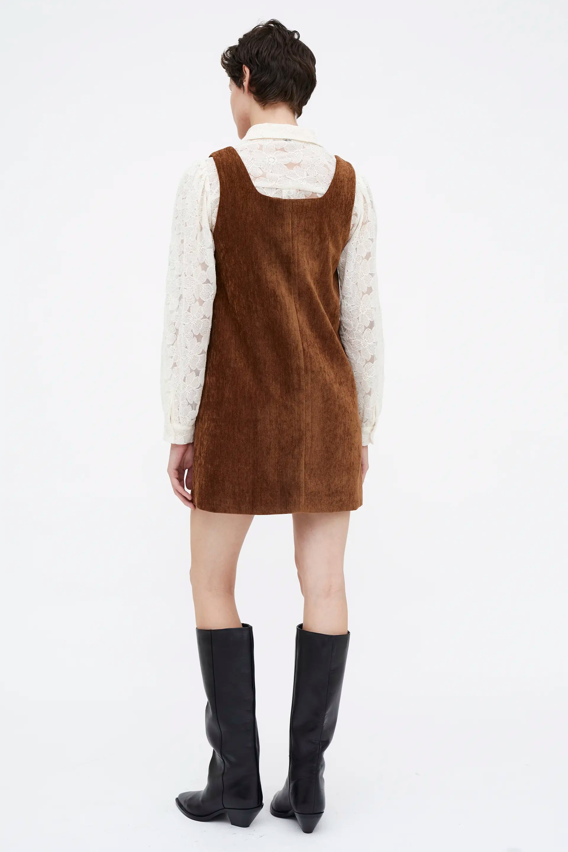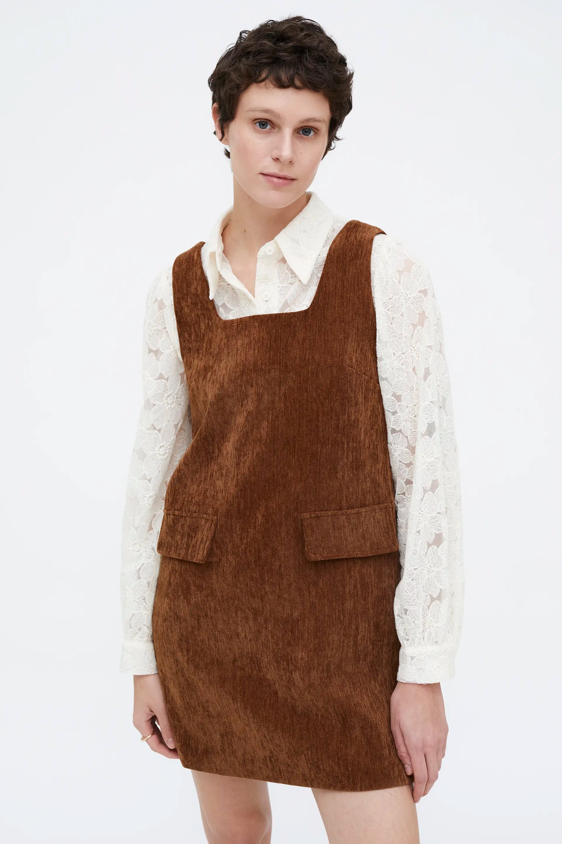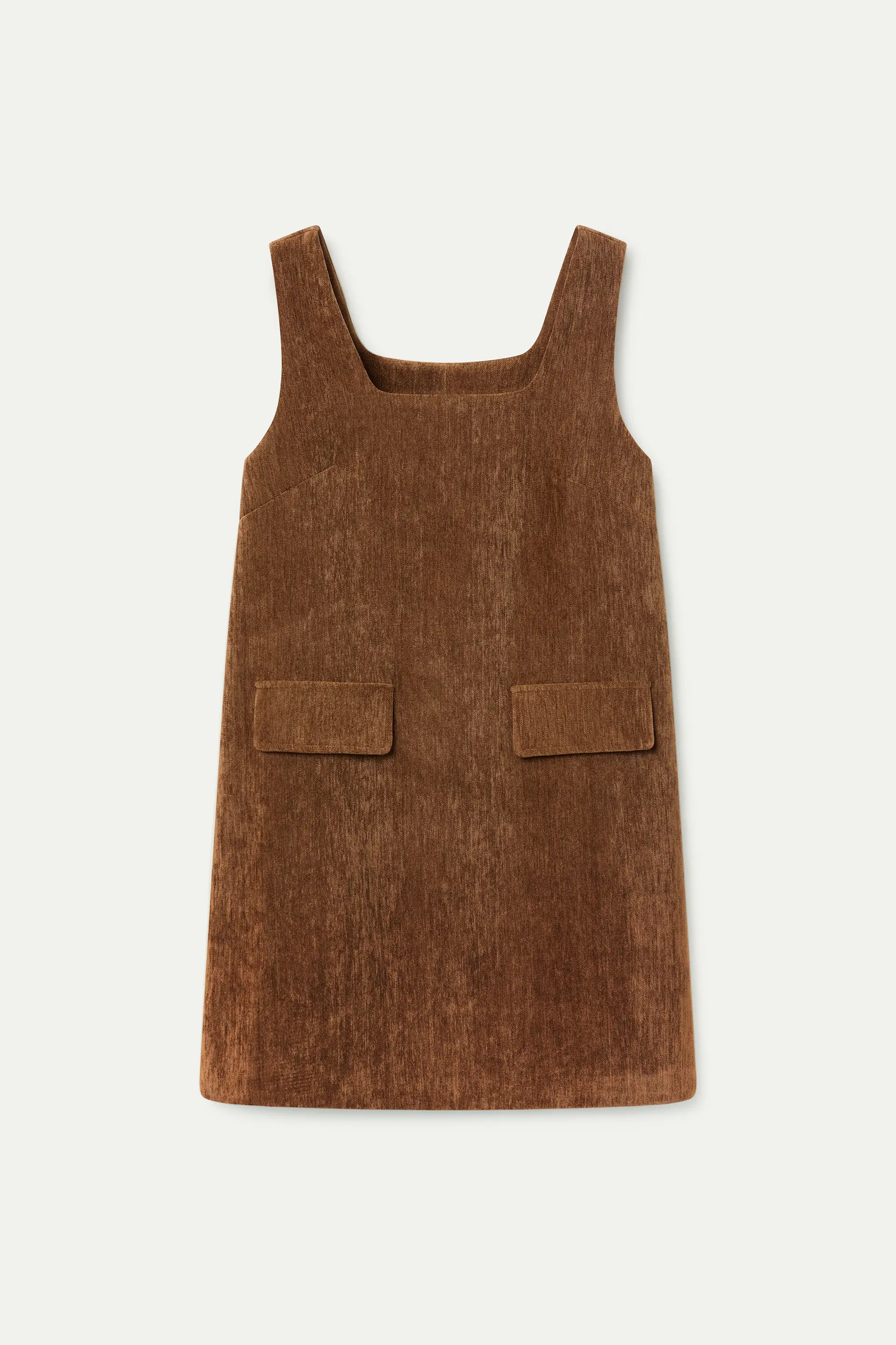 Vestido corto efecto aterciopelado de color marrón. Diseño sin mangas. Bolsillos laterales decorativos.
