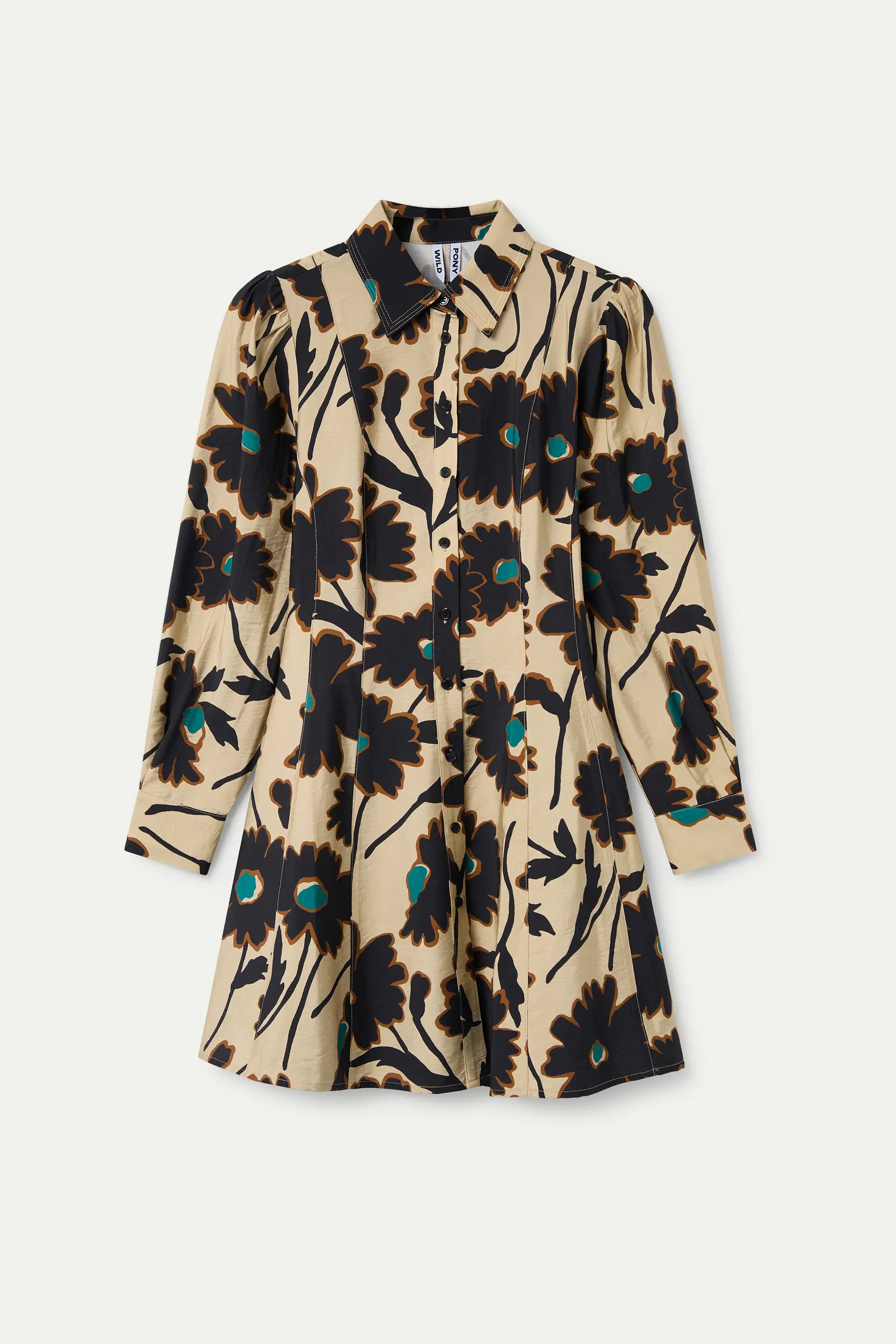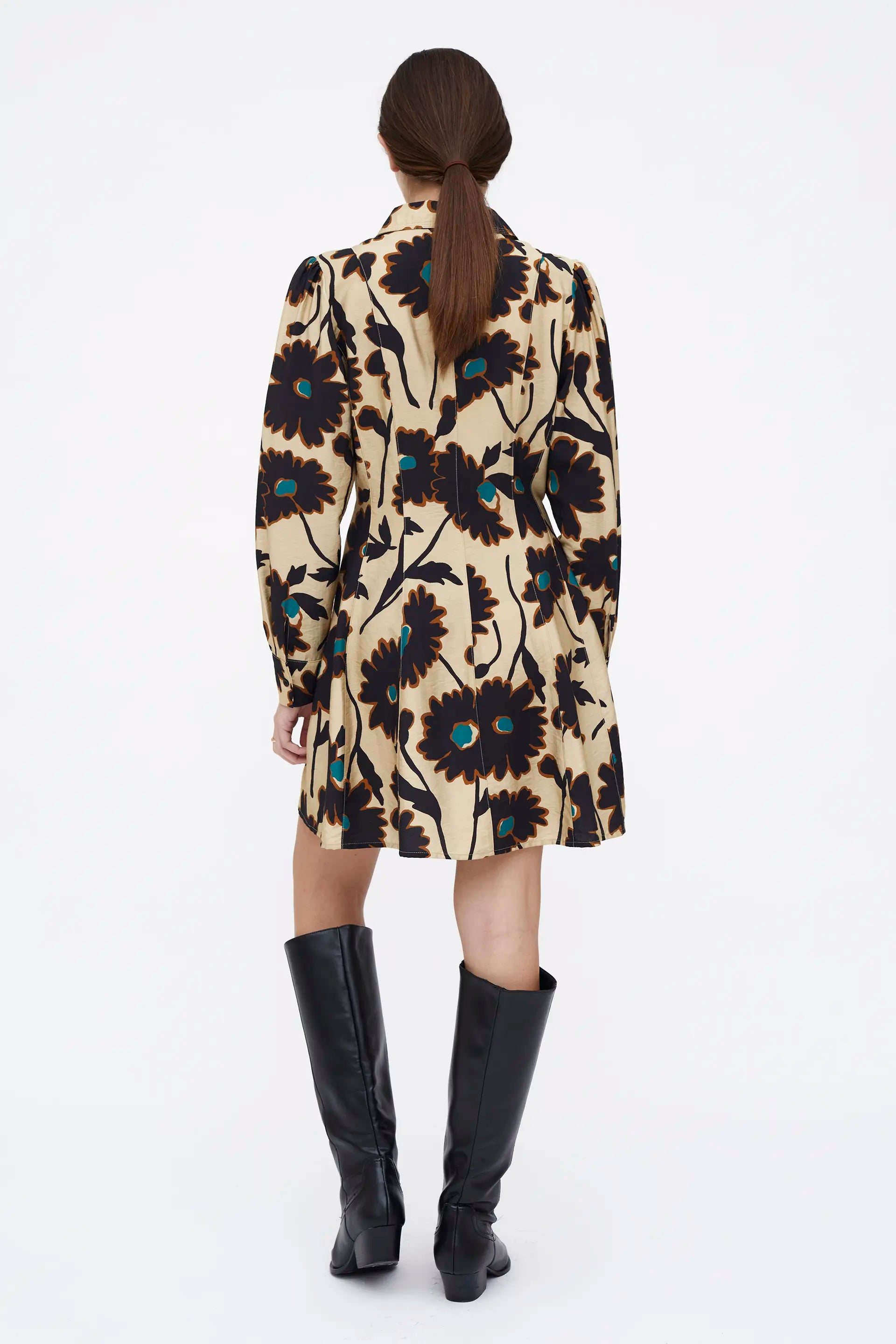 Vestido corto floral con estampado Giardina. Con cuello solapa y manga larga terminada en puño doble botón. Cierre frontal con botones.