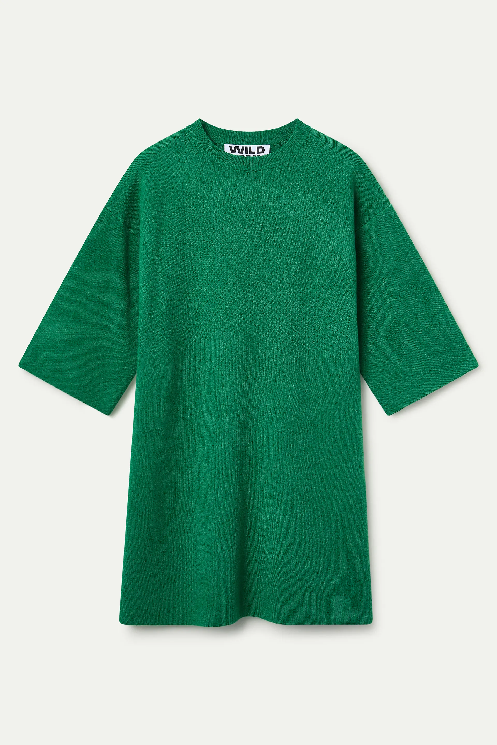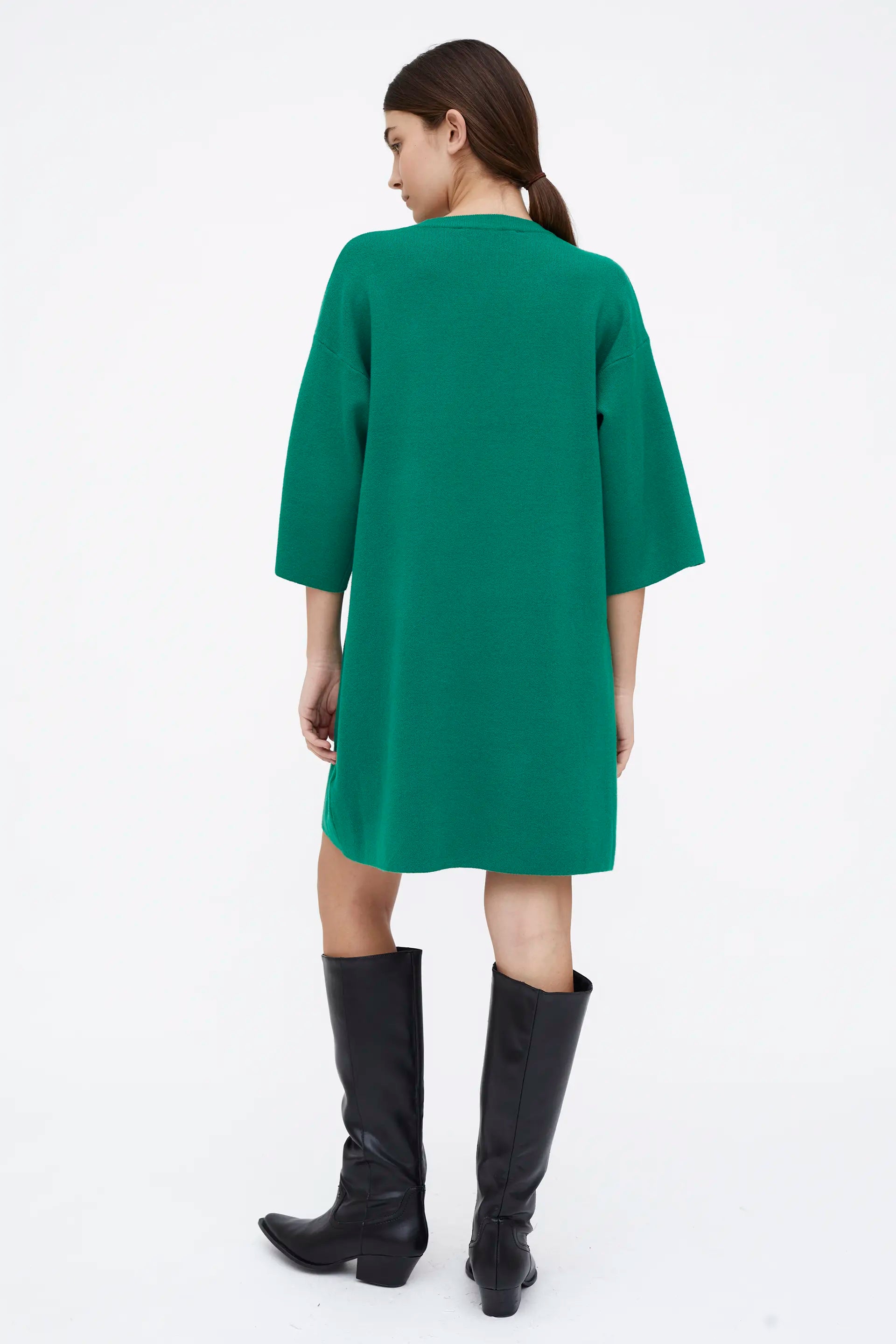 Vestido corto punto de color verde. Cuello redondo y manga larga amplia francesa con hombro caído.