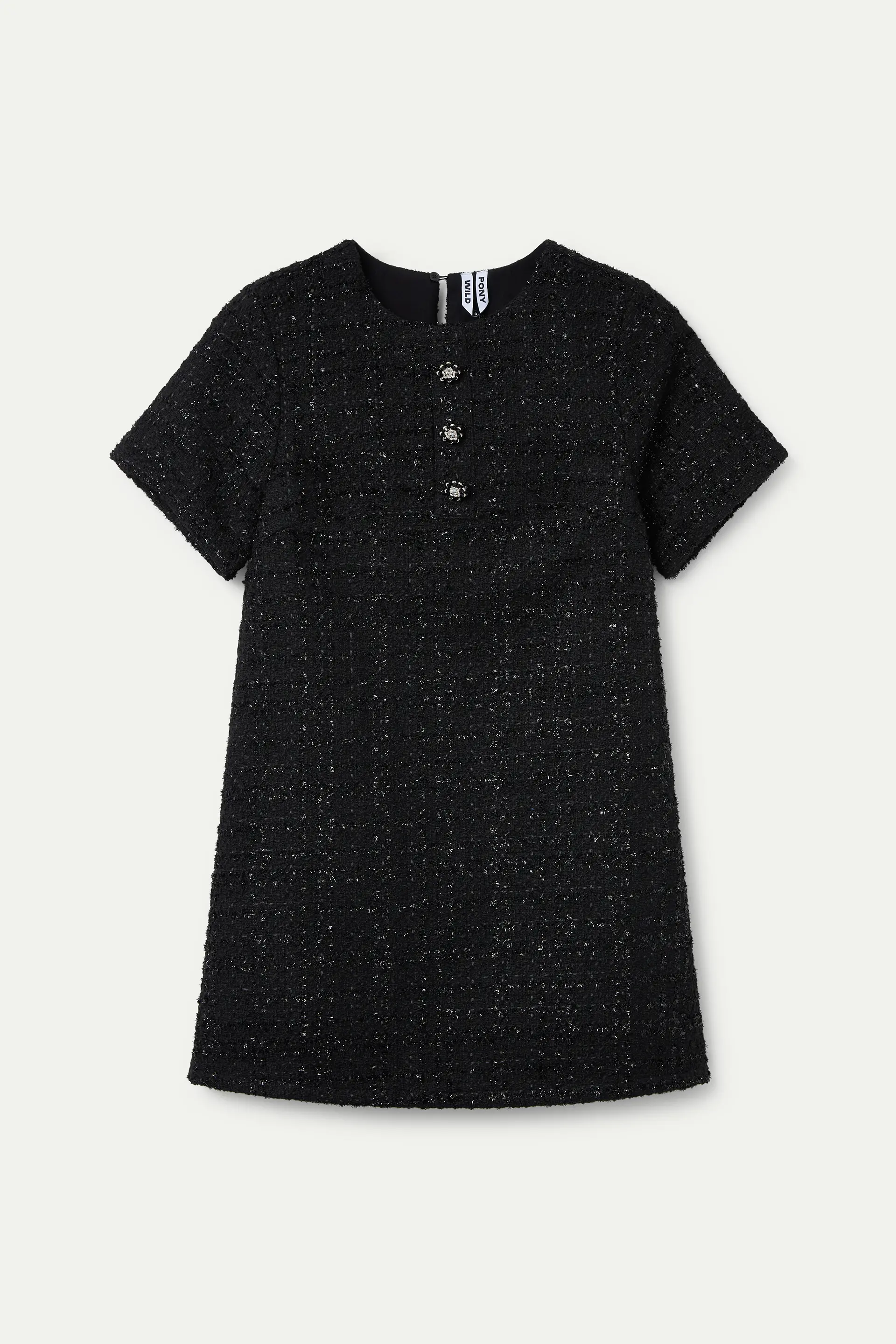 Vestido corto en tejido tweed color negro. Cuello redondo, con detalle frontal decorativo en joya. Diseño de manga corta amplia.
