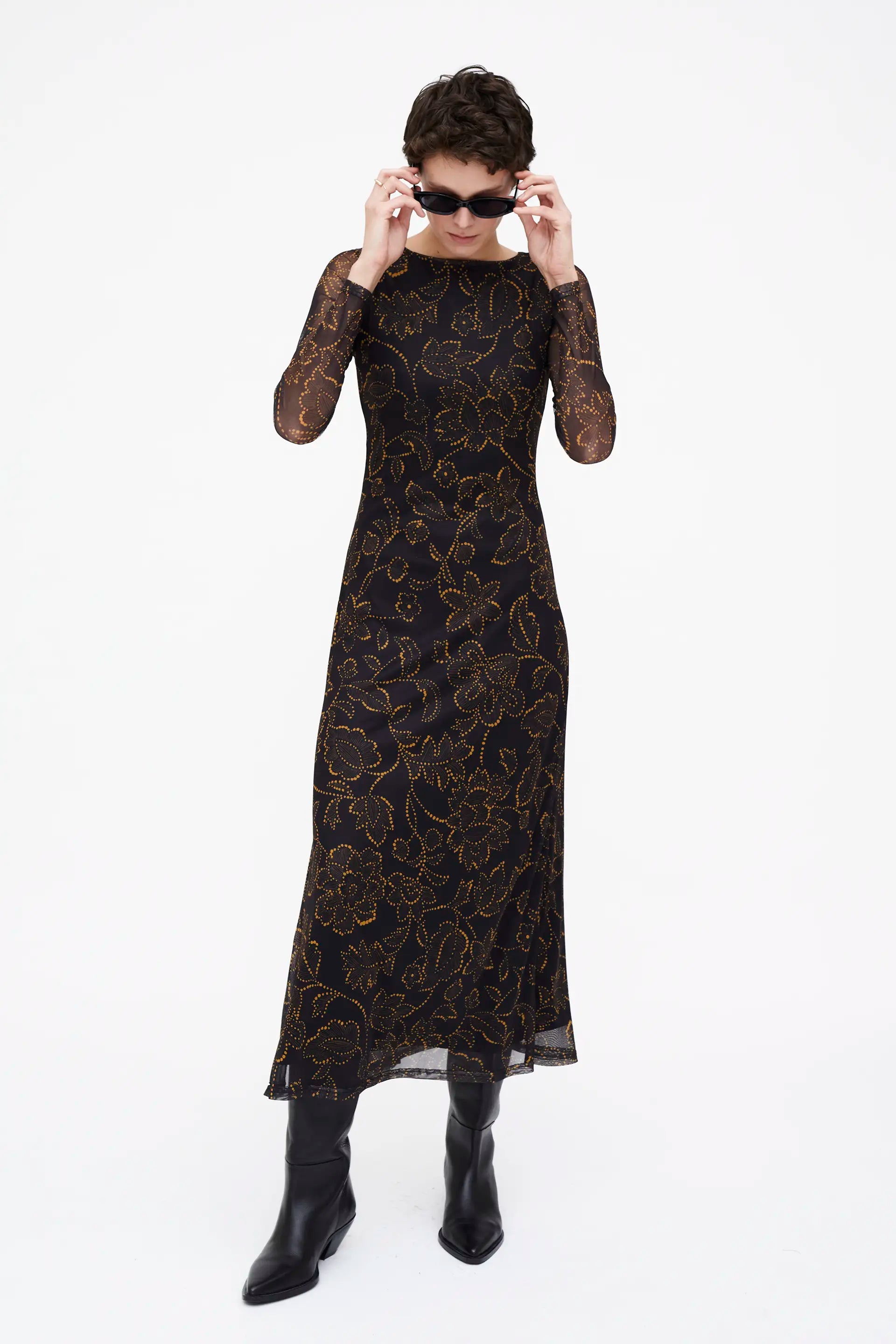 Vestido largo estampado Mustard Flower. Con cuello barco y manga larga. Forro interior.