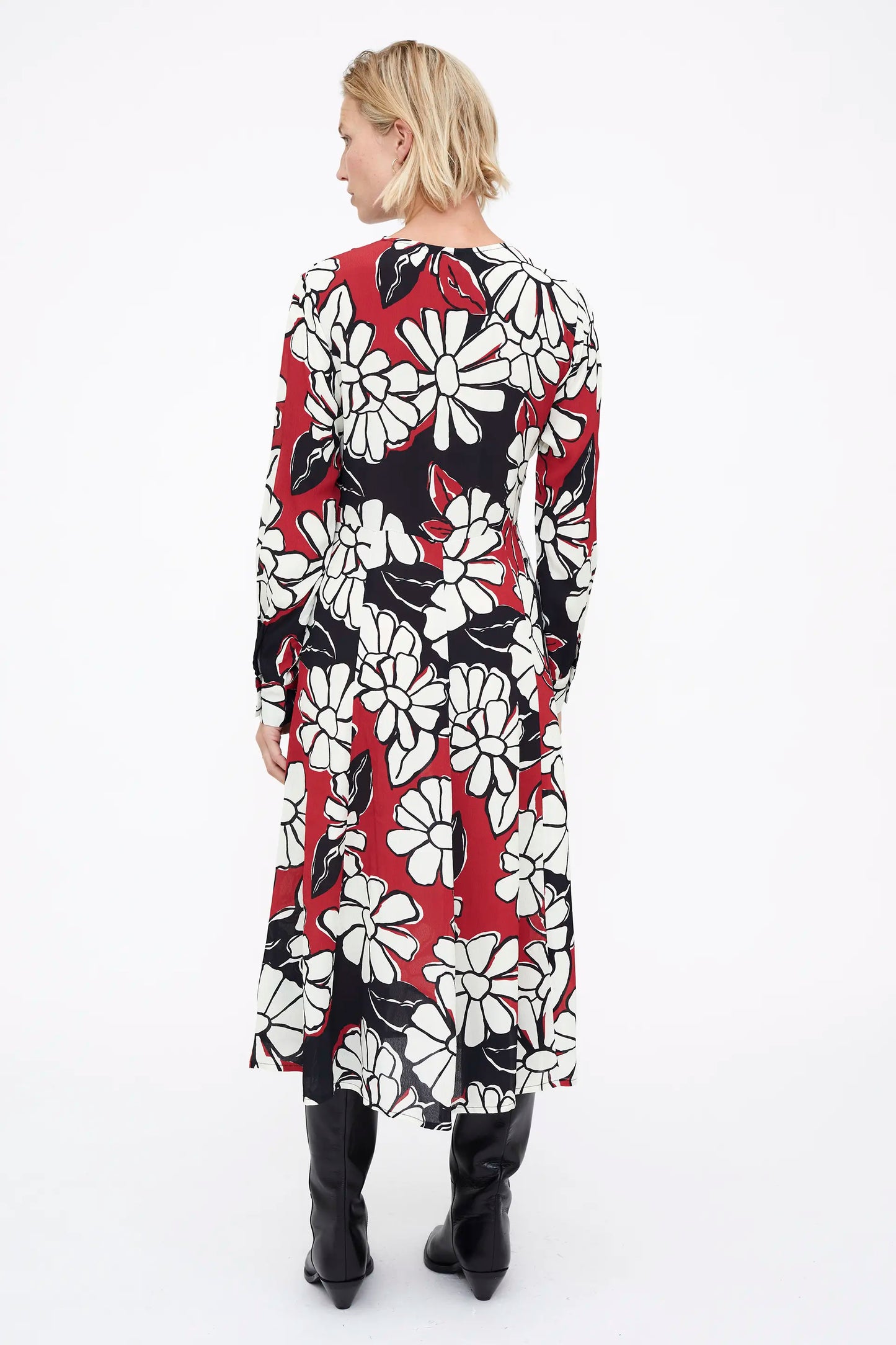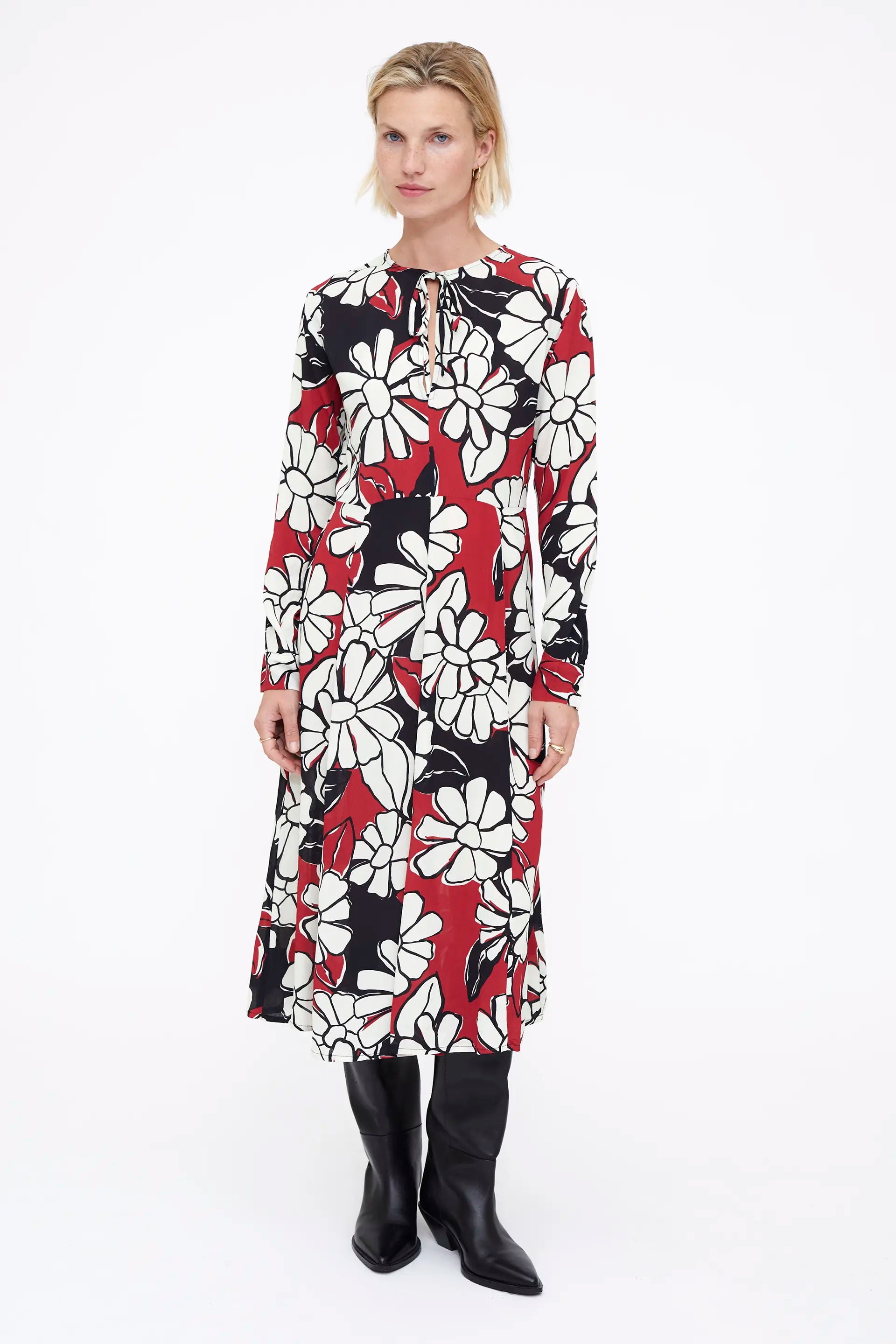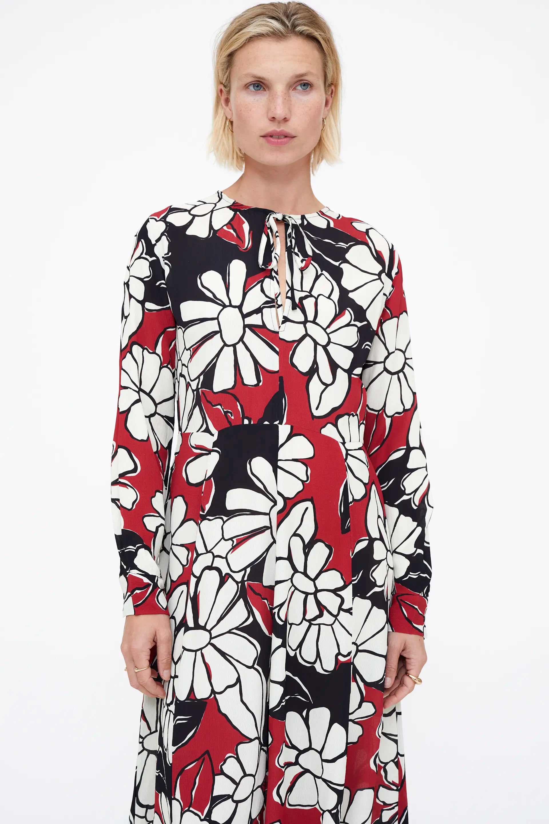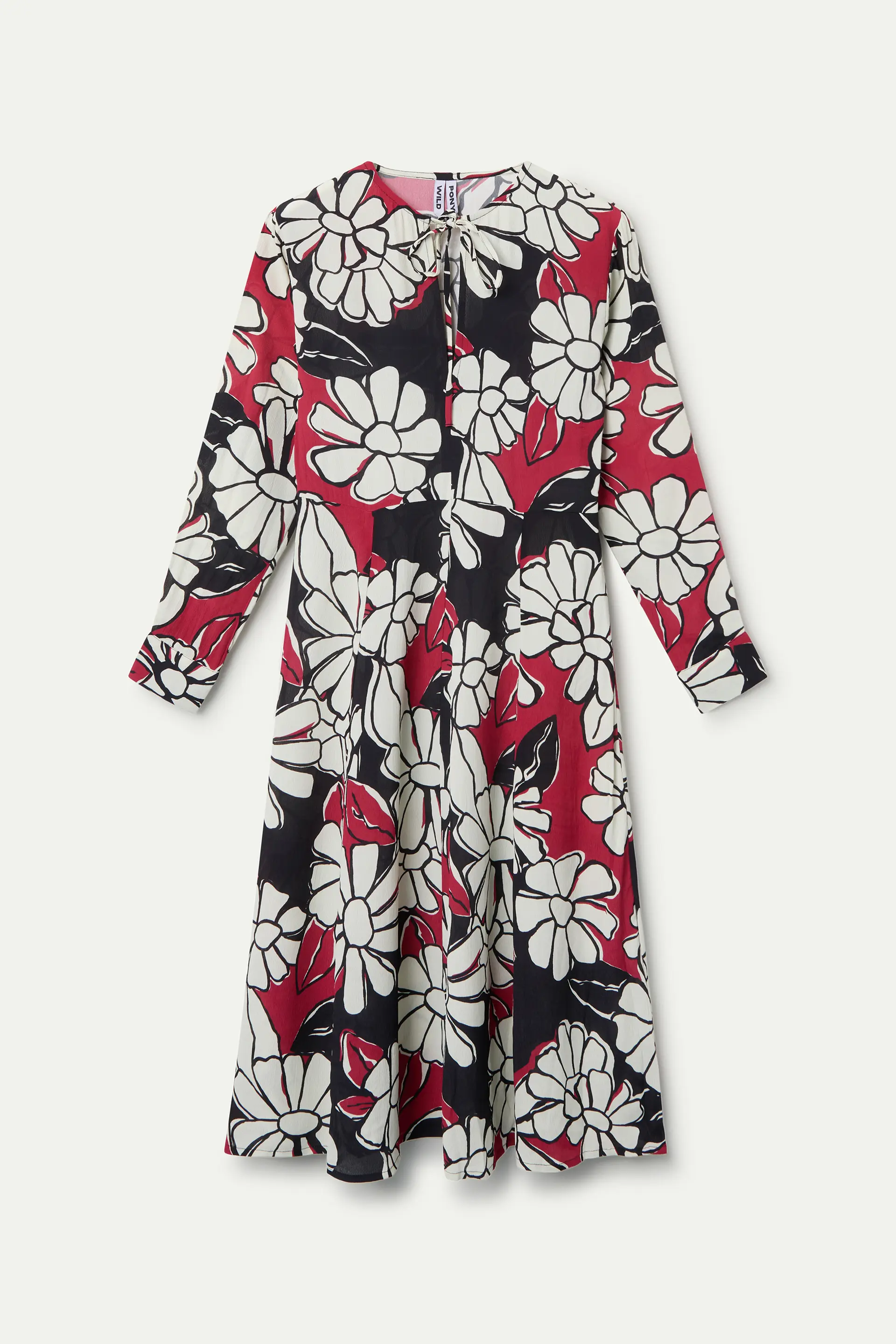 Vestido Midi con estampado Blooming Sunset. Cuello redondo con escote pico anudado y manga larga. Modelo fluido. Cremallera invisible lateral.
