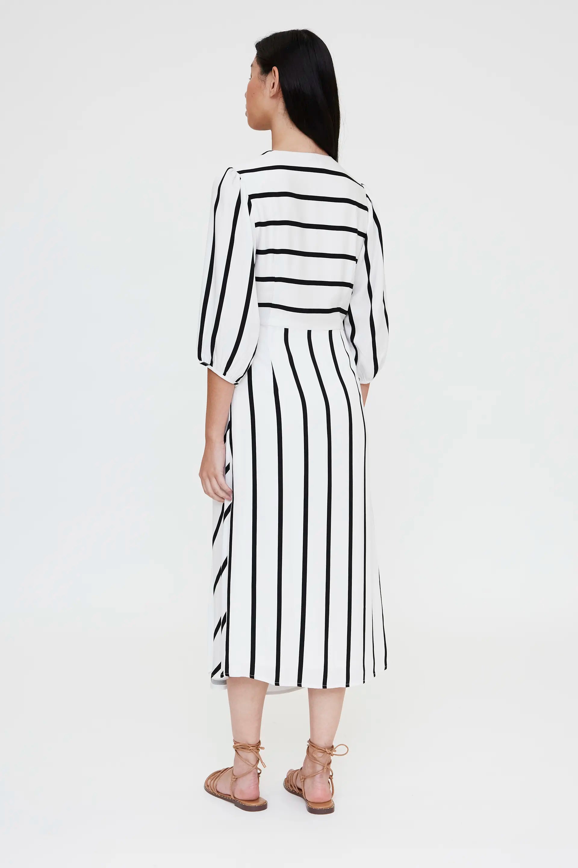 Vestido midi con estampado Grimaud White. Cuello con escote pico cruzado y mangas 3/4. Detalle anudado en la cintura. La modelo mide 173 cm y lleva la talla S.