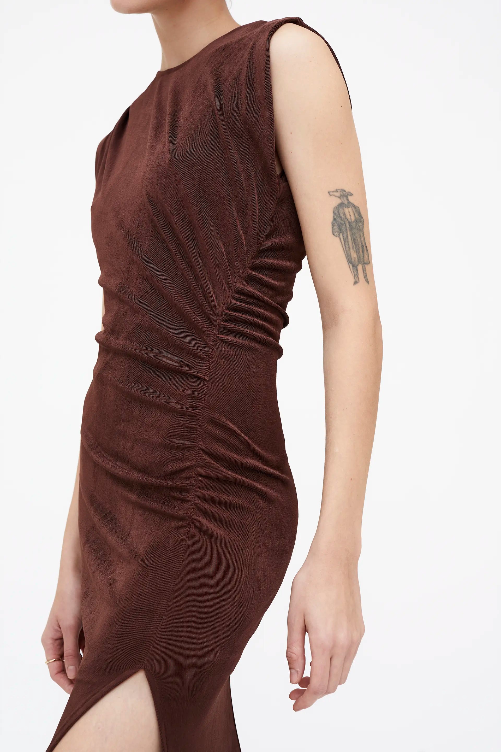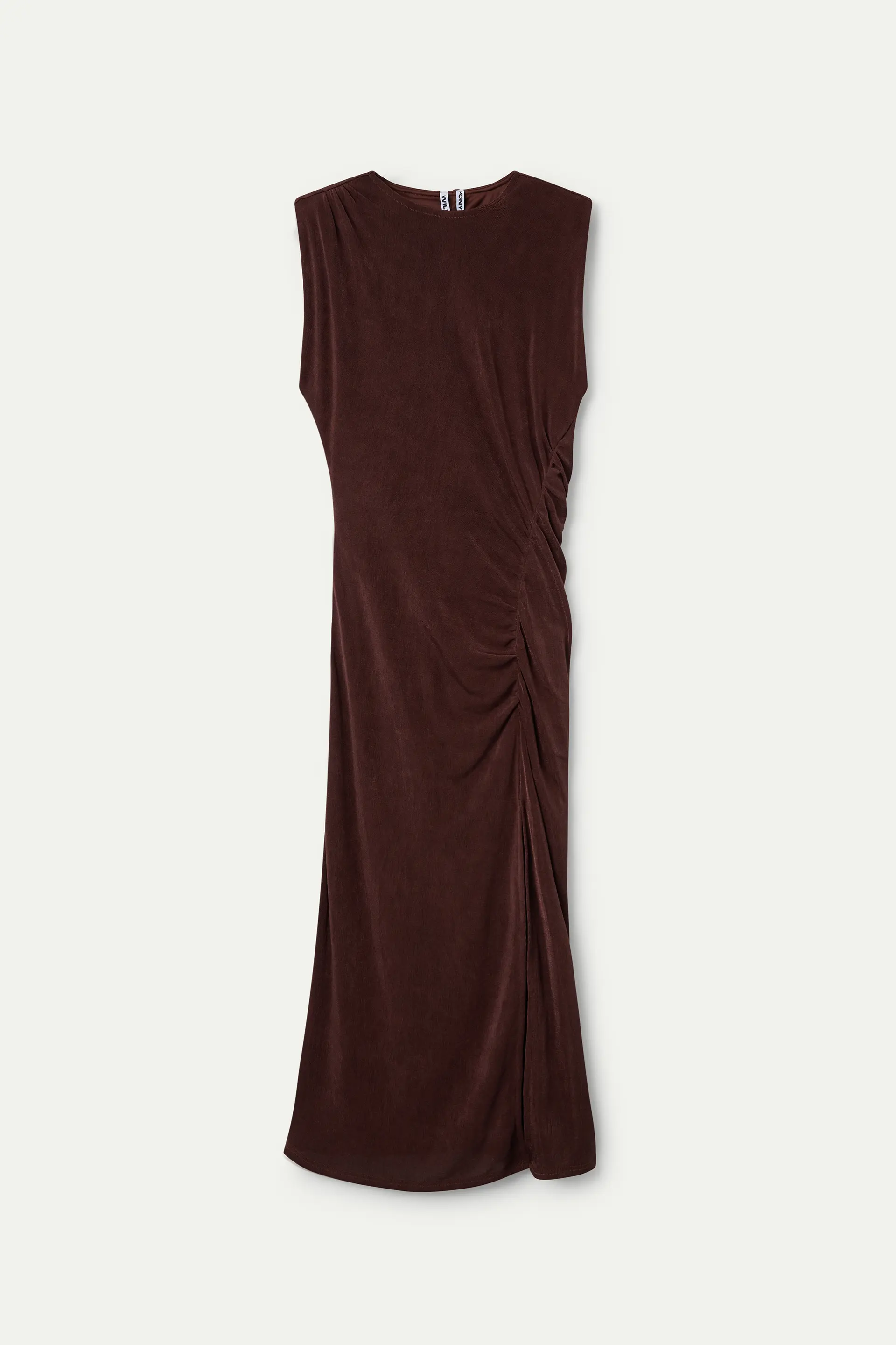 Vestido midi en color marrón, con fruncido lateral. Diseño sin mangas y ligera abertura en el lateral.
