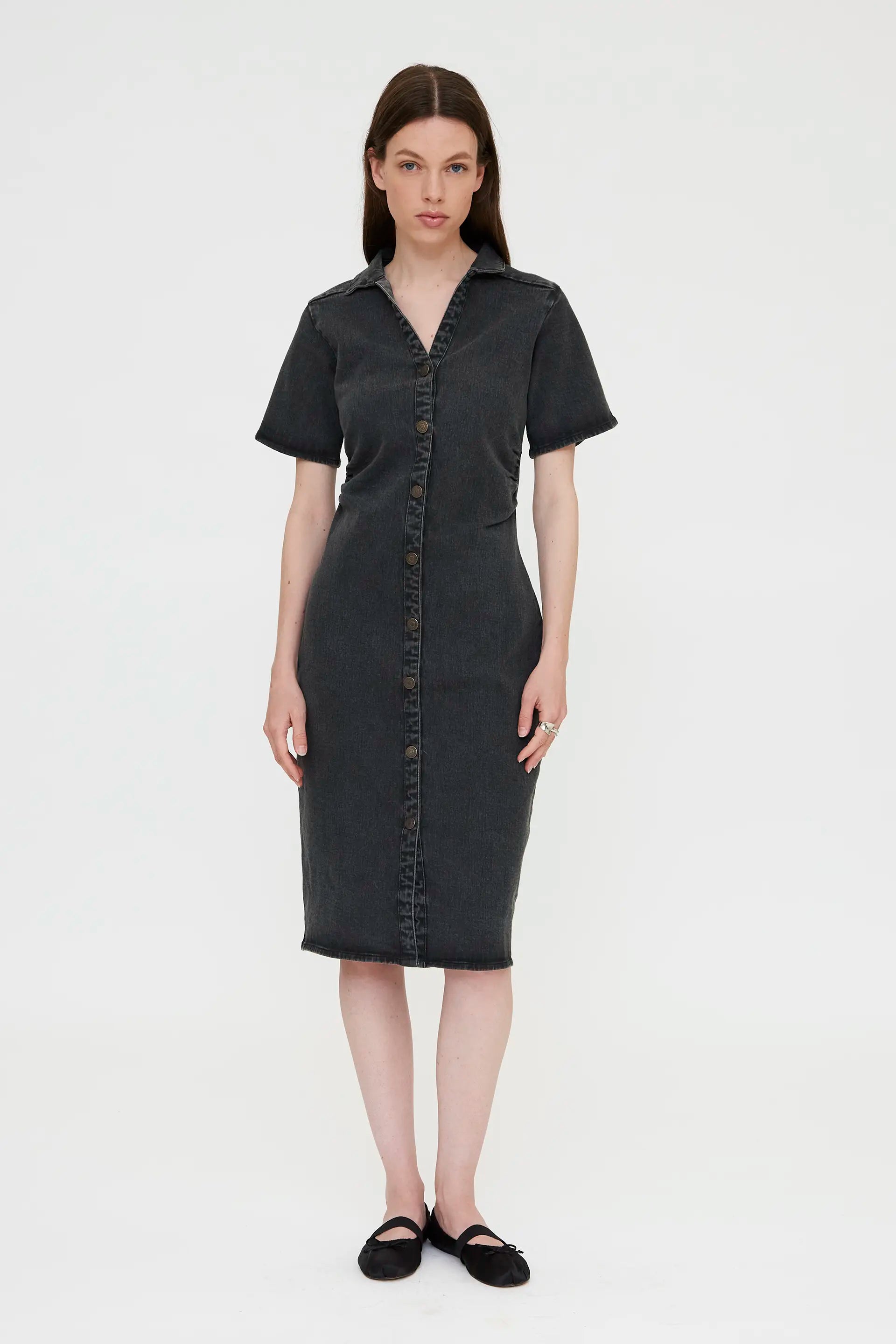 Vestido midi con tejido vaquero de color negro. Cuello solapa y escote pico. Manga corta. Cierre frontal con botones. Detalle plisado en cintura. La modelo mide 173 cm y lleva la talla S.